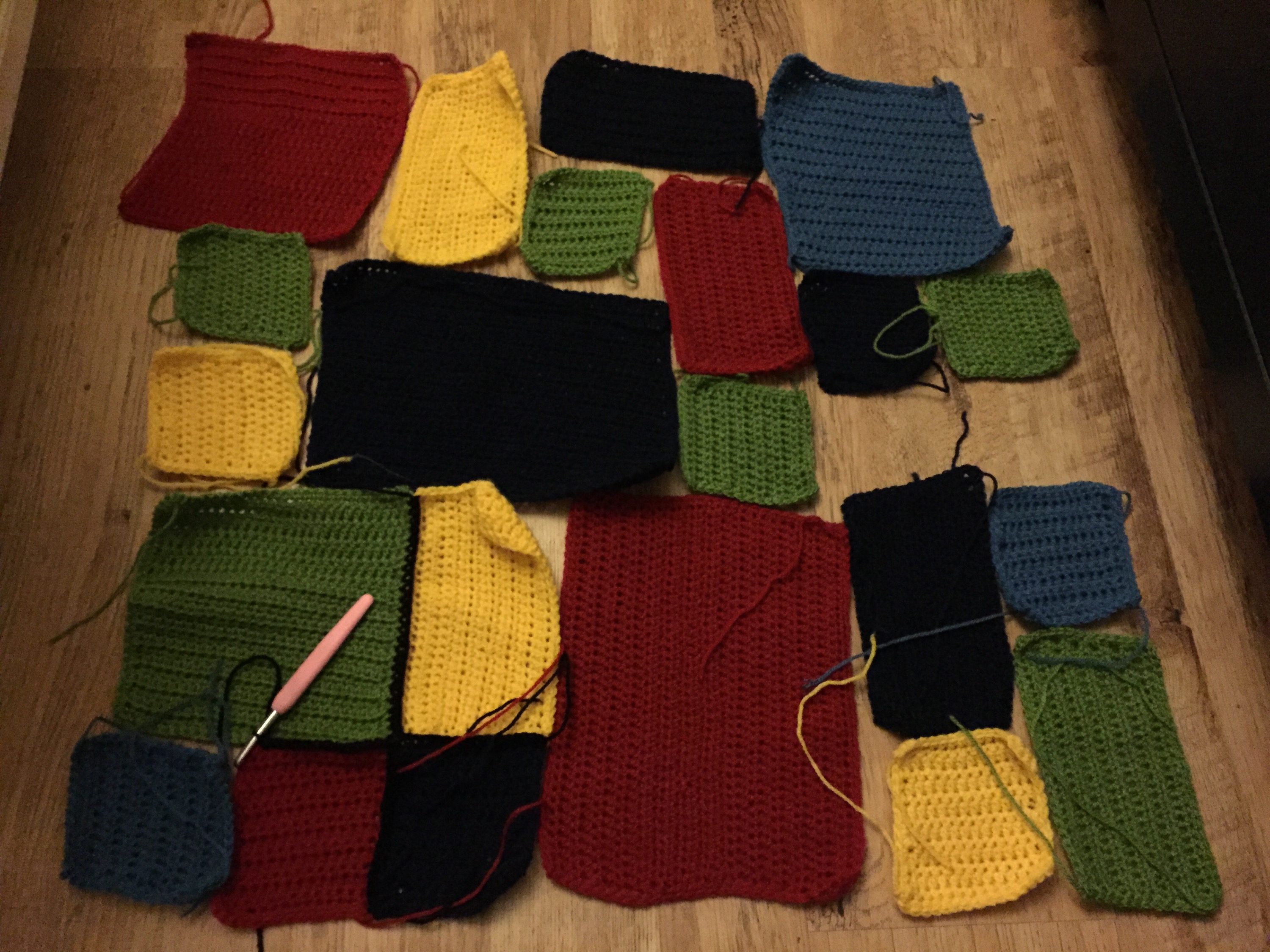 It took me a little time to decide on the best layout of the bricks but I finally got there! I joined them using black wool as I think it makes the bricks stand out the best, and then attached the brick dots – which took quite a while! After I had finished all those I worked on the border for the blanket, I did this slightly different to the pattern and just did rounds of dc stitches in 5 colours one in the black which was the same as the joining wool to provide a strong edge colour, then yellow, blue, red and dark blue, which I had used for the bricks. The final size turned out to be 28 x 29 inches.
