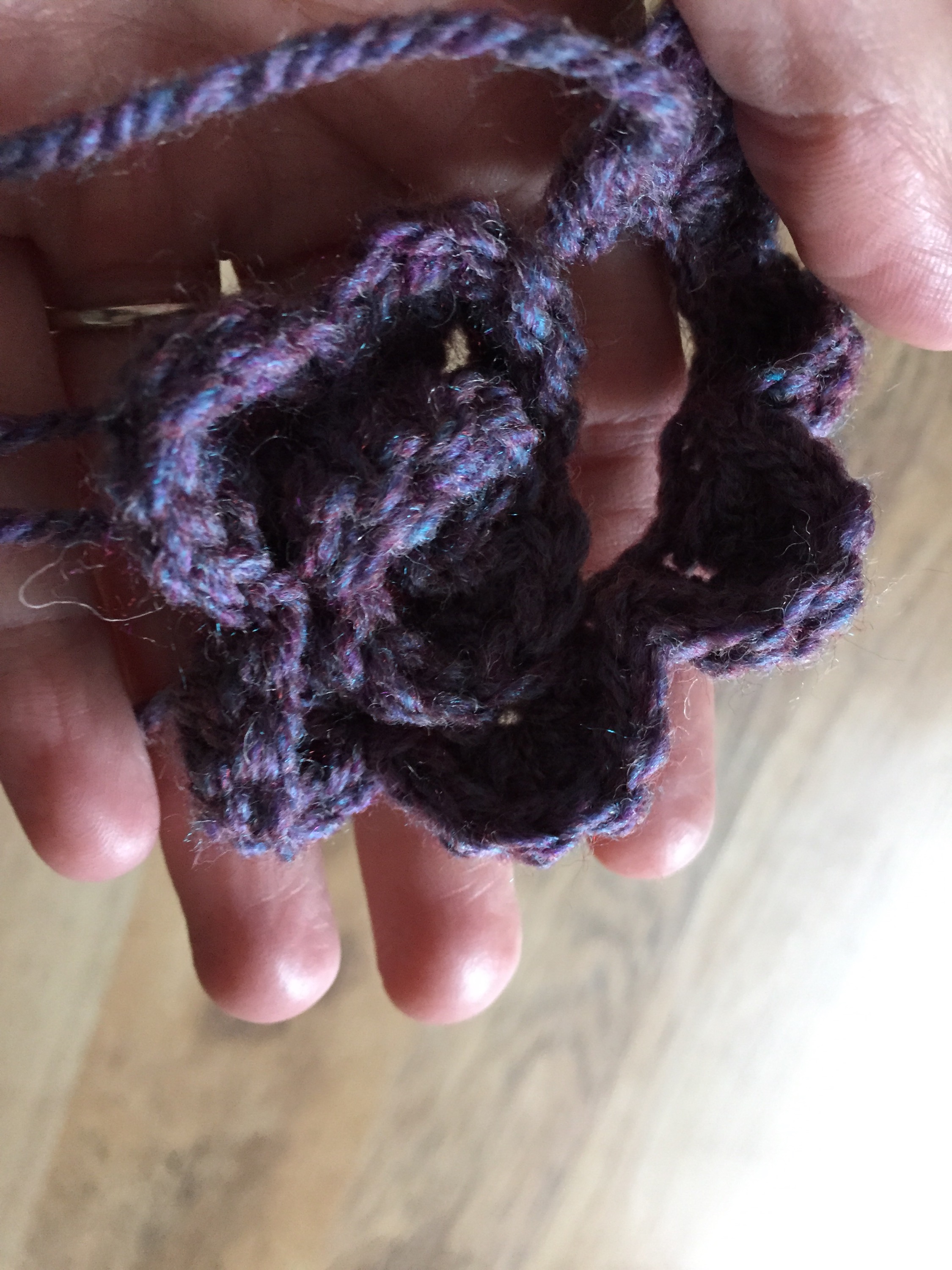 Using the long end left from fastening off, weave along the bottom chain row, then pull the thread tight to pull it in, then position and attach to the back of the flower. Fasten off
