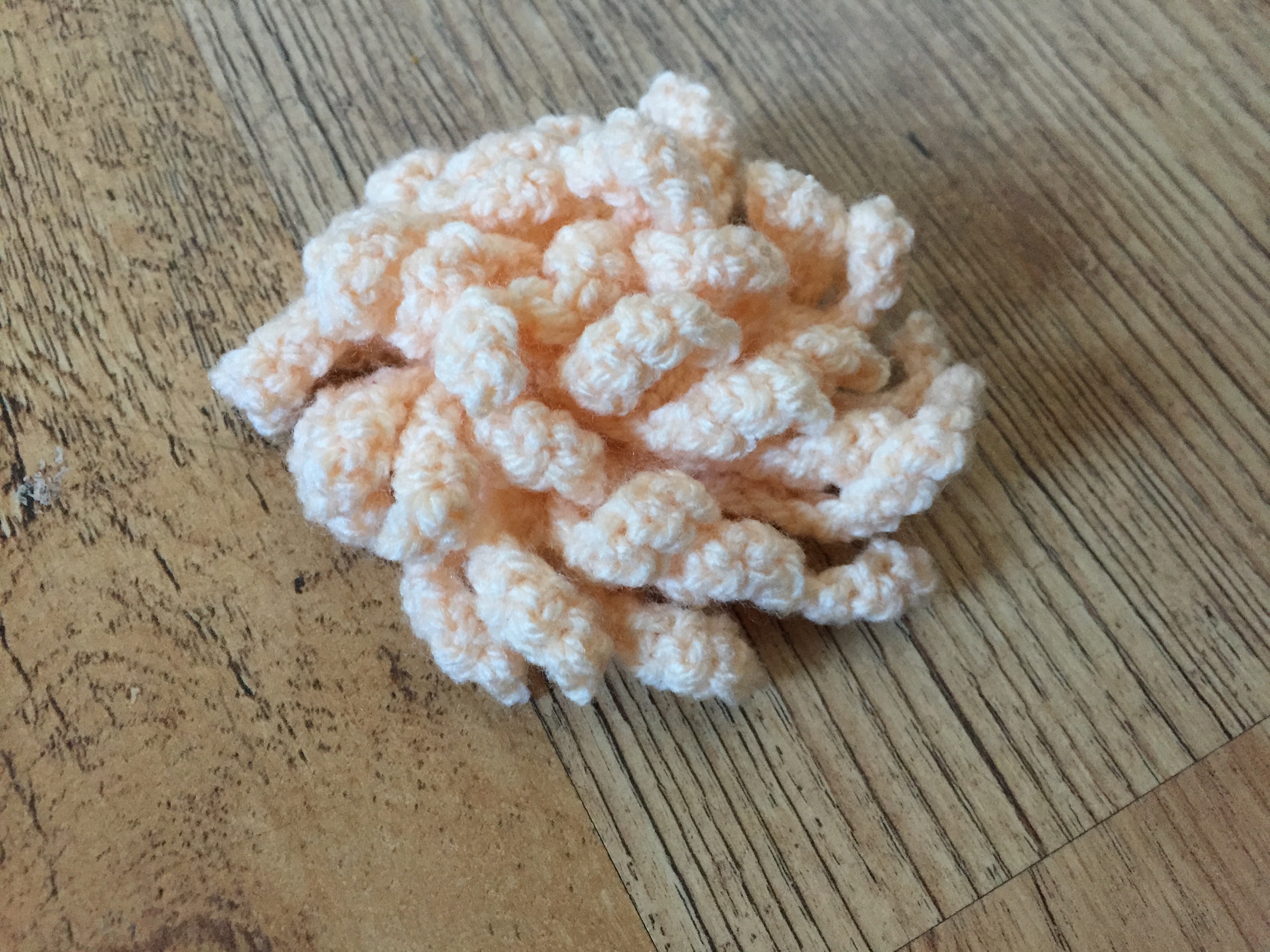 Using a long piece of wool, attach to the start of the row, then sewing as you go roll the row around to give the flower shape, tighter at the start and getting looser as you go around. If you sew from the back it makes it easier as when you roll the row you can see where you need to go next as a spiral will form on the back as you go, and you won’t be fighting the petals as much if you sew from the back.