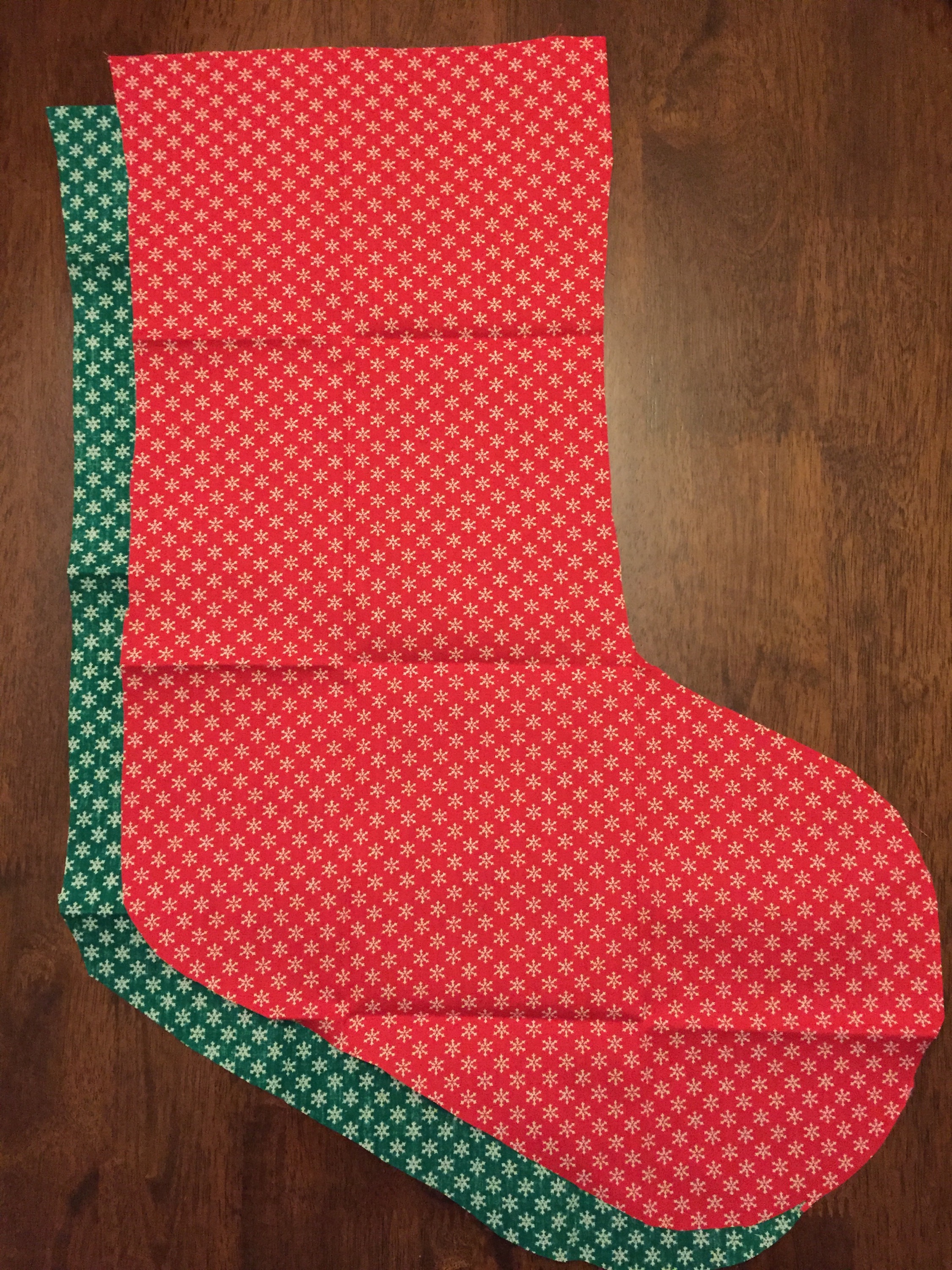 Using the whole stocking pattern piece cut out the following; two pieces of fat quarter bundle fabric for the lining, two pieces of batting and two pieces of lining fabric for the batting.