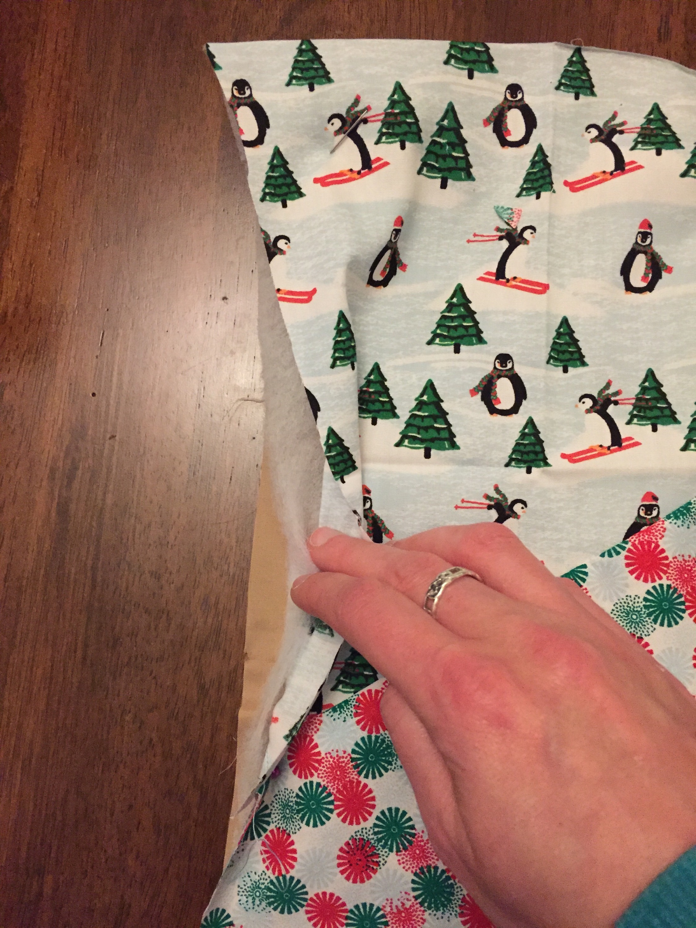 This stocking was made with some very cute penguin themed fabric from a fat quarter set gifted from The Craft Cotton Company. I just love this fabric – how can you not with all those penguins! I decided to use the penguin fabrics on the outside to make sure they took centre stage, and a plainer snowflake pattern for the lining.