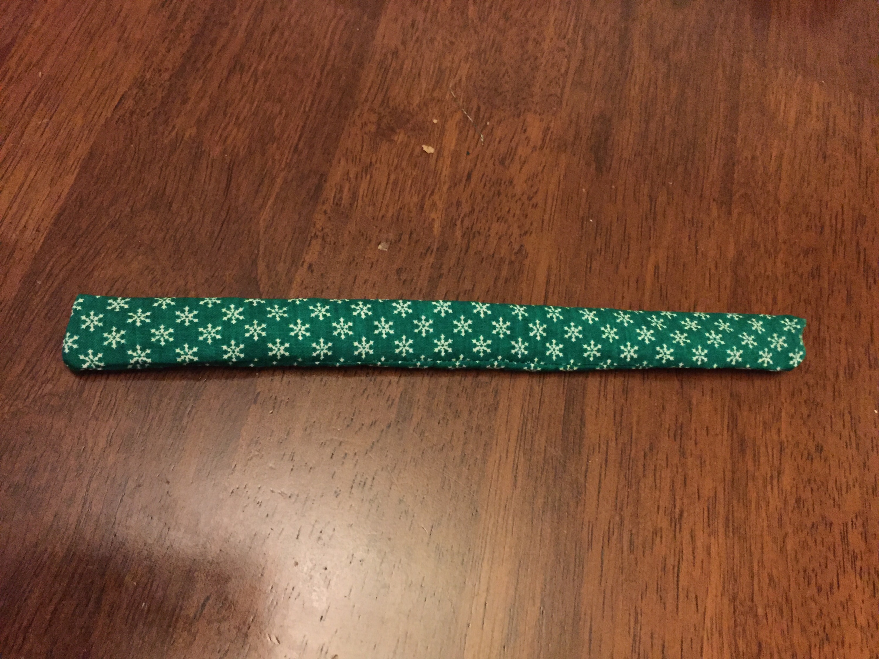 Pick one of the fabrics to make the hanger, I chose to use the green snowflake, and cut a strip measuring 24×6 cm. Next fold the strip in half with right sides facing and sew along the bottom and up the side leaving the top unsewn.
