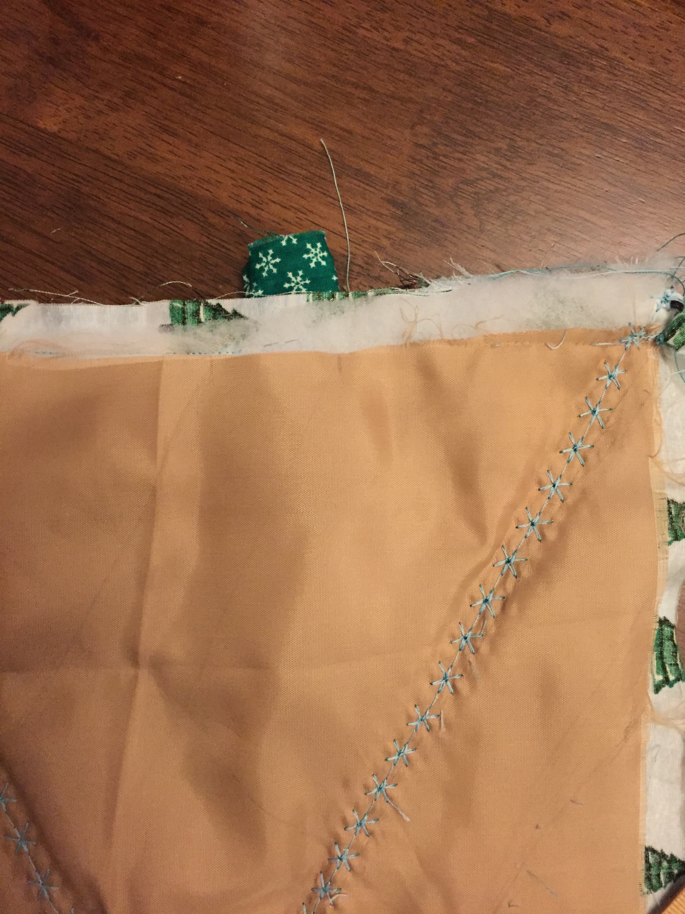 Place the patterned fabric batting and batting lining together and pin to secure in place. I chose to add a snowflake detailing using a pre-set stitch on my sewing machine, but you could do zig zags, straight lines or any other patterns that you like. I went down each of the seams with this stitch detail and then diagonally across each of the sections. I also chose to use two different thread colours, one light blue for going down the seams and a teal colour for the other lines.