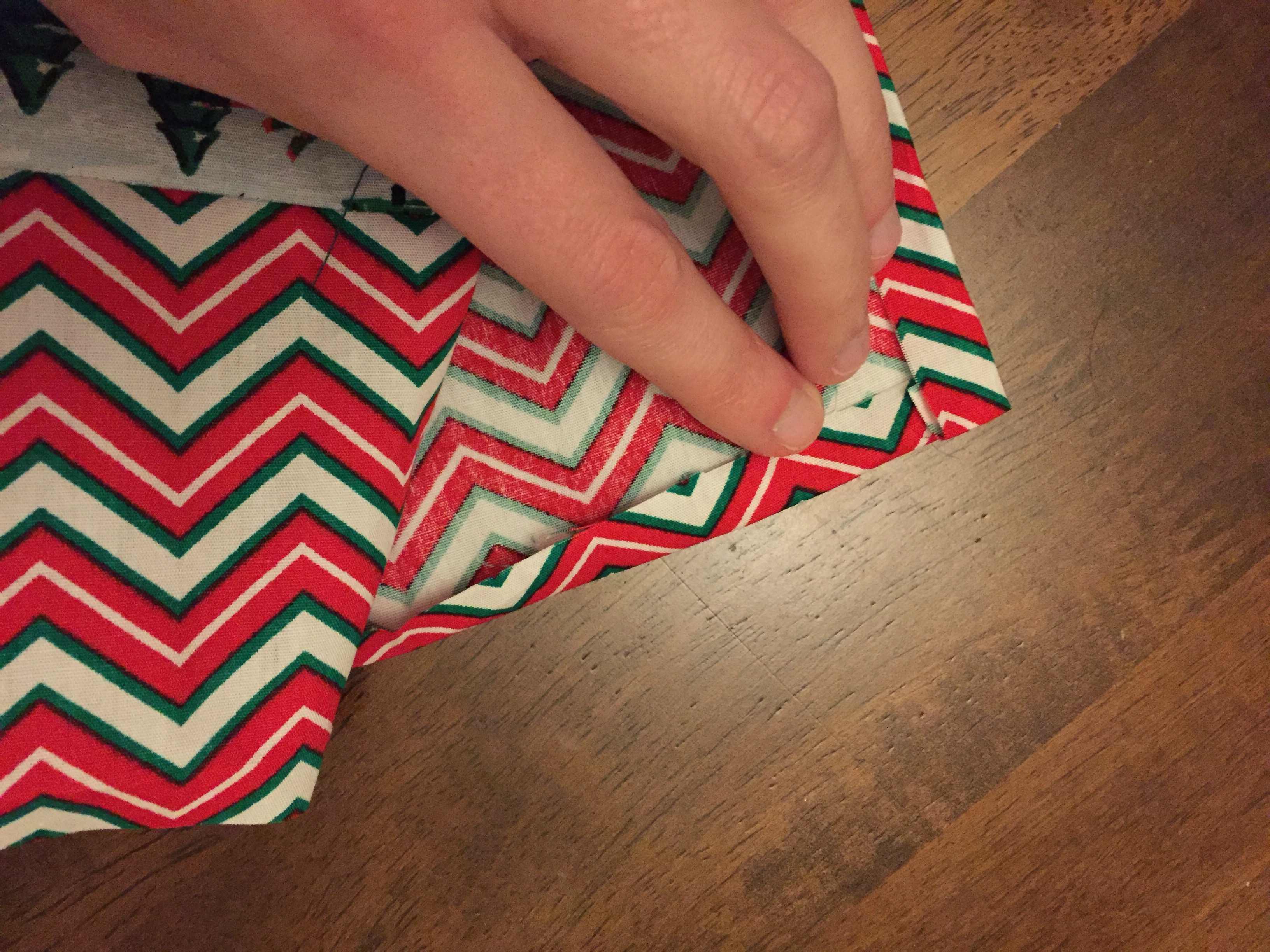 - Fold the fabric in half with the red zigzag fabric along the top of the bag and place right sides together. Now starting 6 1/2 Inches from the top of the fabric sew down the side and along the bottom of the bag. Turn out the right way.