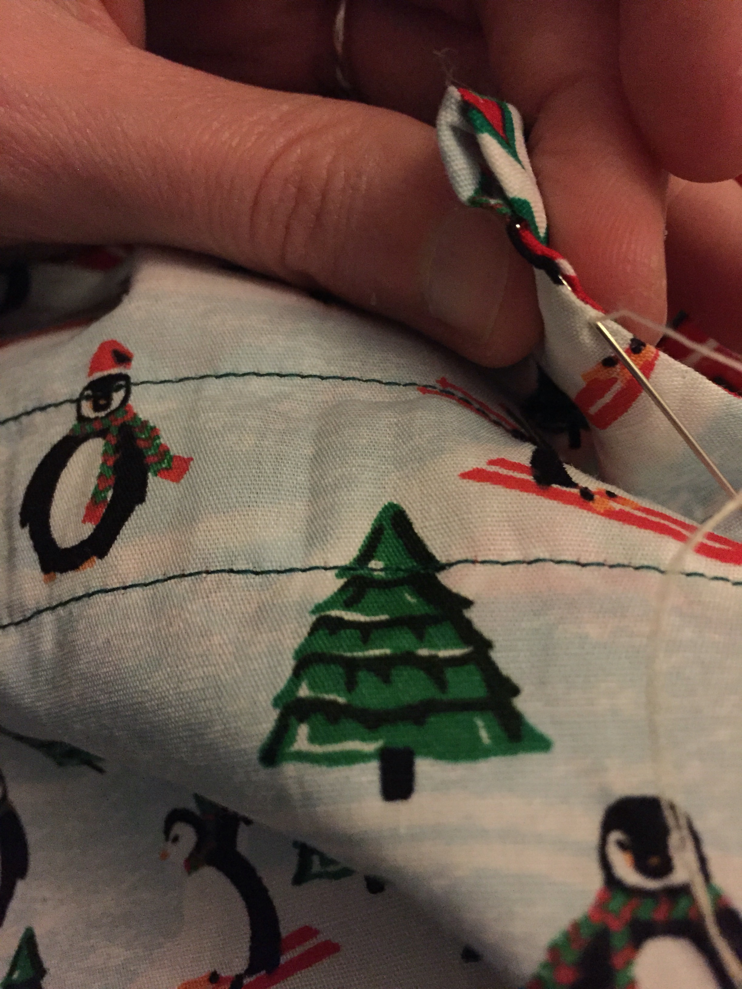 - Thread through the ribbon for the drawstring, fold over the end of the ribbon a few times and sew to stop it fraying.