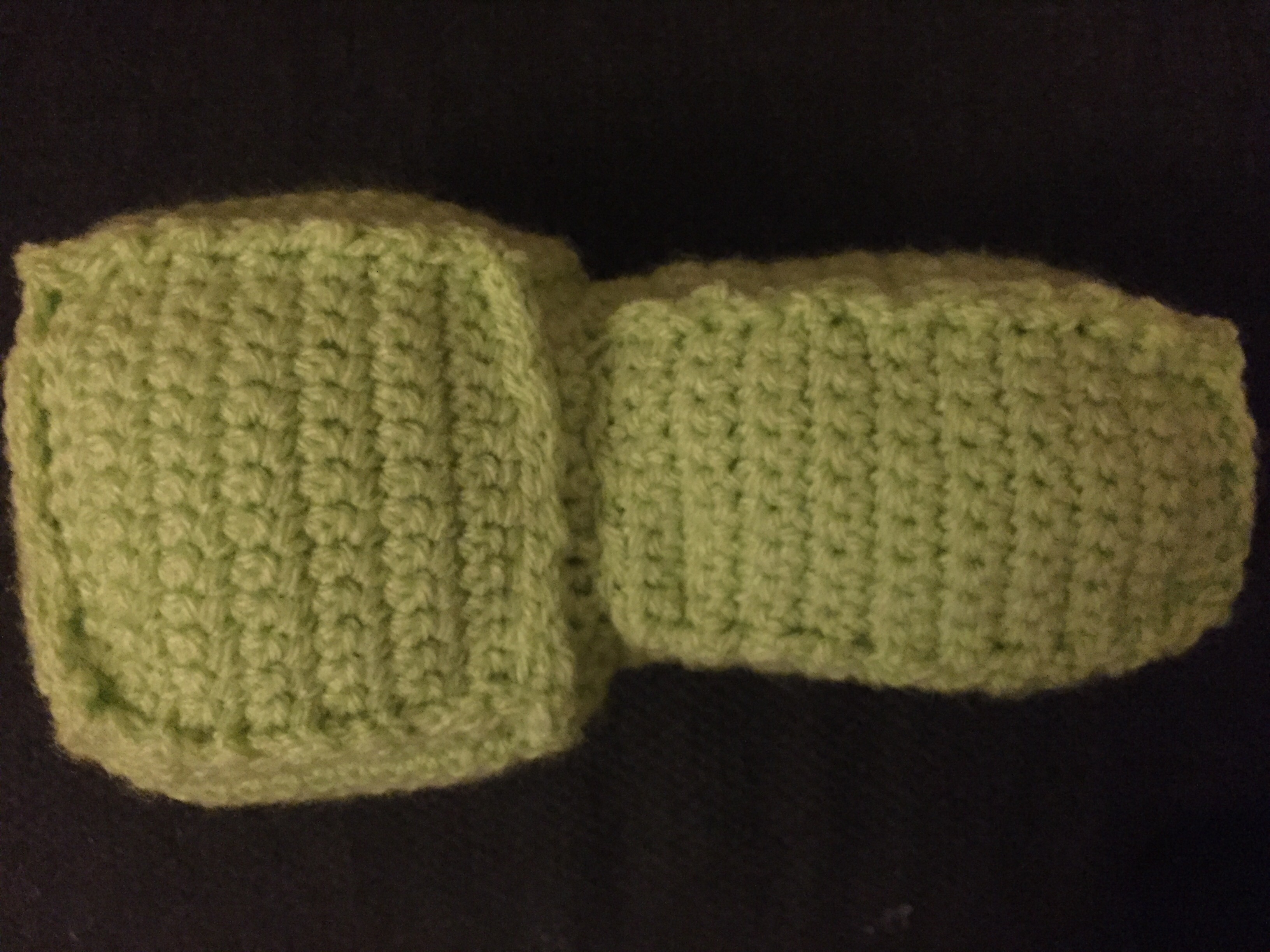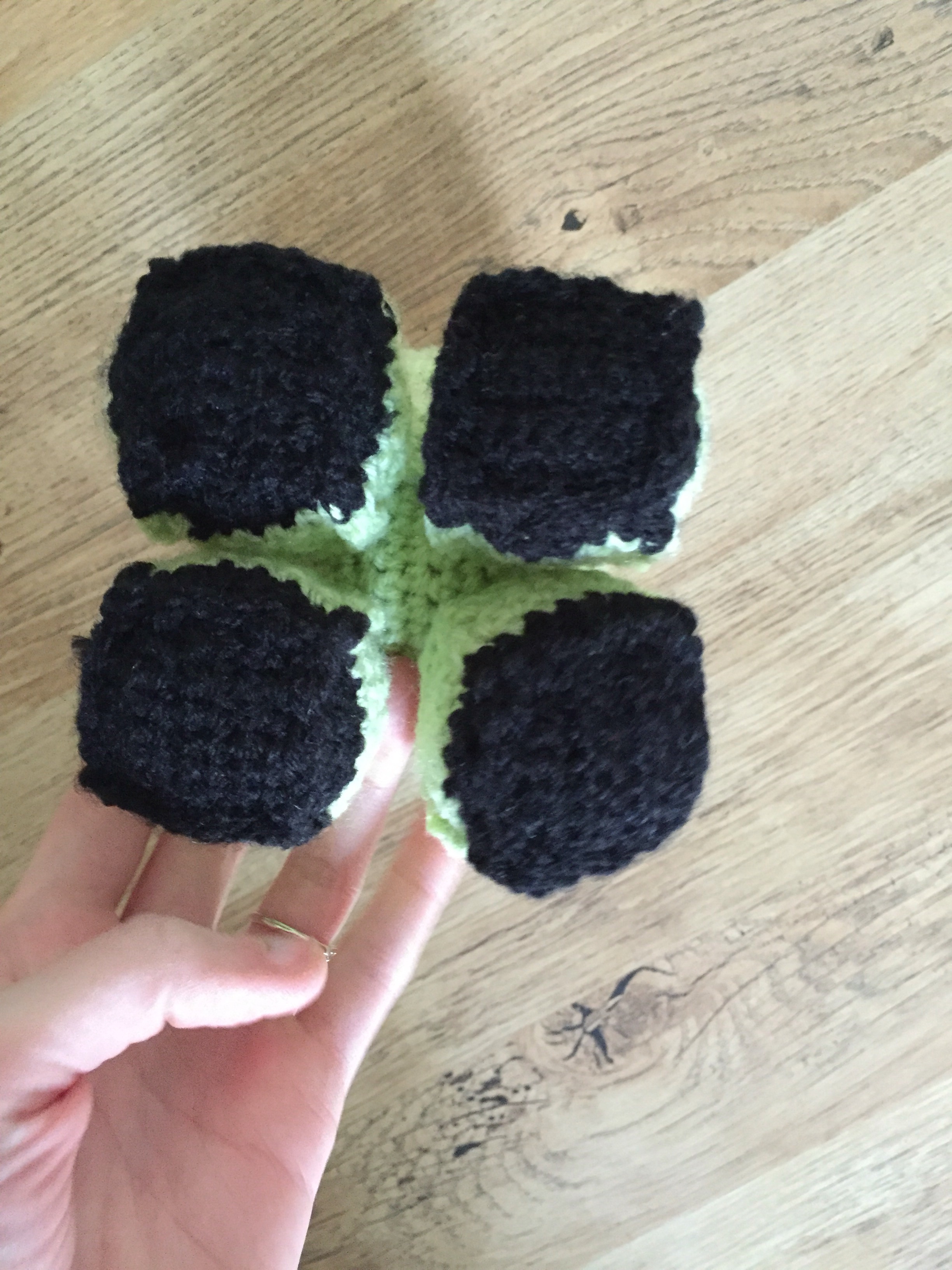 - Sew the leg pieces together with a black piece on the base, the black and green pieces around the sides, stuff then sew onto the tops.