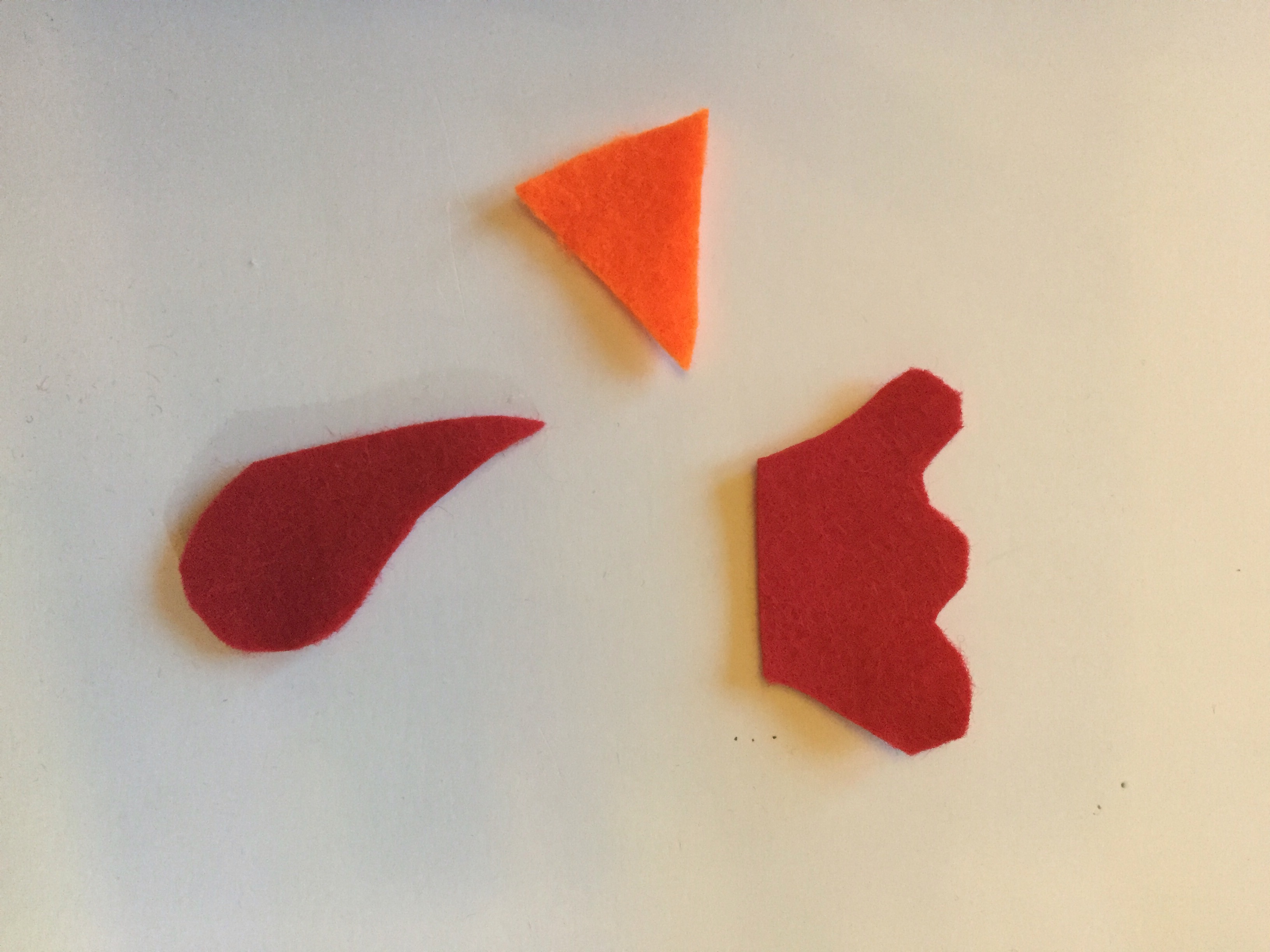 - Cut out the felt details – you’ll need the following; a comb for the head, a beak, and a wattle (dangly bit under beak!), all in red felt. You can also cut out some feet in orange if you are adding these.