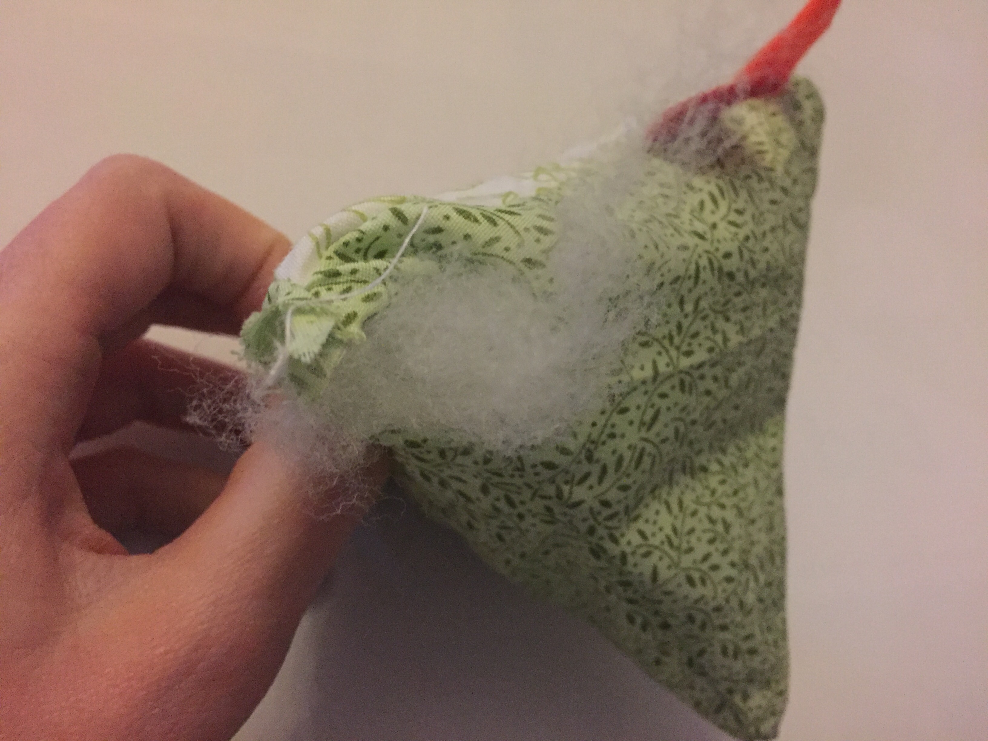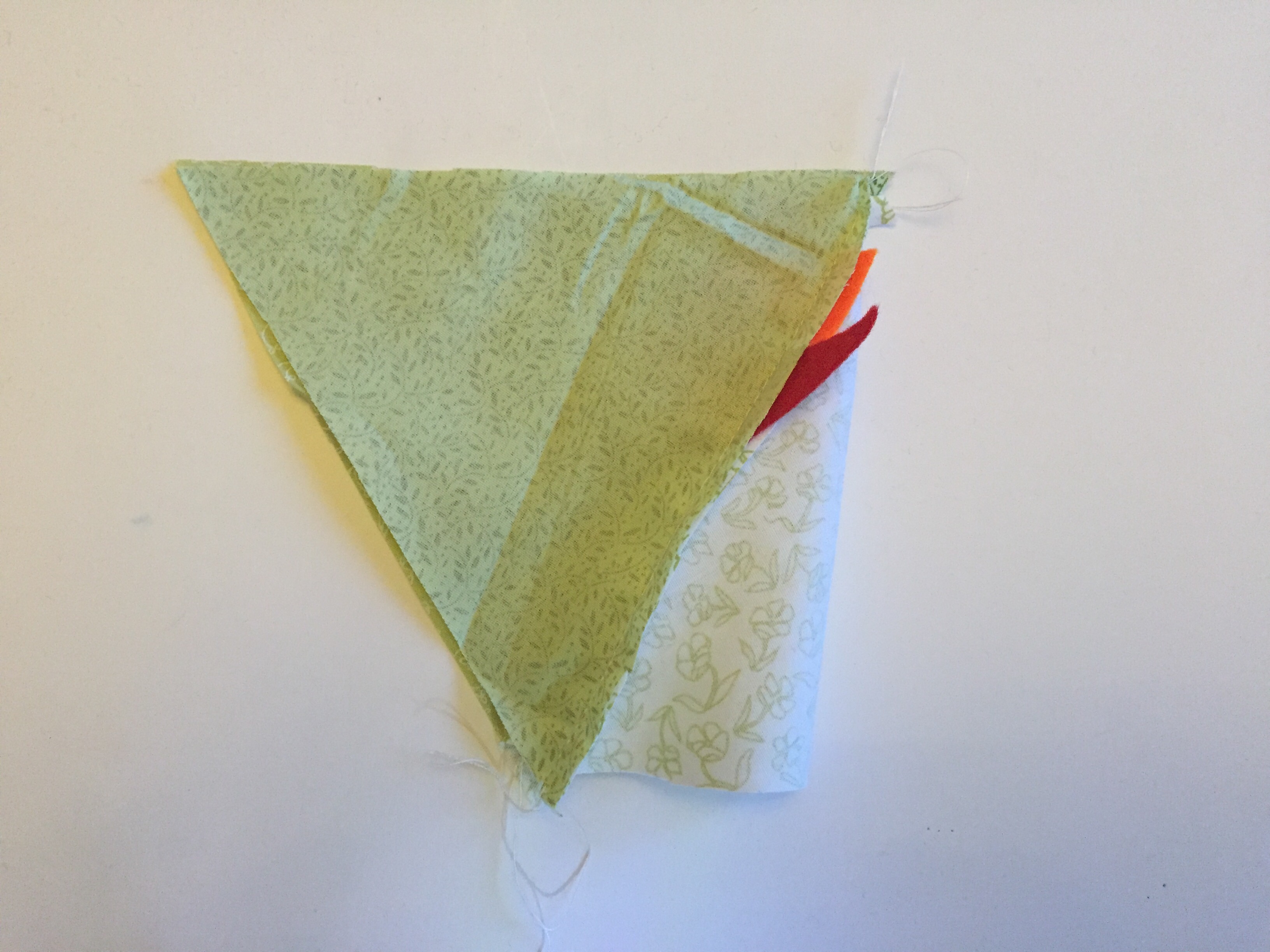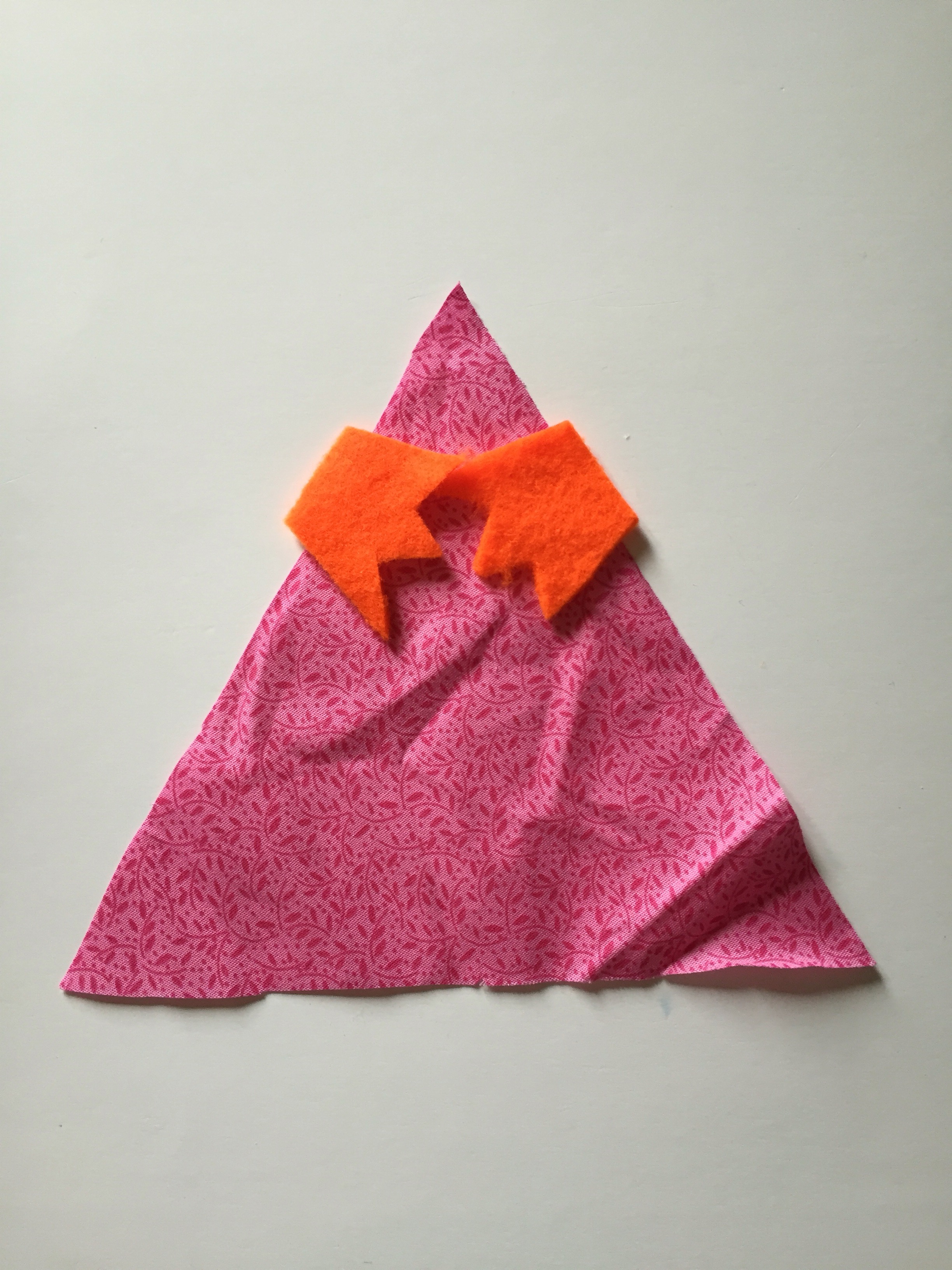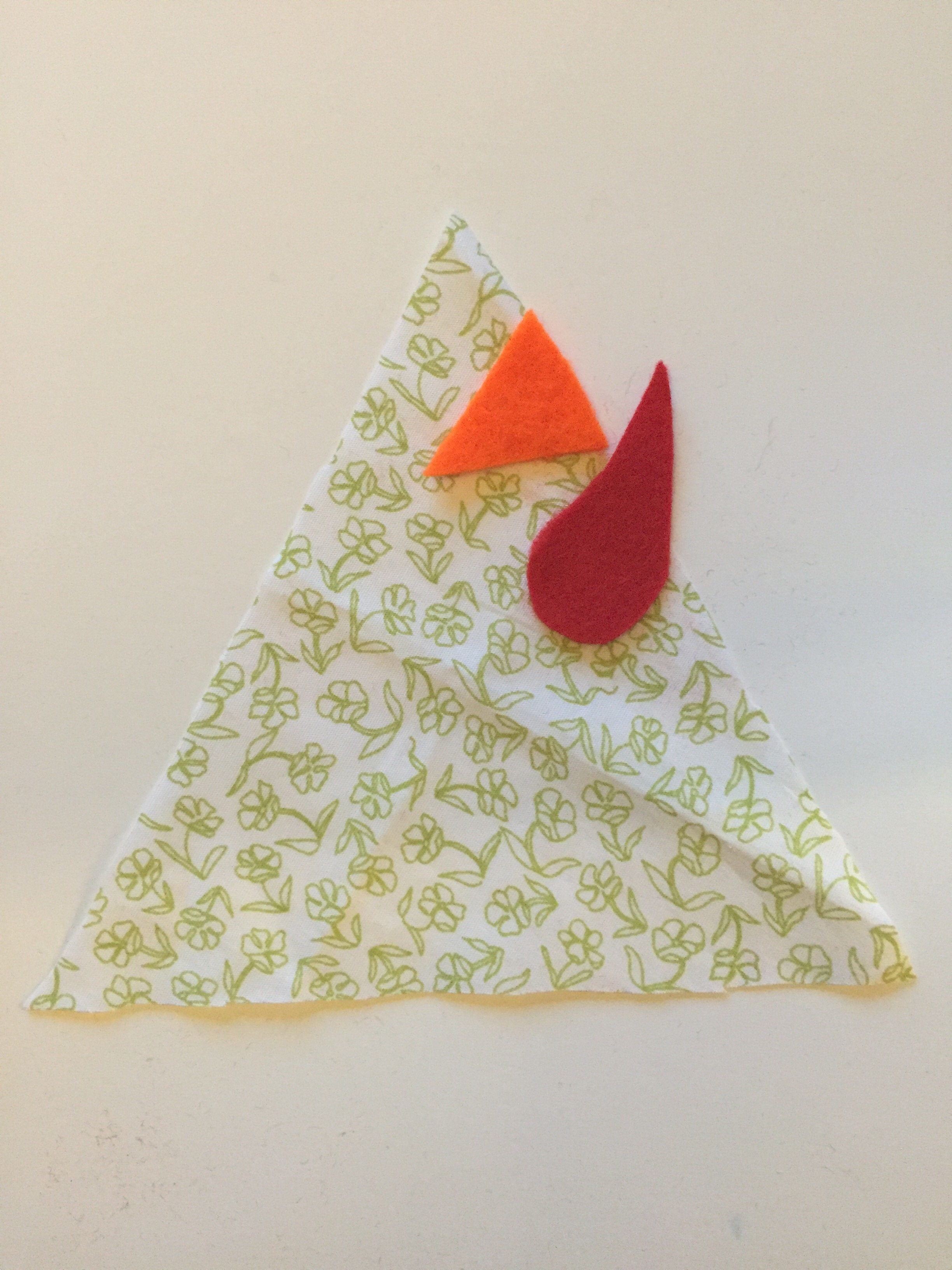 - Lay the first triangle flat with the right side up and place on the beak and wattle – make sure to place them facing inwards with their base edge just hanging over the fabric triangle.