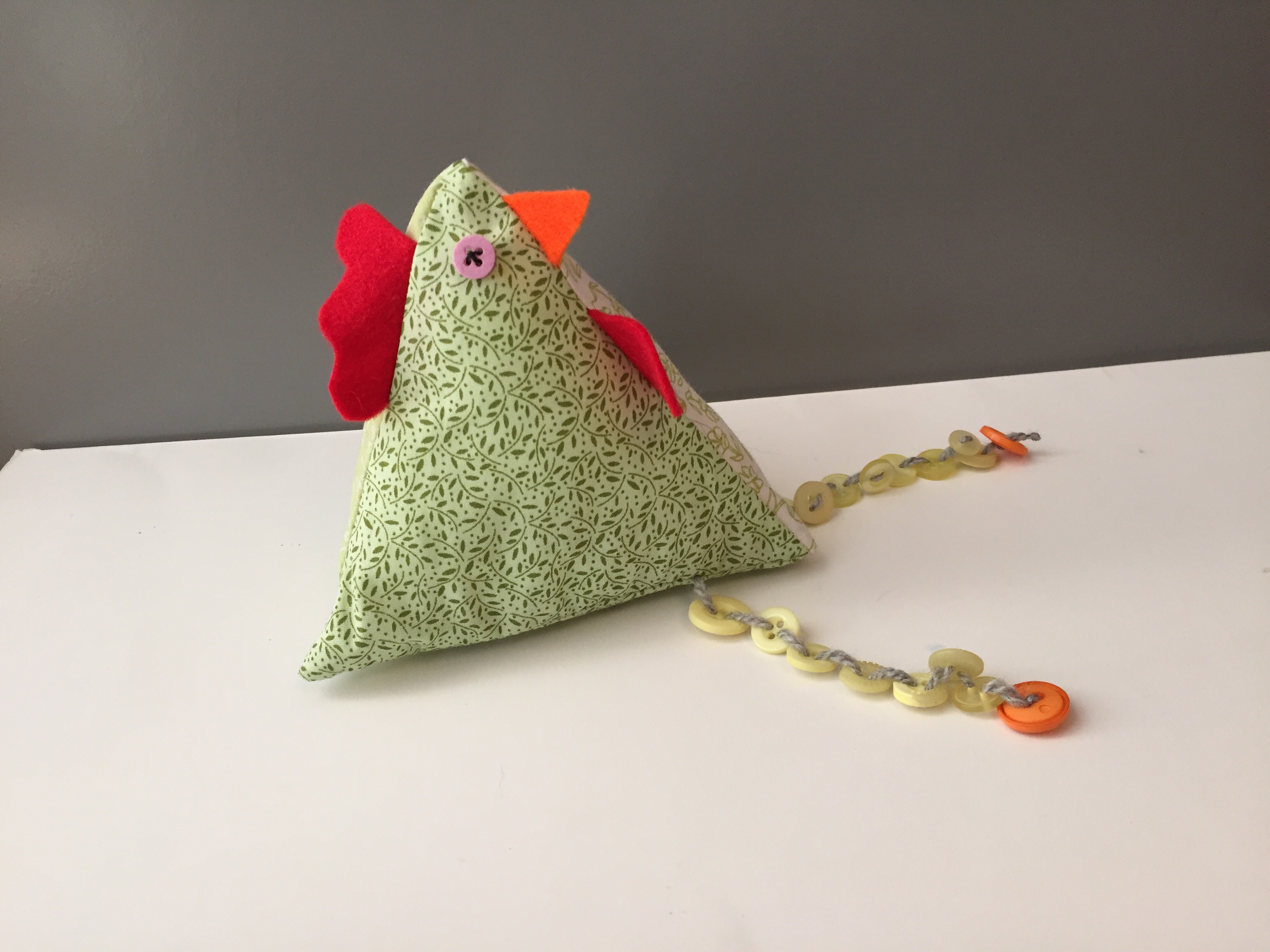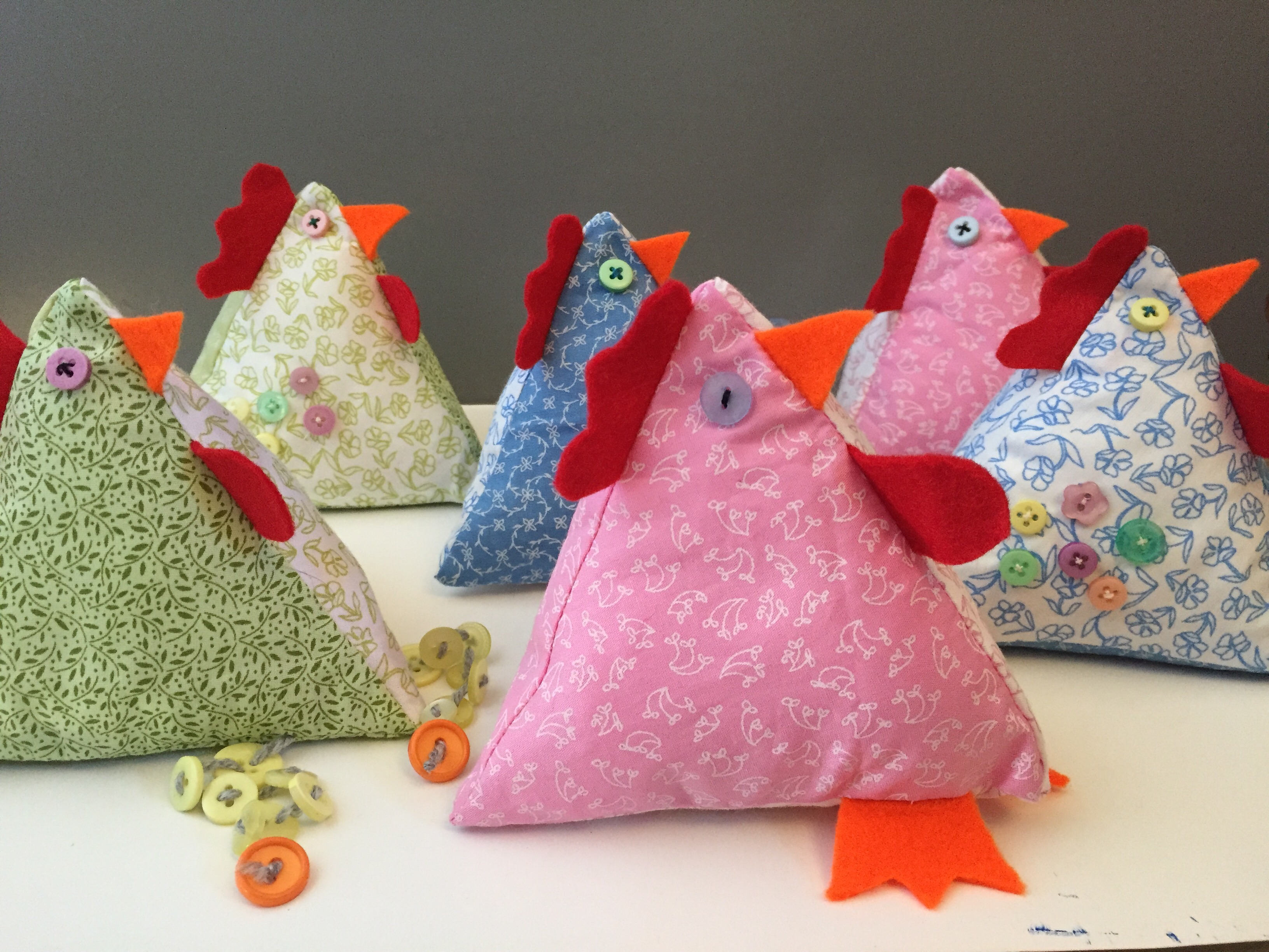 - For wing details, sew on a selection of different coloured and sized buttons onto the side of the chickens.