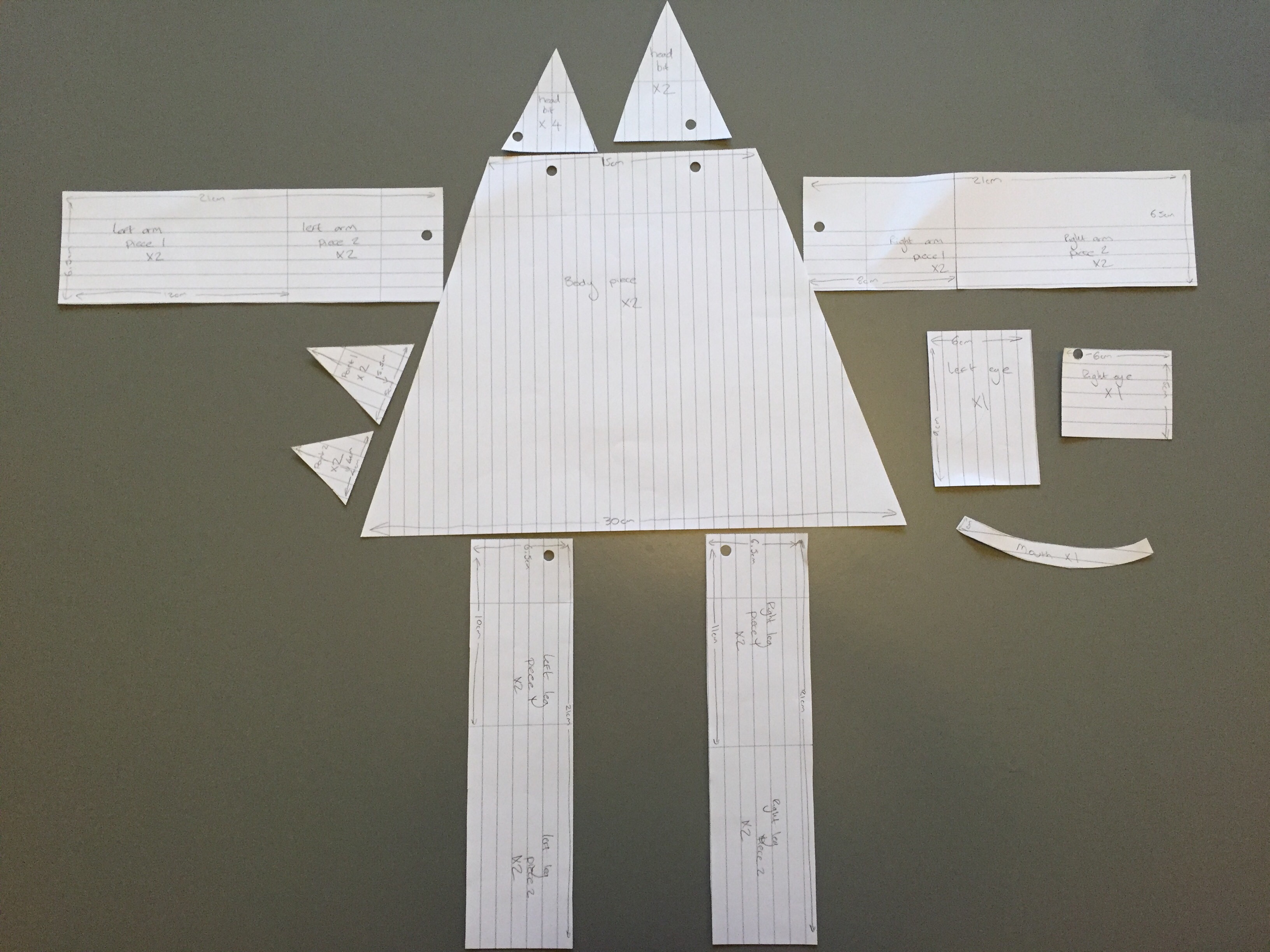 - If your doing the same monsters as me the monster parts and size of the templates I used are on the photo below, these measurements include a seam allowance. If you are doing your own, sketch out your monster then draw out your paper pattern pieces. Cut out these paper templates.