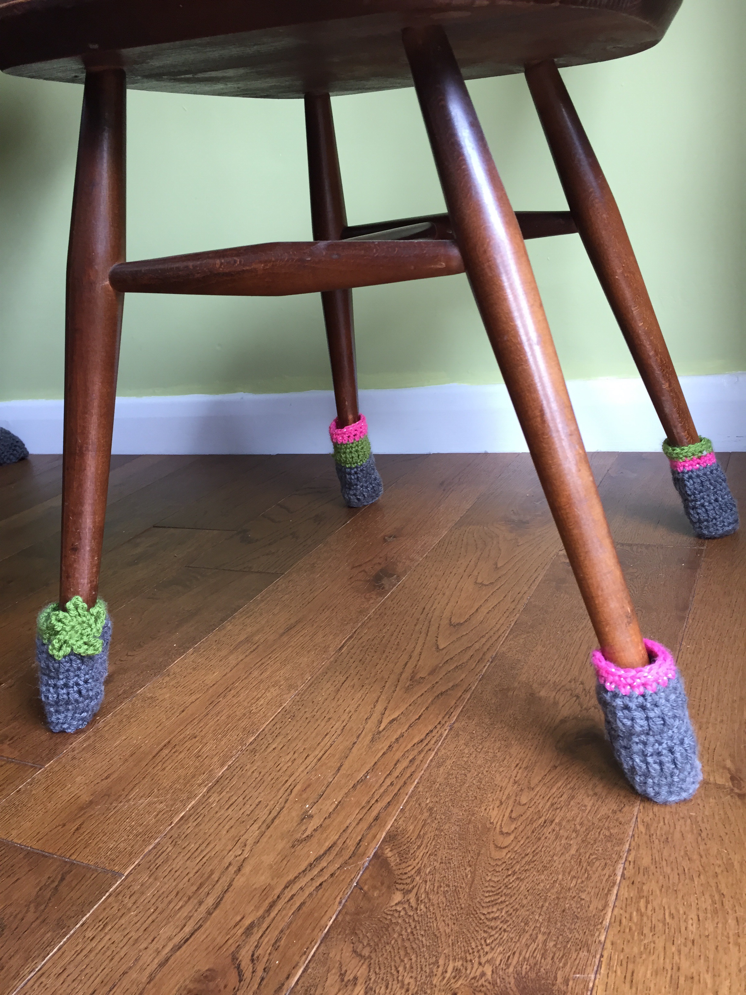 I recently completed a pattern for some square leg chair covers in an attempt to remove the scraping that was happening on my wooden floor, and they have done the job perfectly. However, as I have two types of chair I needed to complete some round ones as well. I’ve finally got them all completed and here’s the pattern for the round legs.