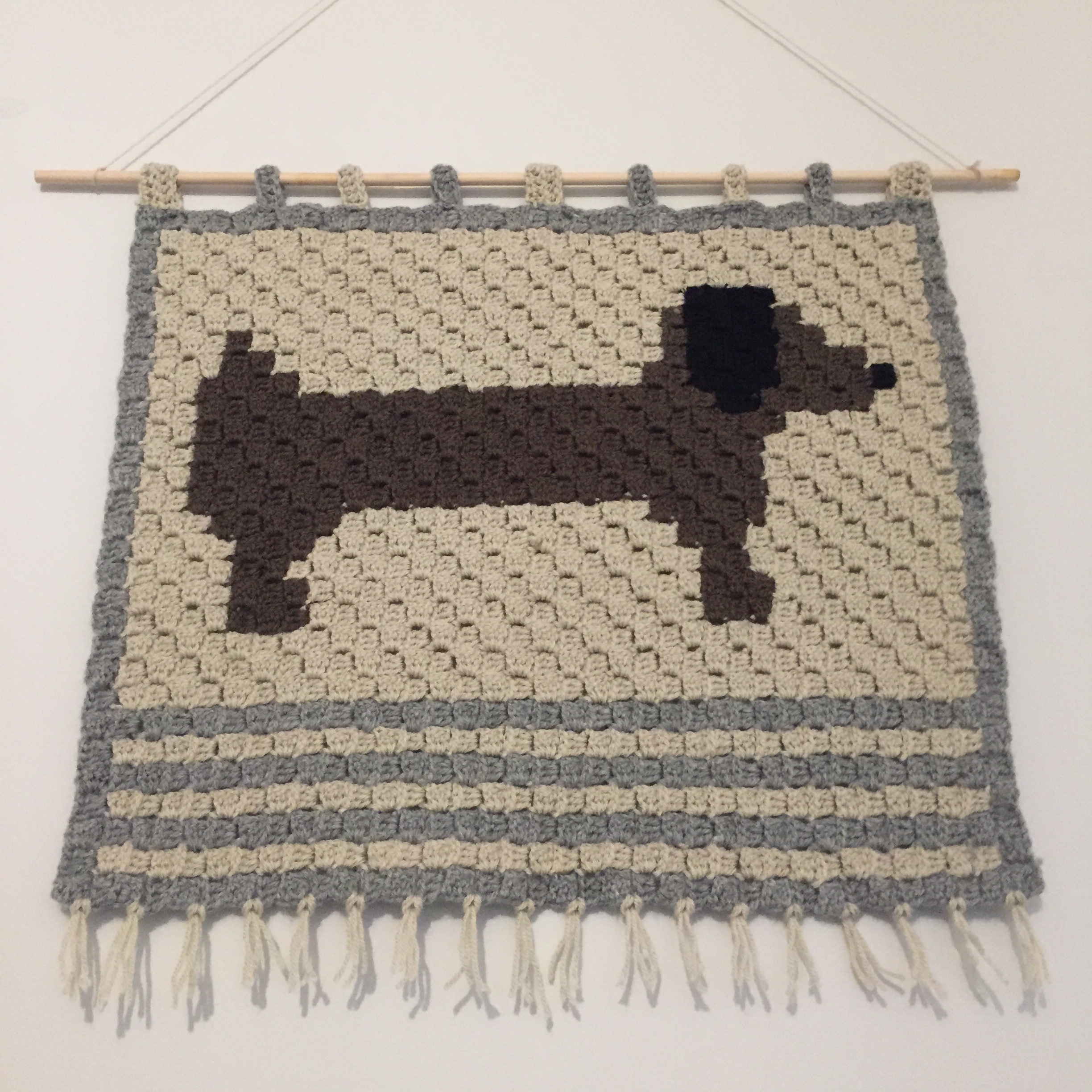 I liked my crochet Dachshund wall hanging so much and I really enjoy corner to corner so I decided to make another! However I wanted this one to be a little bigger, have slightly different hanging loops and have some tassels. So with those requirements in mind I set off and made a second version – here it is!