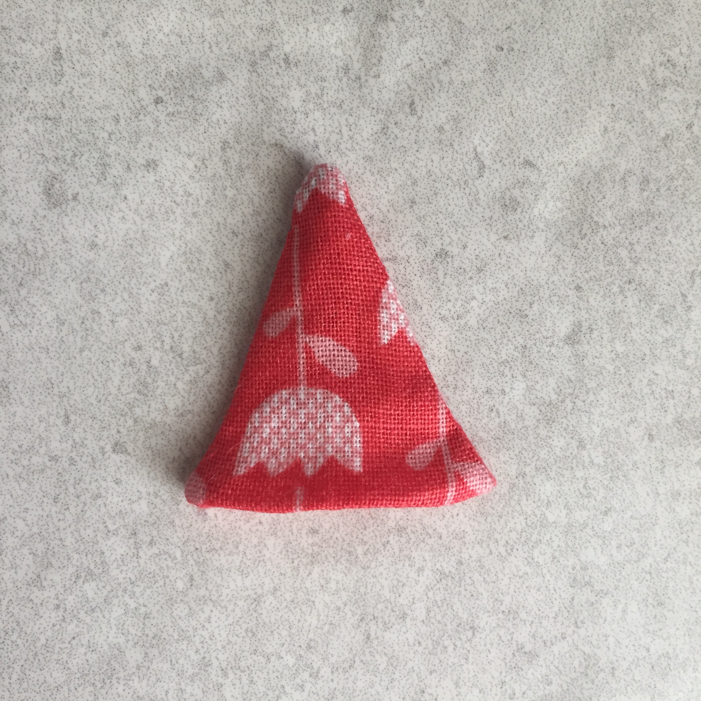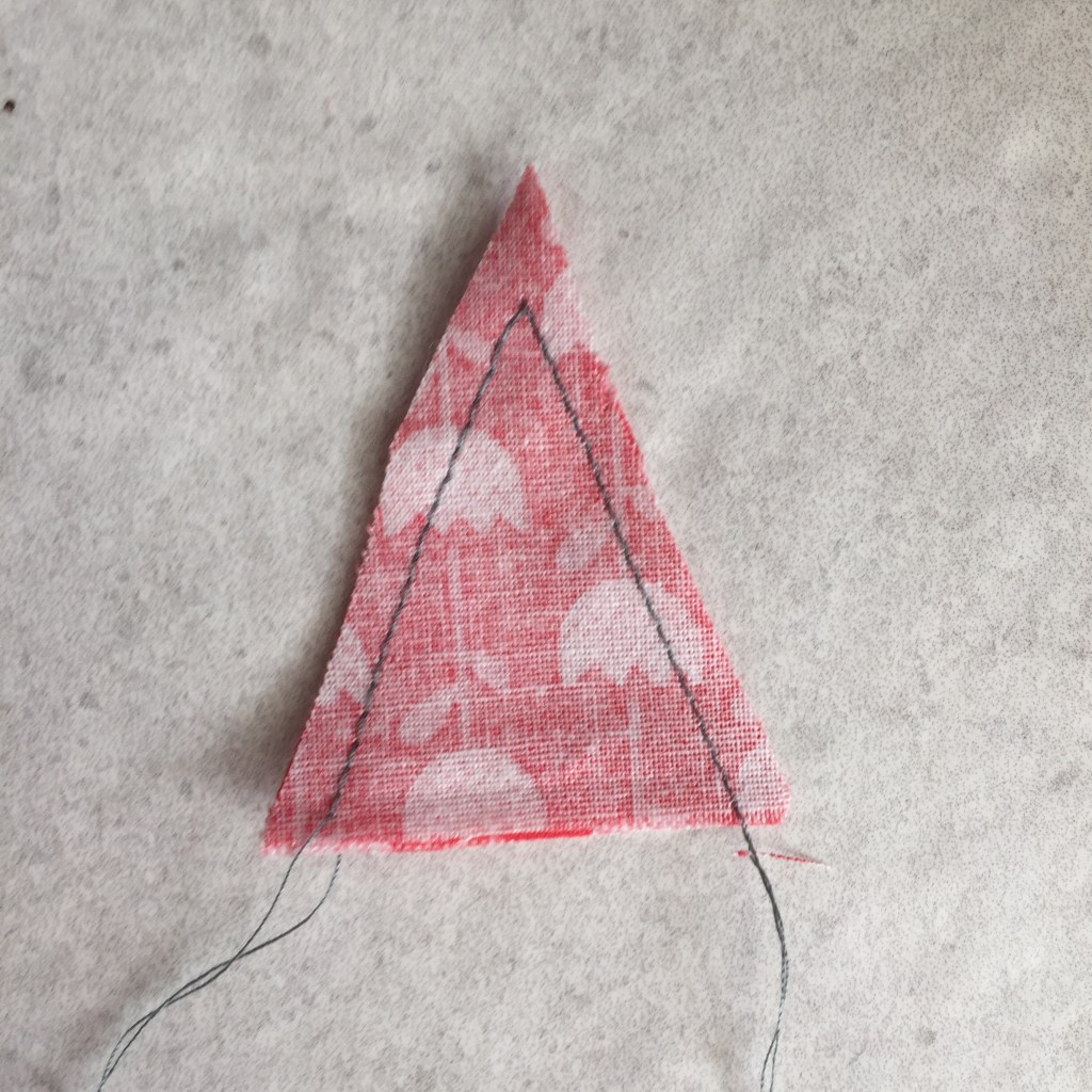 - To make the prickles take two of the triangle pieces and place right sides together, sew down the two sides of the triangle leaving the bottom edge unsewn. Turn out the right way and fold in the bottom edge.
