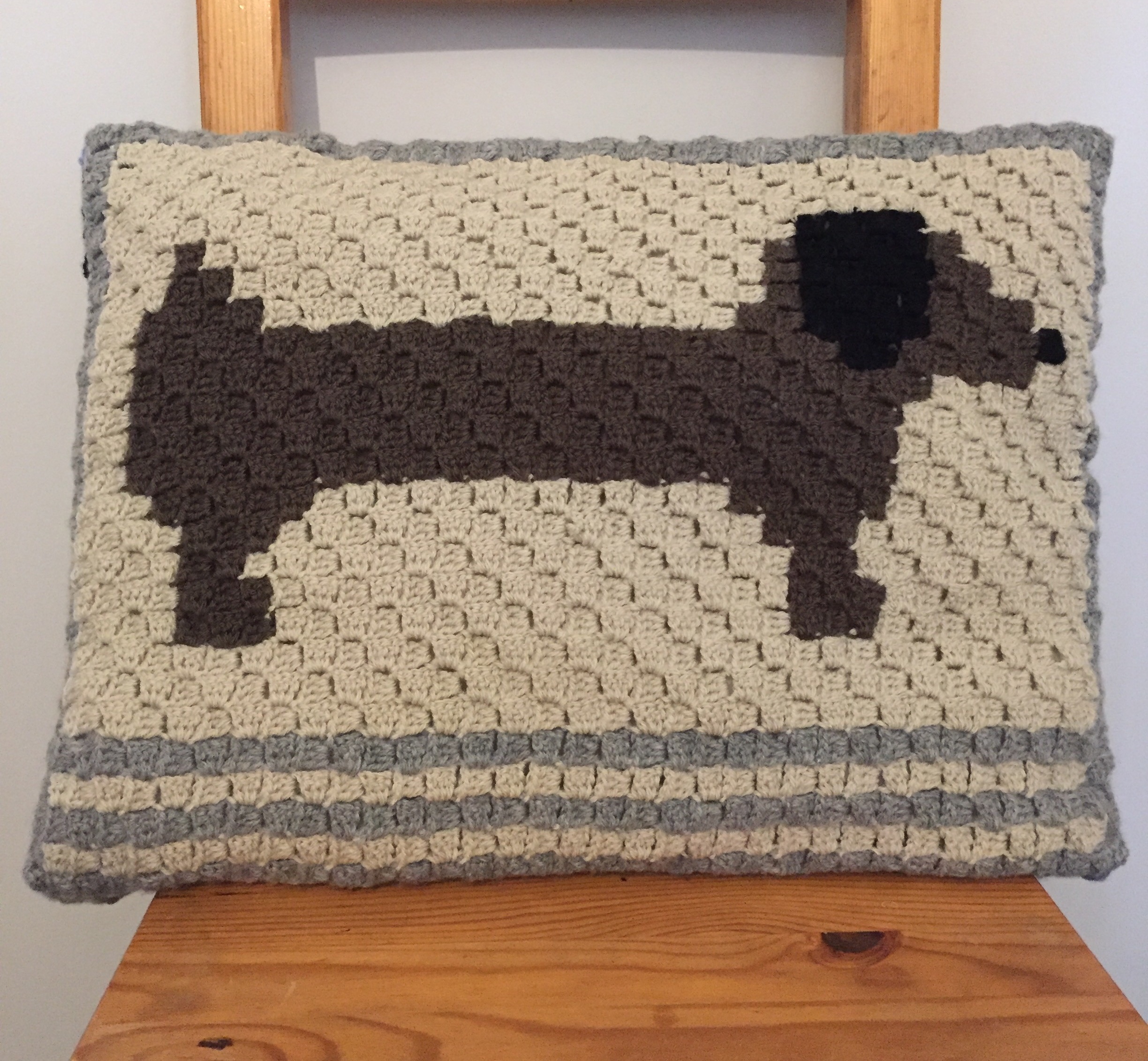 In sneaks another dachshund make….dachshund corner to corner crochet cushion
