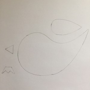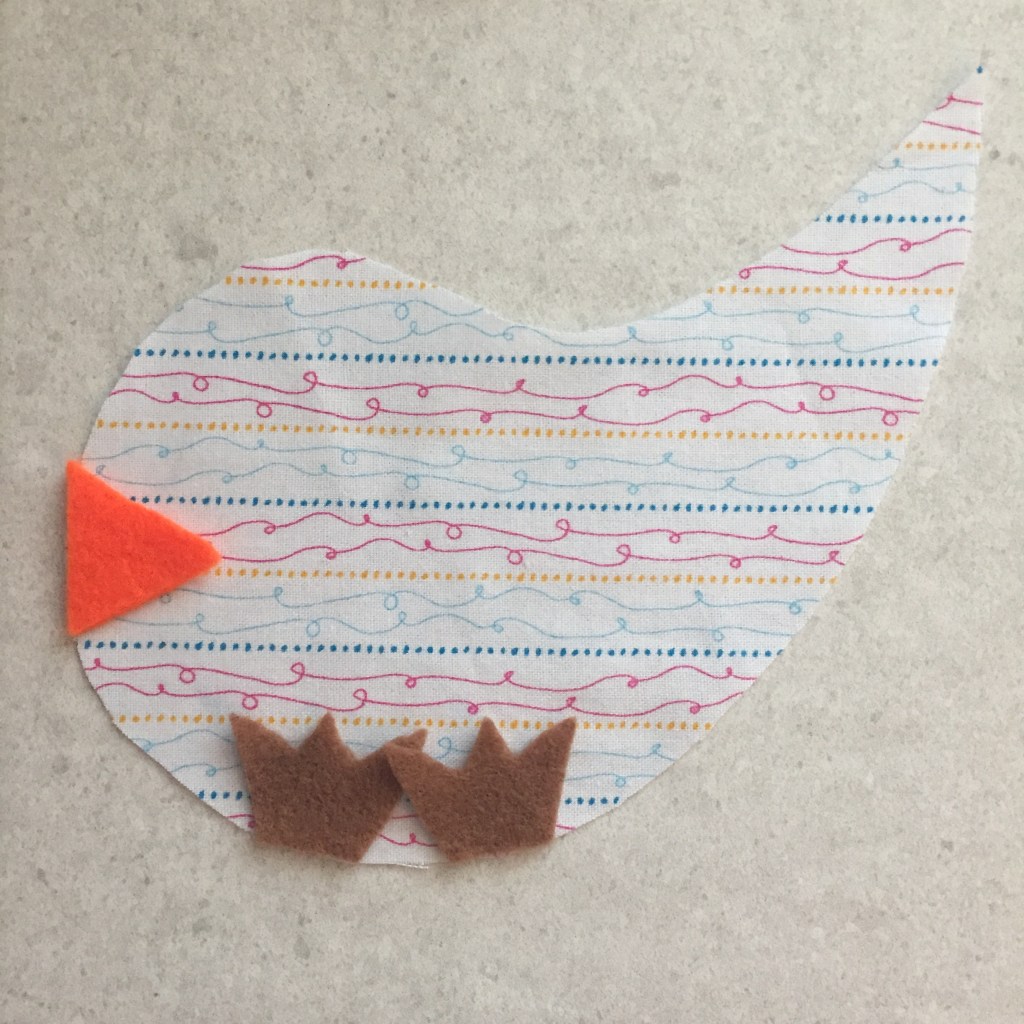 - Take the two body pieces and place one down right side up. Put the beak and two feet onto the body piece with their raw edges against the raw edges of the fabric. Put the other body piece right side down on top. Sew around the edges to secure leaving a 6cm gap for turning. Turn out the right way and slip stitch the gap closed.