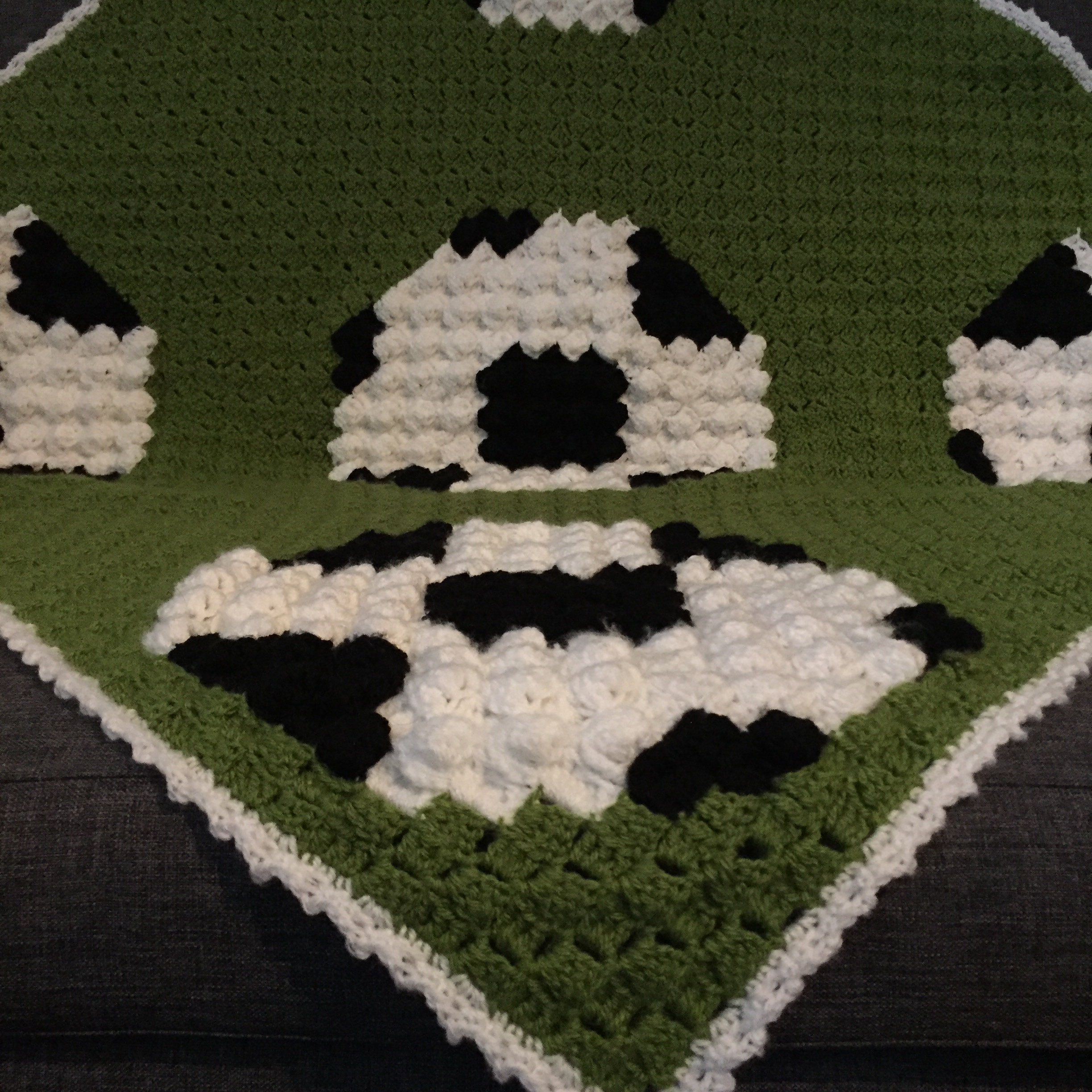 I really enjoy corner to corner crochet and thought it was about time I got a few more corner to corner projects completed. First on my list was a football themed blanket. I wanted to add a bit more texture on the blanket so decided to make the footballs textured so they really stand out. To finish it off I added a white border so it would look like the white lines around the edge of a football pitch.