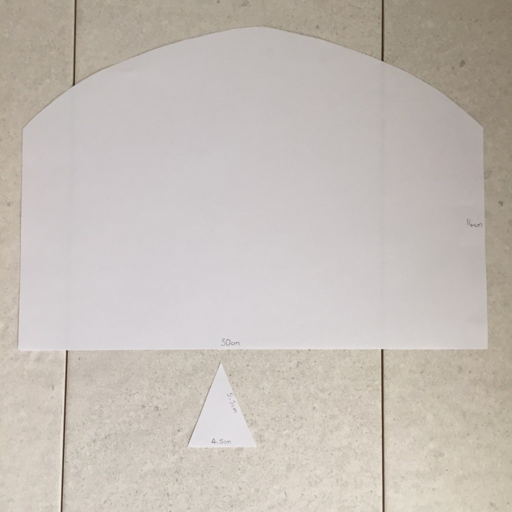 - Make a template from a A4 sheet of paper, with the base of the fabric roll 30cm long and start curving inwards to form the top edge 14cm up from the side.