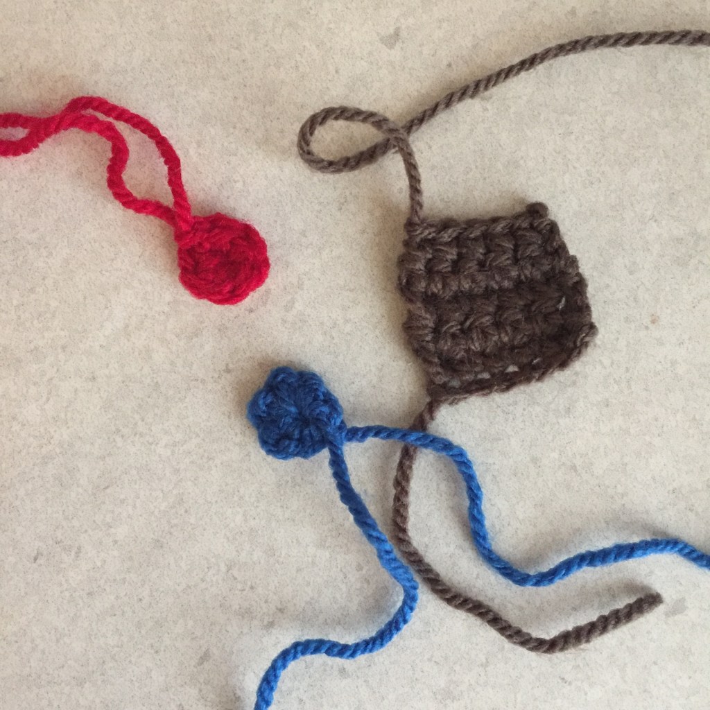 Decorations (blue and red wool): Make a magic ring, ch1, 6sc into ring, fasten off leaving long thread to attach.