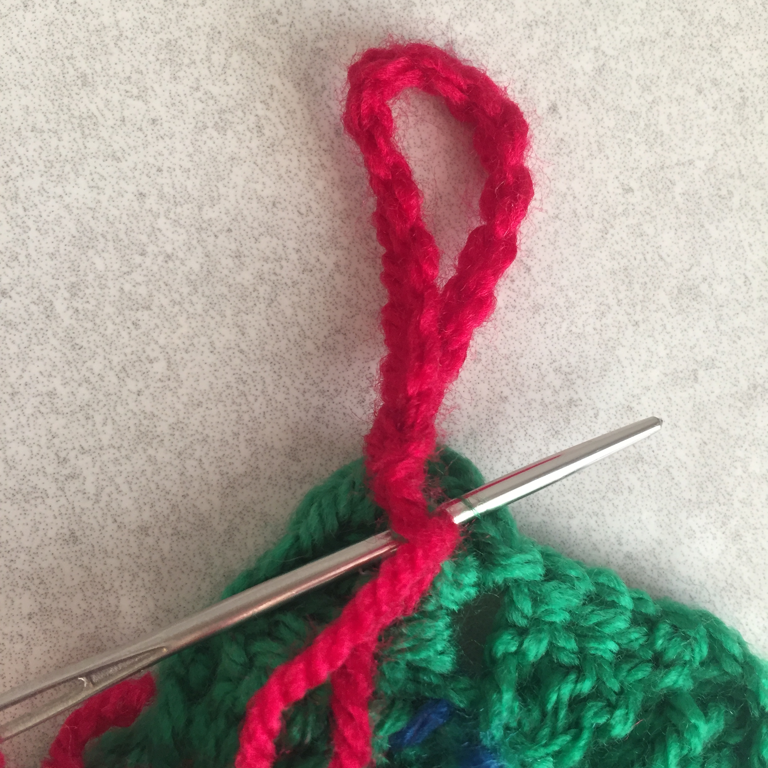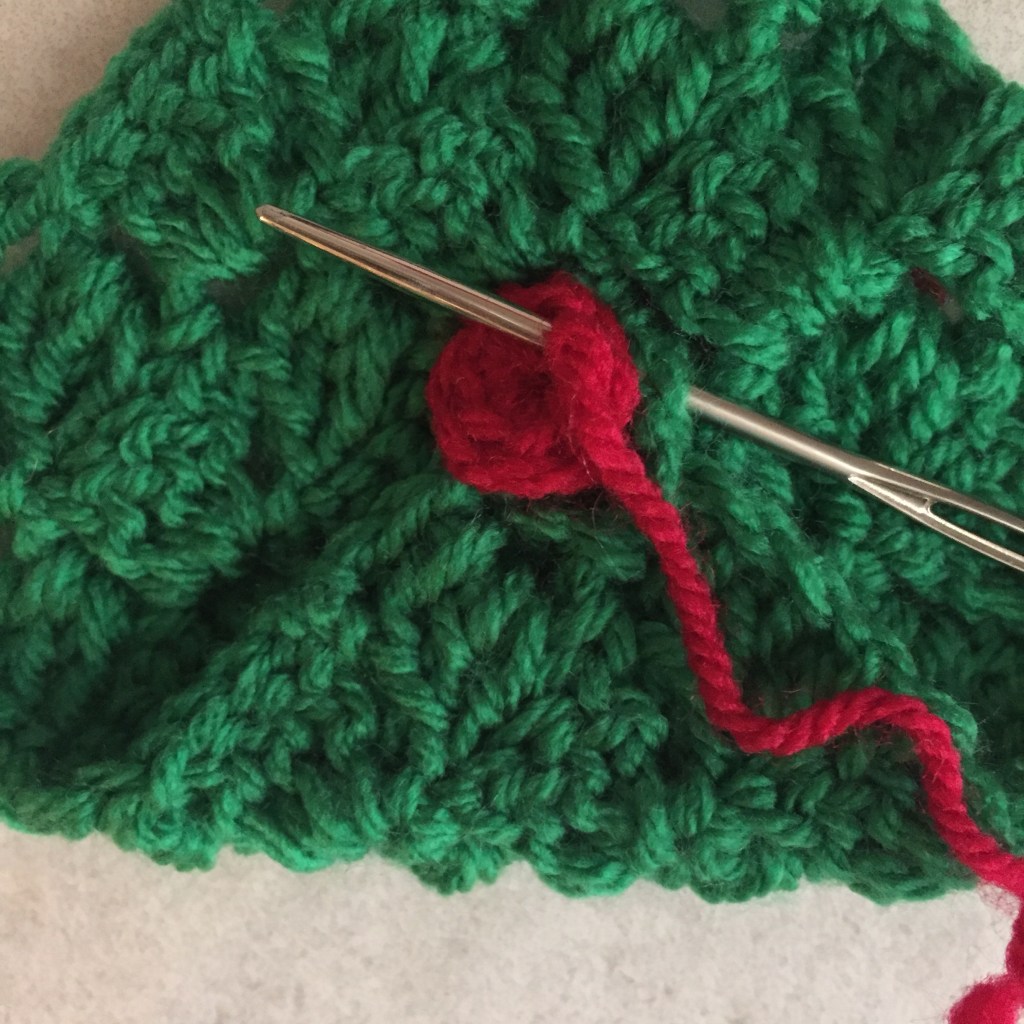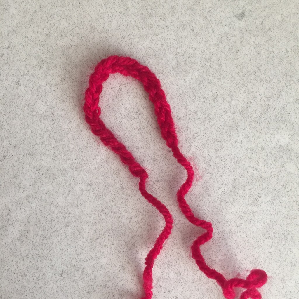 Next make the loop for the top of the tree using a 4mm hook and red wool: