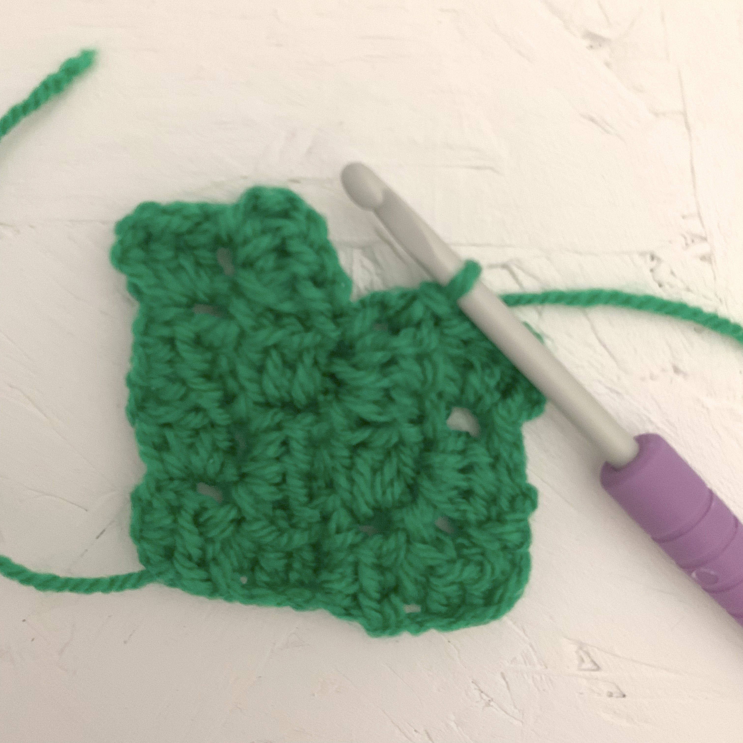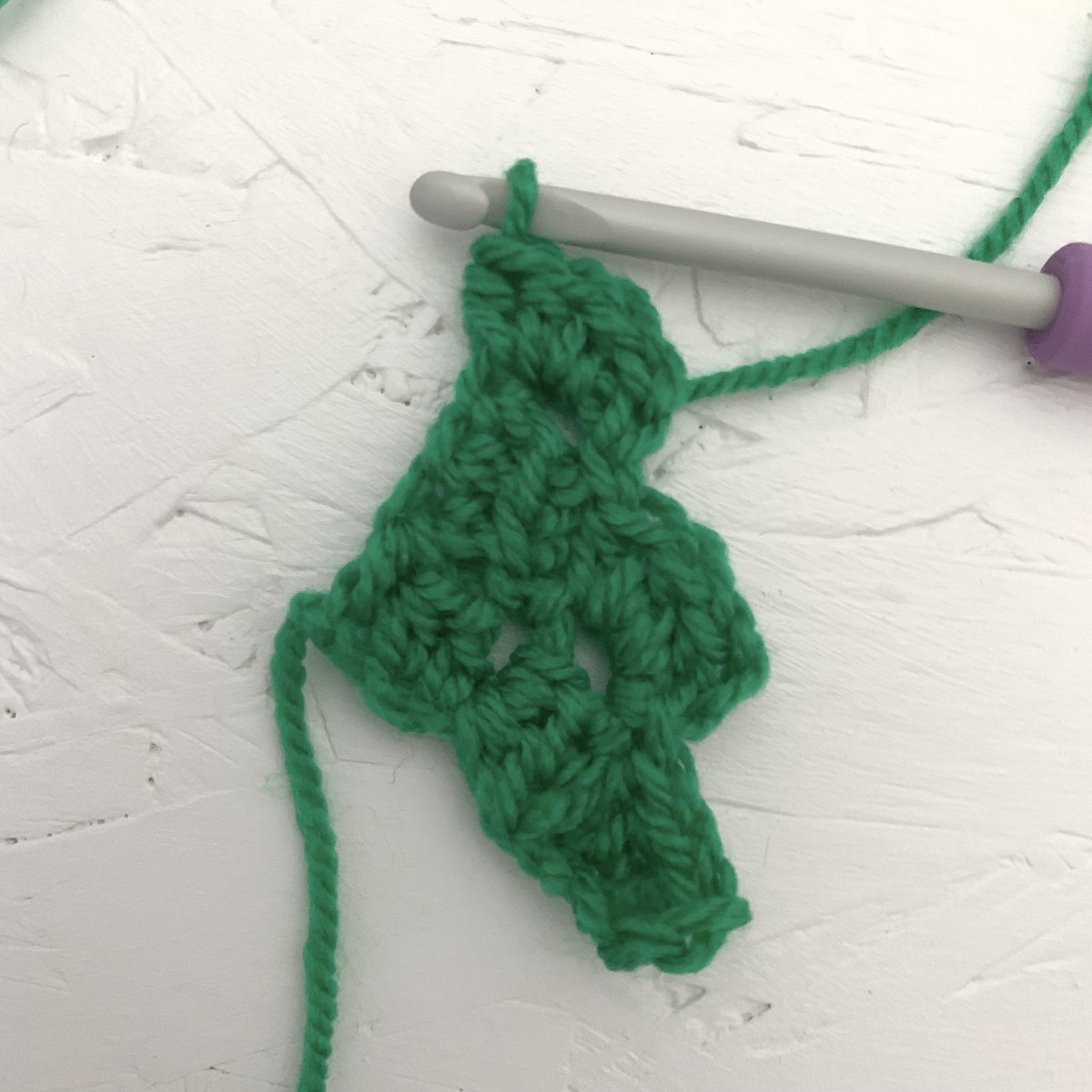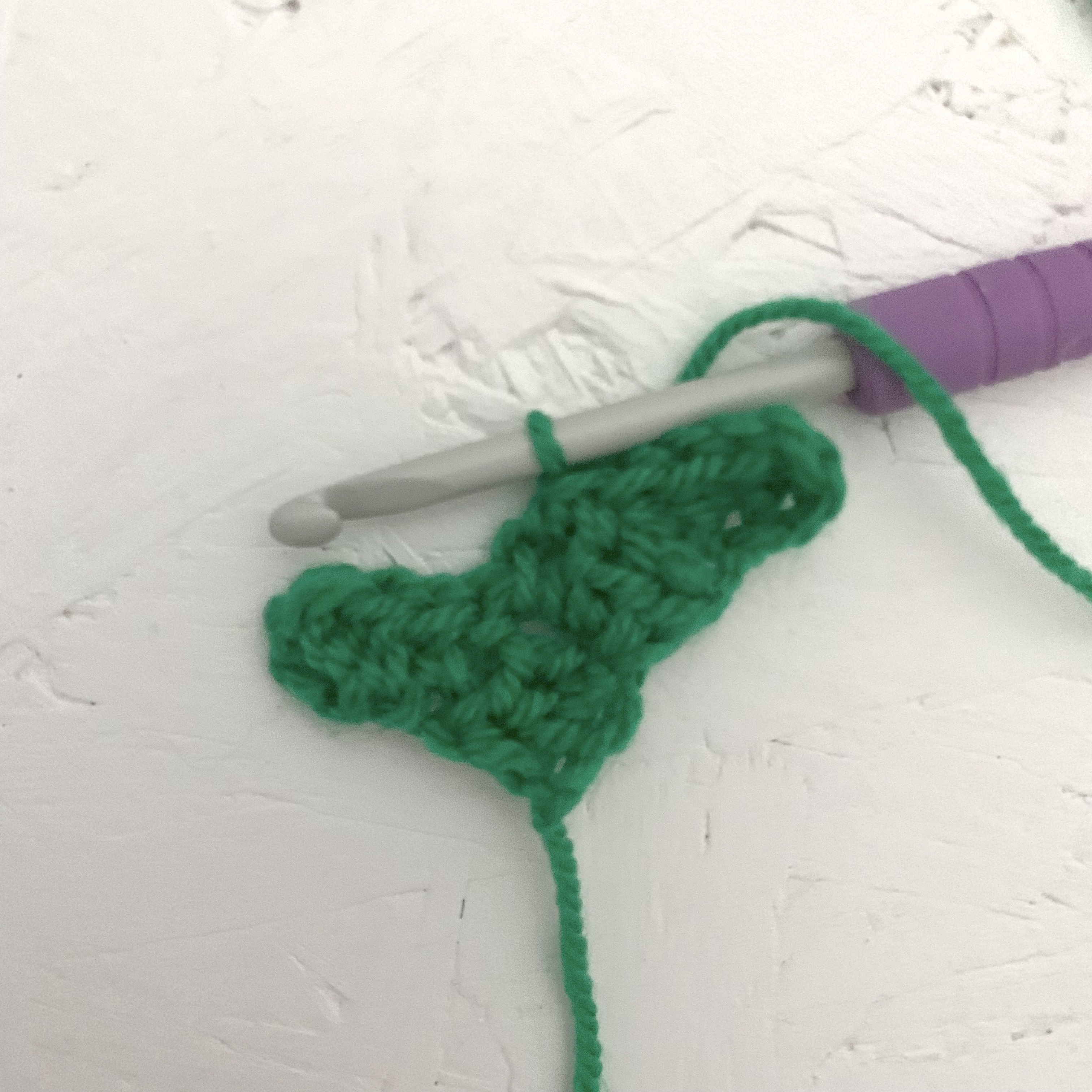 To decrease at the start of a row complete 3 slip stitches (one into each of the 3 htr(UK)/hdc(US) ends)(picture 1) and a slip stitch into the ch gap (picture 2). Next complete a ch2 (picture 3) and 3htr(UK)/hdc(US) into the ch gap (picture 4) and then continue the row in the same way as row 2 (picture 4).