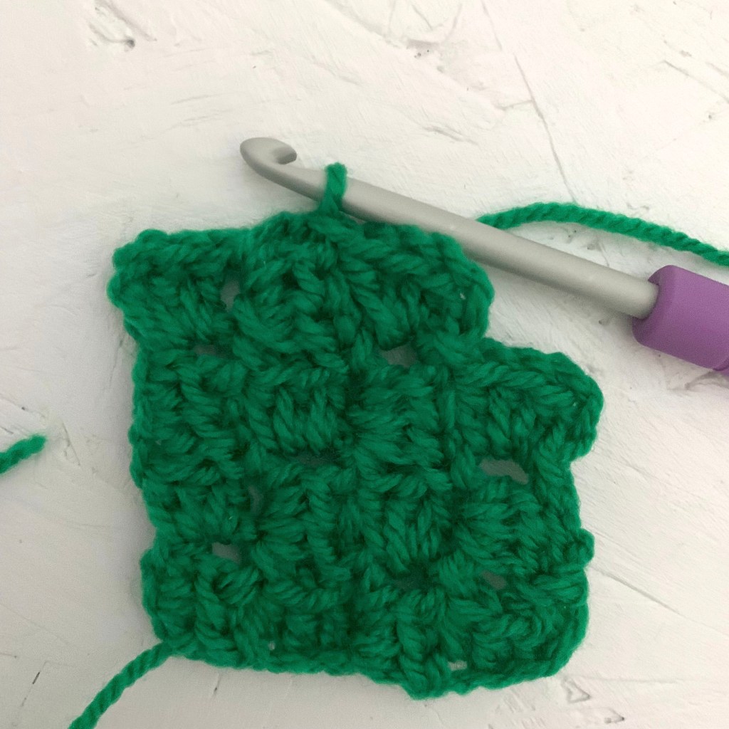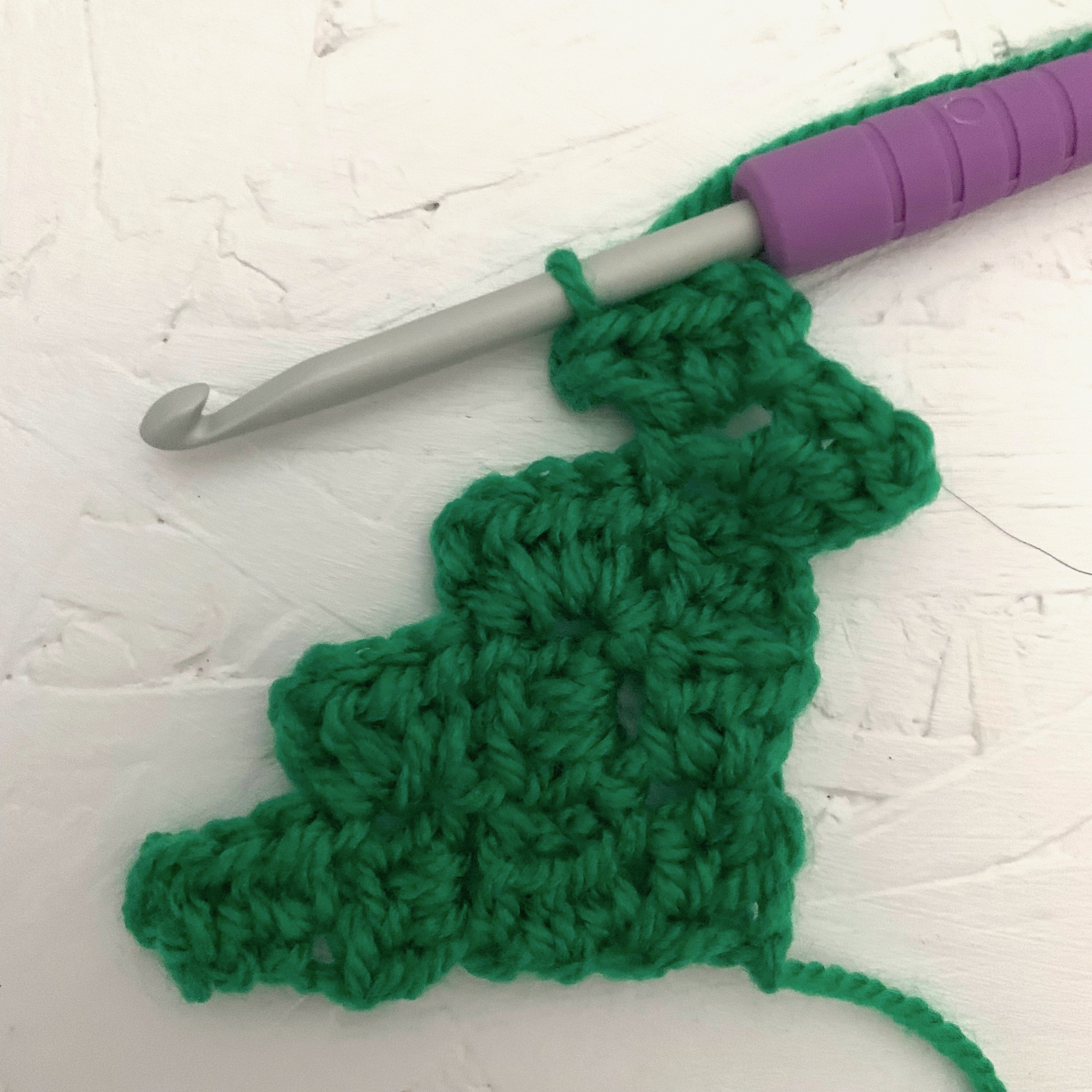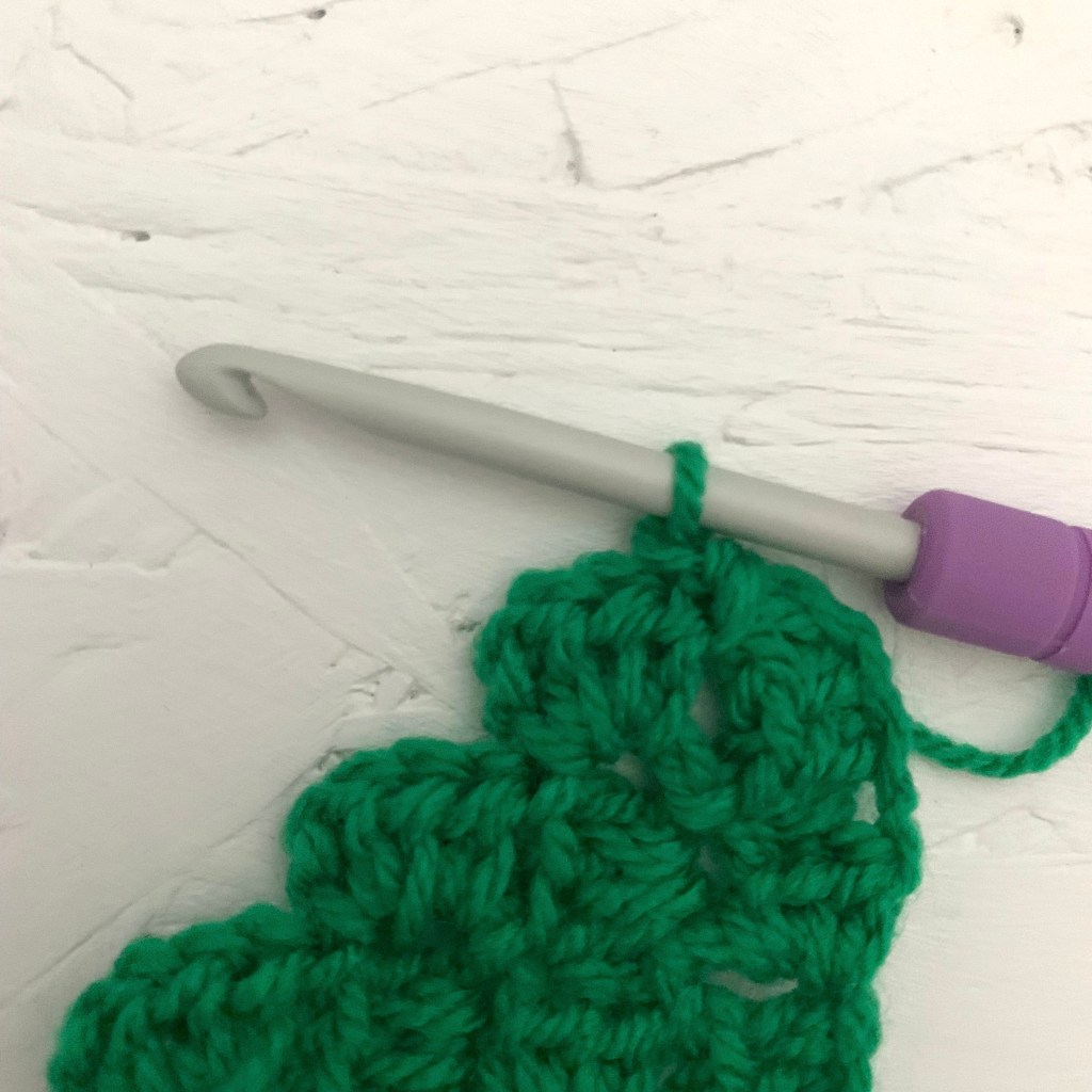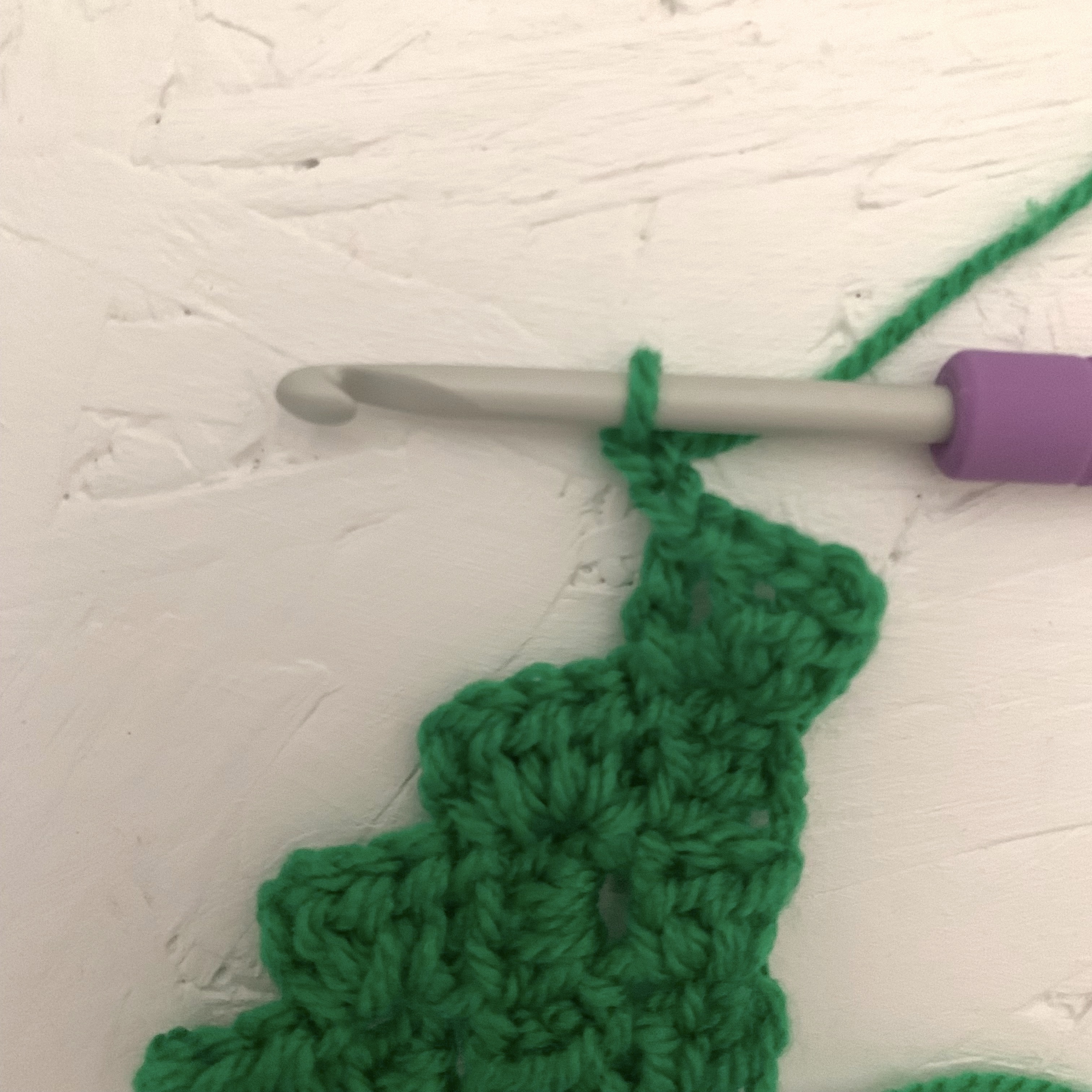To decrease at the start of a row complete 3 slip stitches (one into each of the 3 htr(UK)/hdc(US) ends)(picture 1) and a slip stitch into the ch gap (picture 2). Next complete a ch2 (picture 3) and 3htr(UK)/hdc(US) into the ch gap (picture 4) and then continue the row in the same way as row 2 (picture 4).