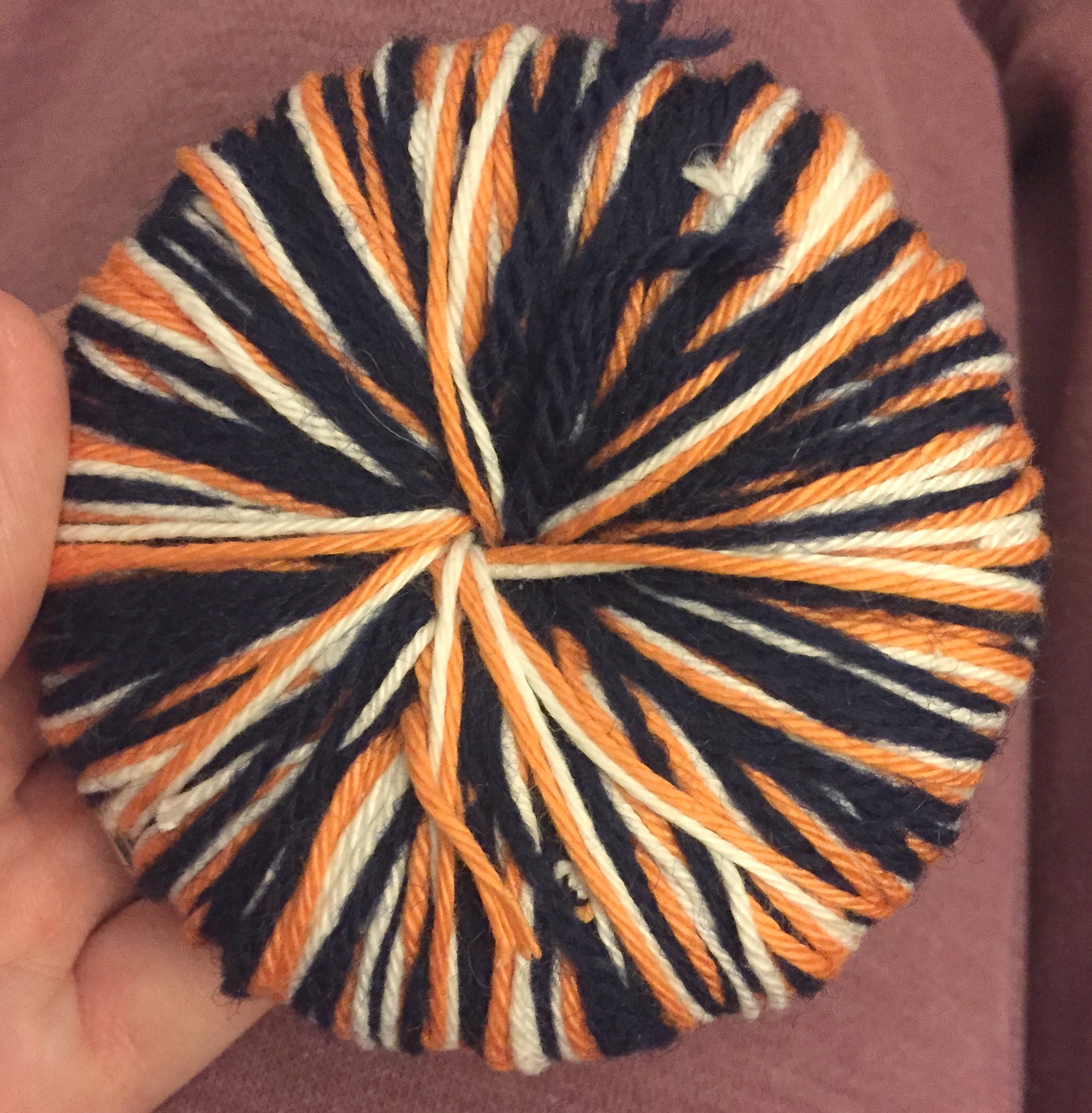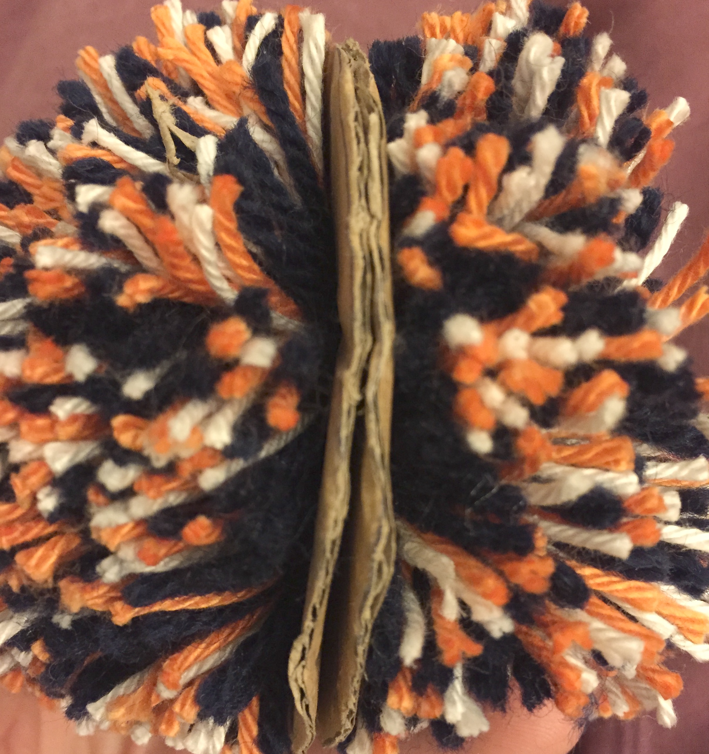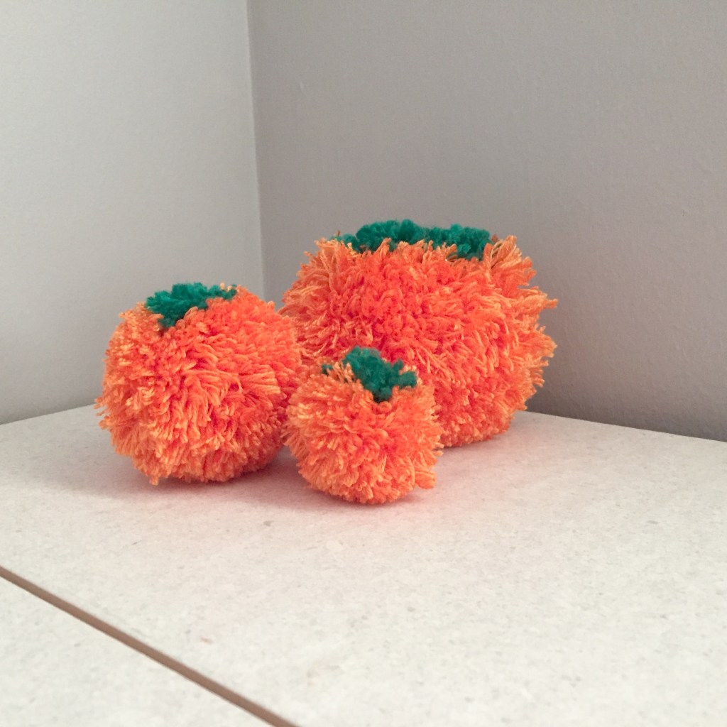 - You can make pumpkin themed pom poms by wrapping green wool only around the top middle section of the cardboard circle, and wrapping orange wool around the rest of the circle.