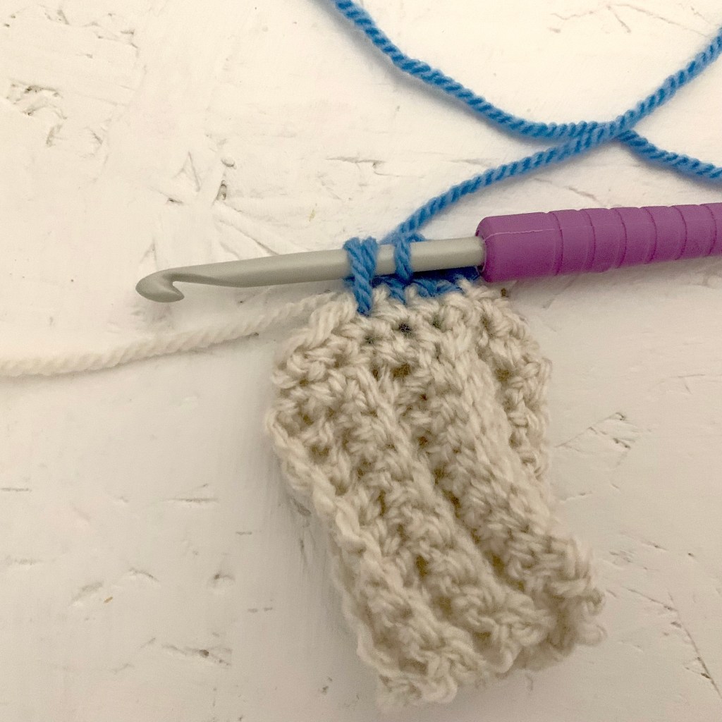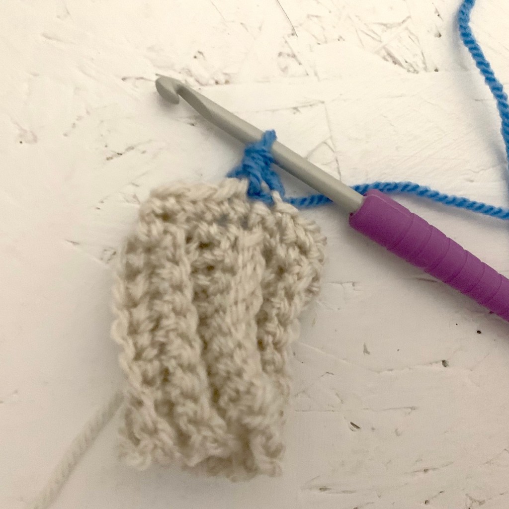Rows 2-38: ch1 (doesn’t count as a stitch) in back loops only; sc along row (ribbed stitch how to can be found here).