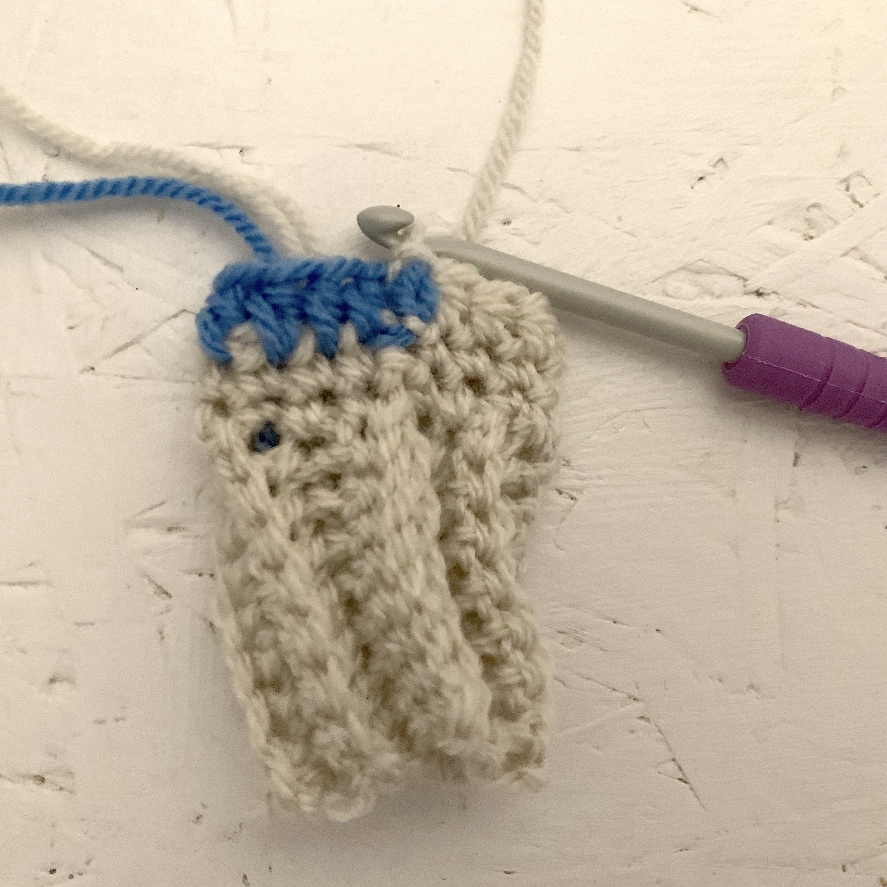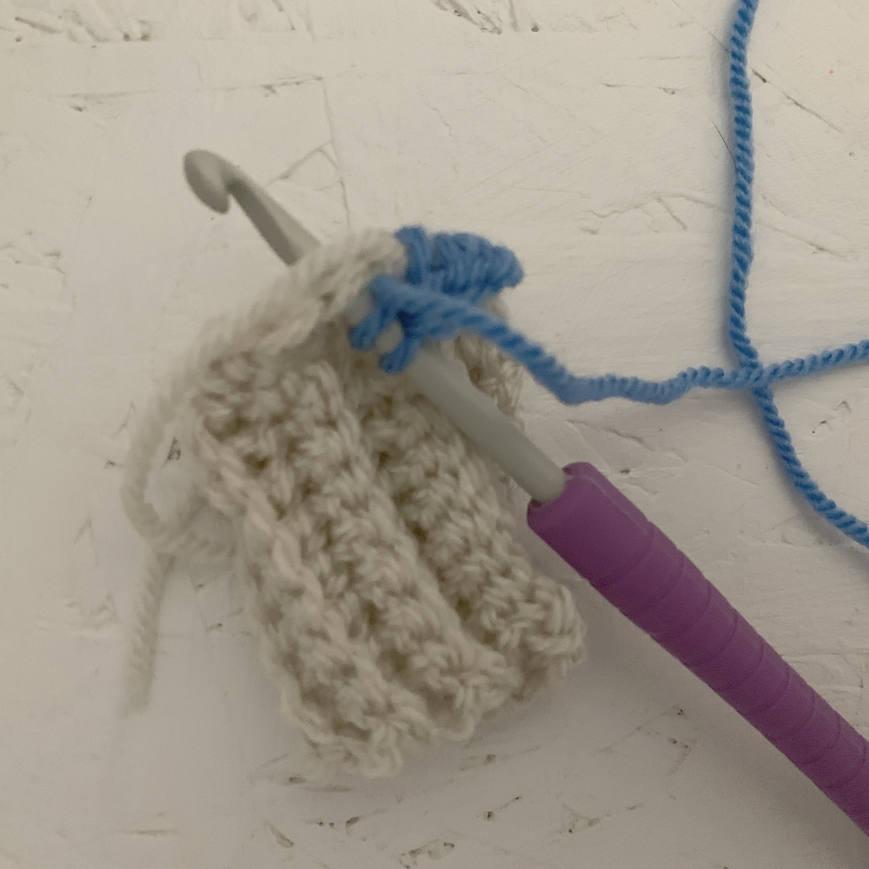 Round 1: ch1 (doesn’t count as a stitch) sc around into ends of the previous rows (38sc), ss into sc at the start of the round.