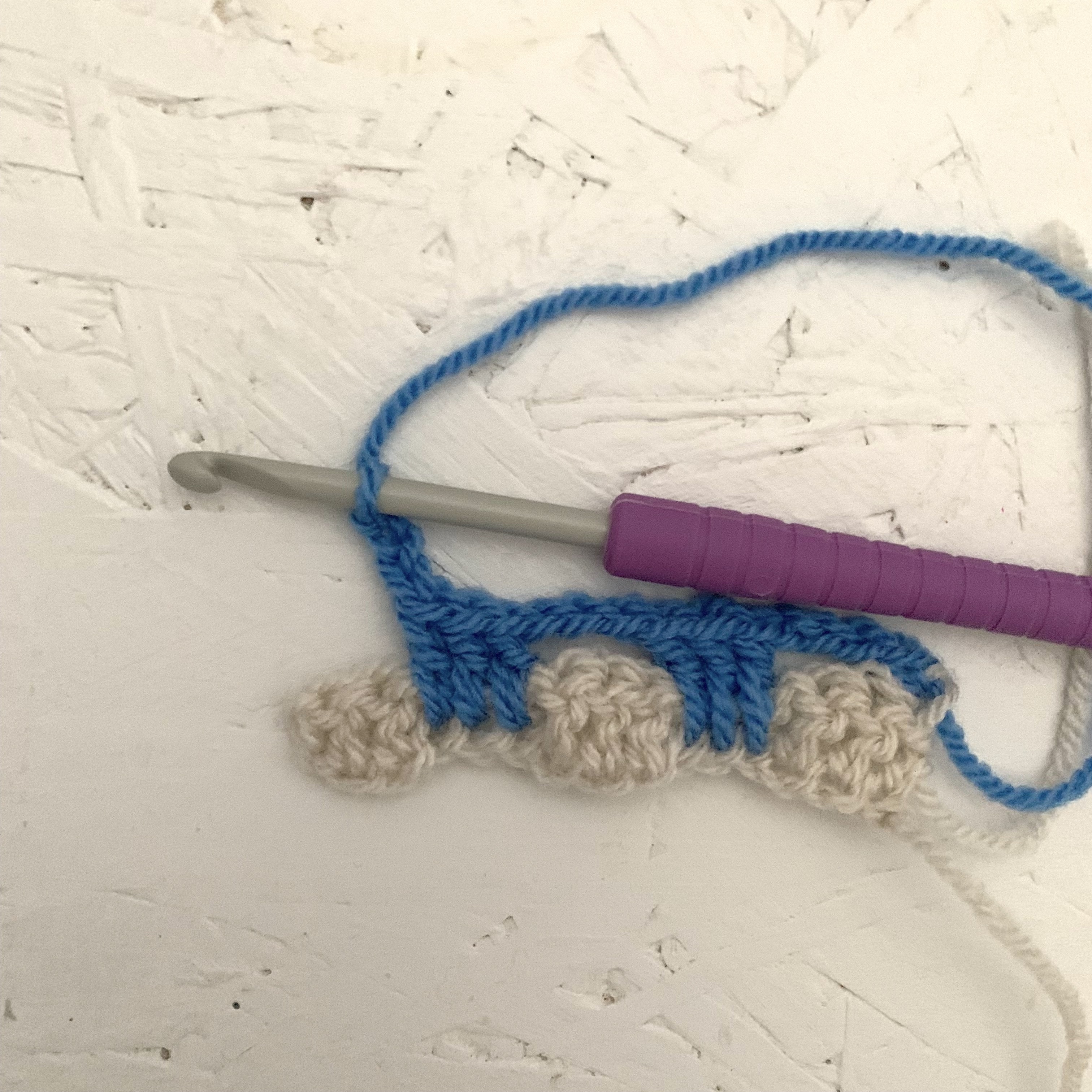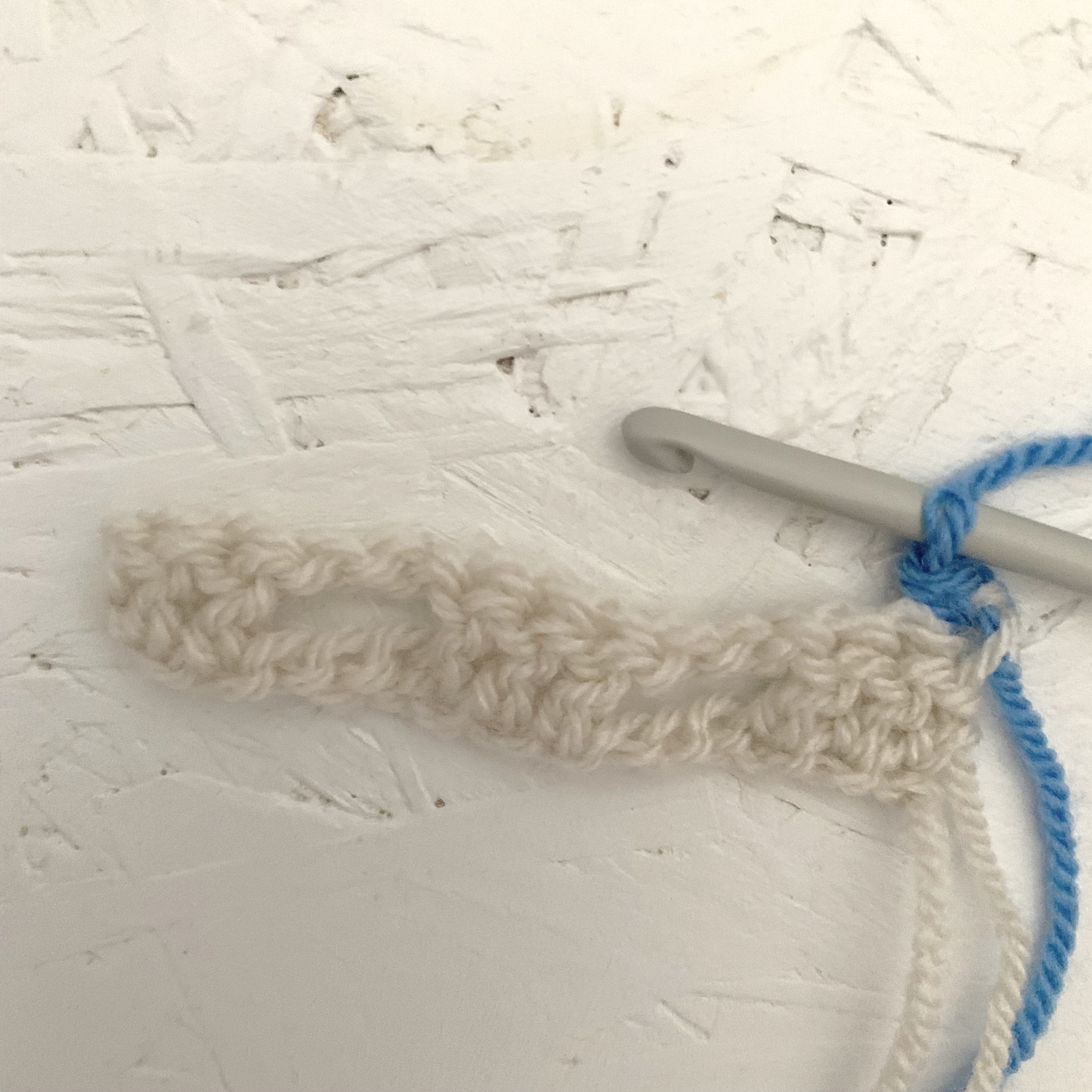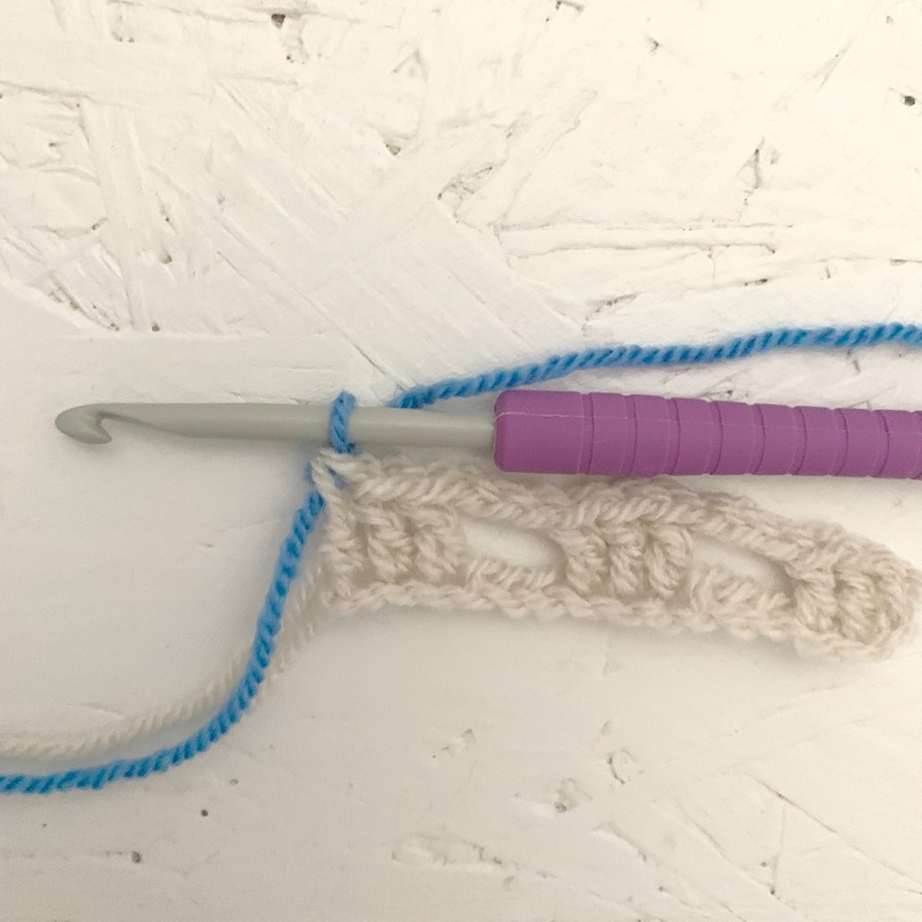 Row 2: ch1 (doesn’t count as a stitch) sc, ch3, skip 2, 3tr/dc – one into each stitch two rows below *ch3, skip 3, 3tr/dc – one into each stitch two rows below. Repeat from * along row, until 3 stitches remain (the 2tr/dc and ch3 at start of previous row), ch3, skip 2, sc into top of ch3 at start of previous row.