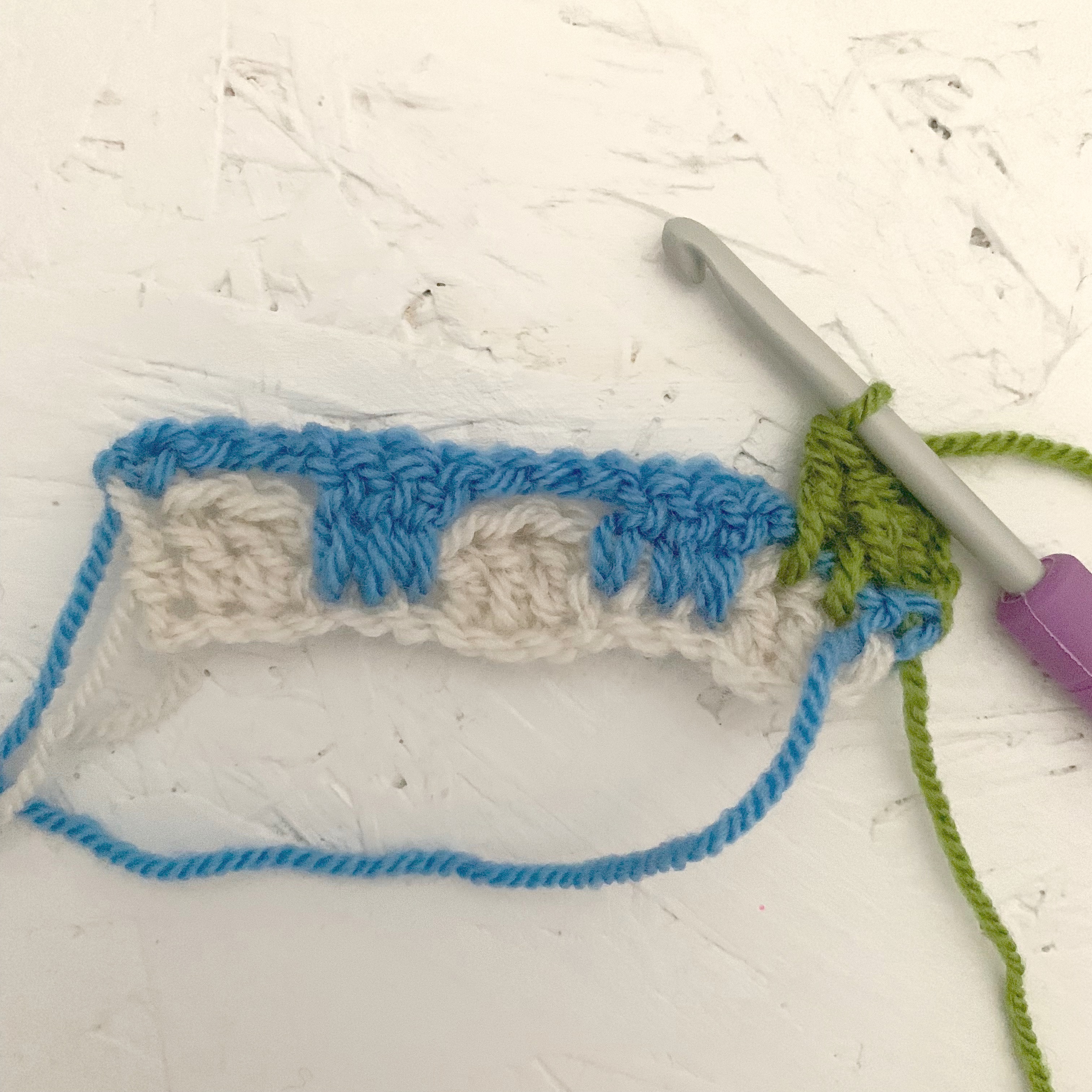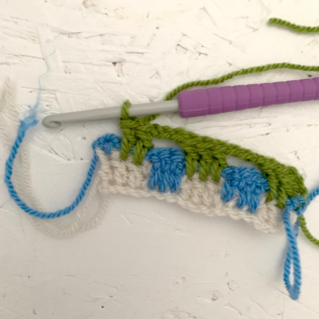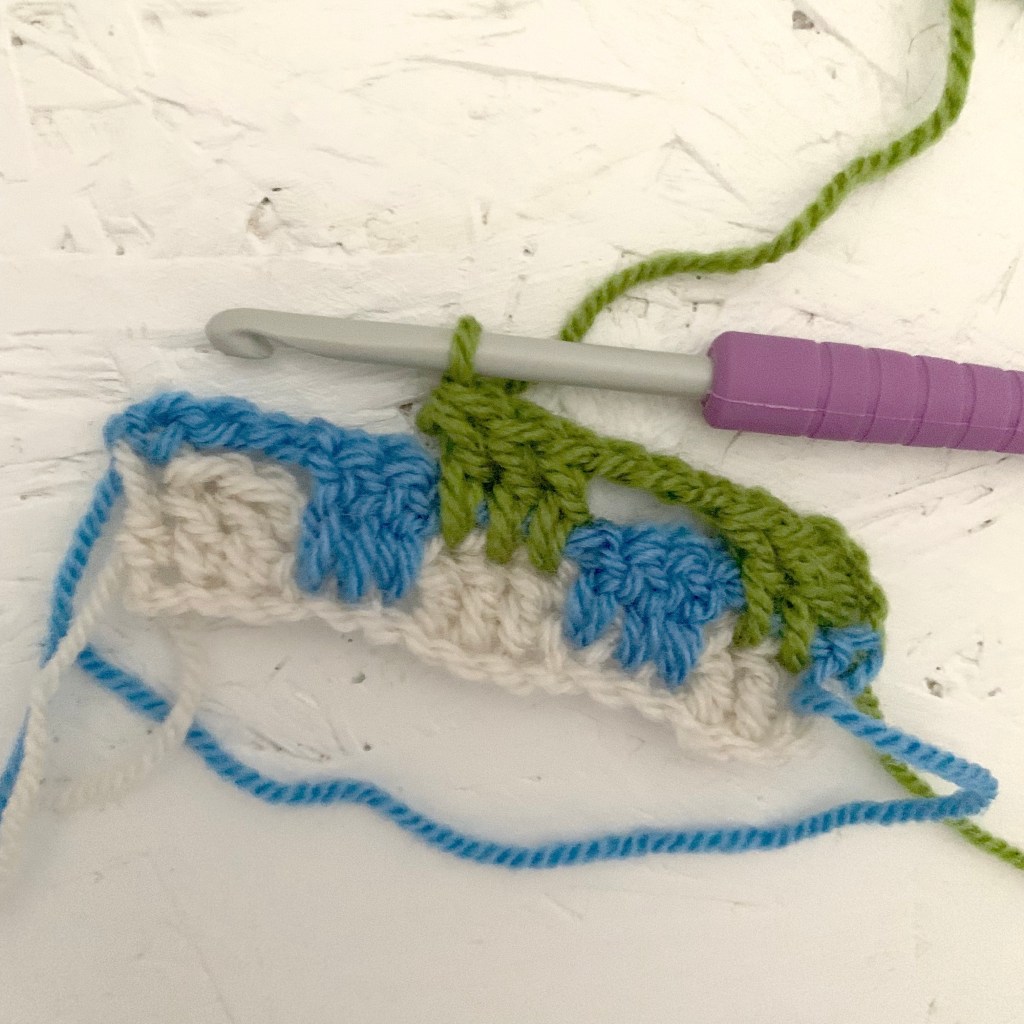 Row 2: ch1 (doesn’t count as a stitch) sc, ch3, skip 2, 3tr/dc – one into each stitch two rows below *ch3, skip 3, 3tr/dc – one into each stitch two rows below. Repeat from * along row, until 3 stitches remain (the 2tr/dc and ch3 at start of previous row), ch3, skip 2, sc into top of ch3 at start of previous row.