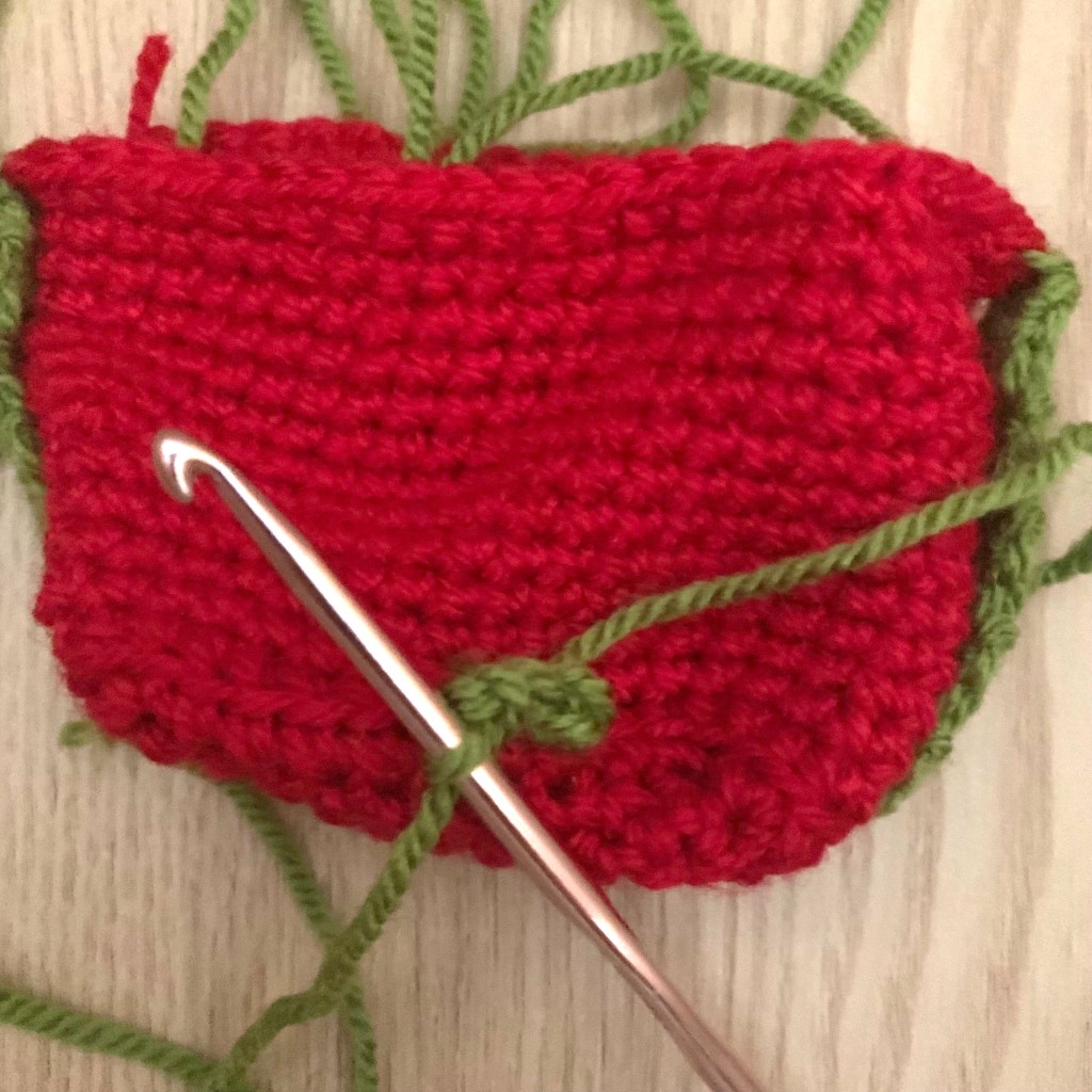 Round 1: sc down the side edge (12sc – one into each row end), along the bottom edge (12sc), up the other side (12sc – one into each row end) and along the top edge (12sc)(each corner will have 2sc).
