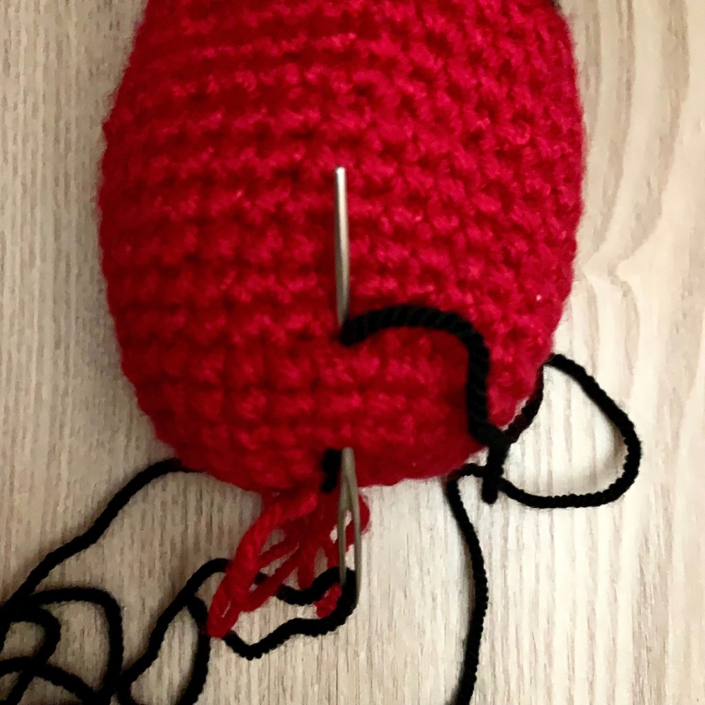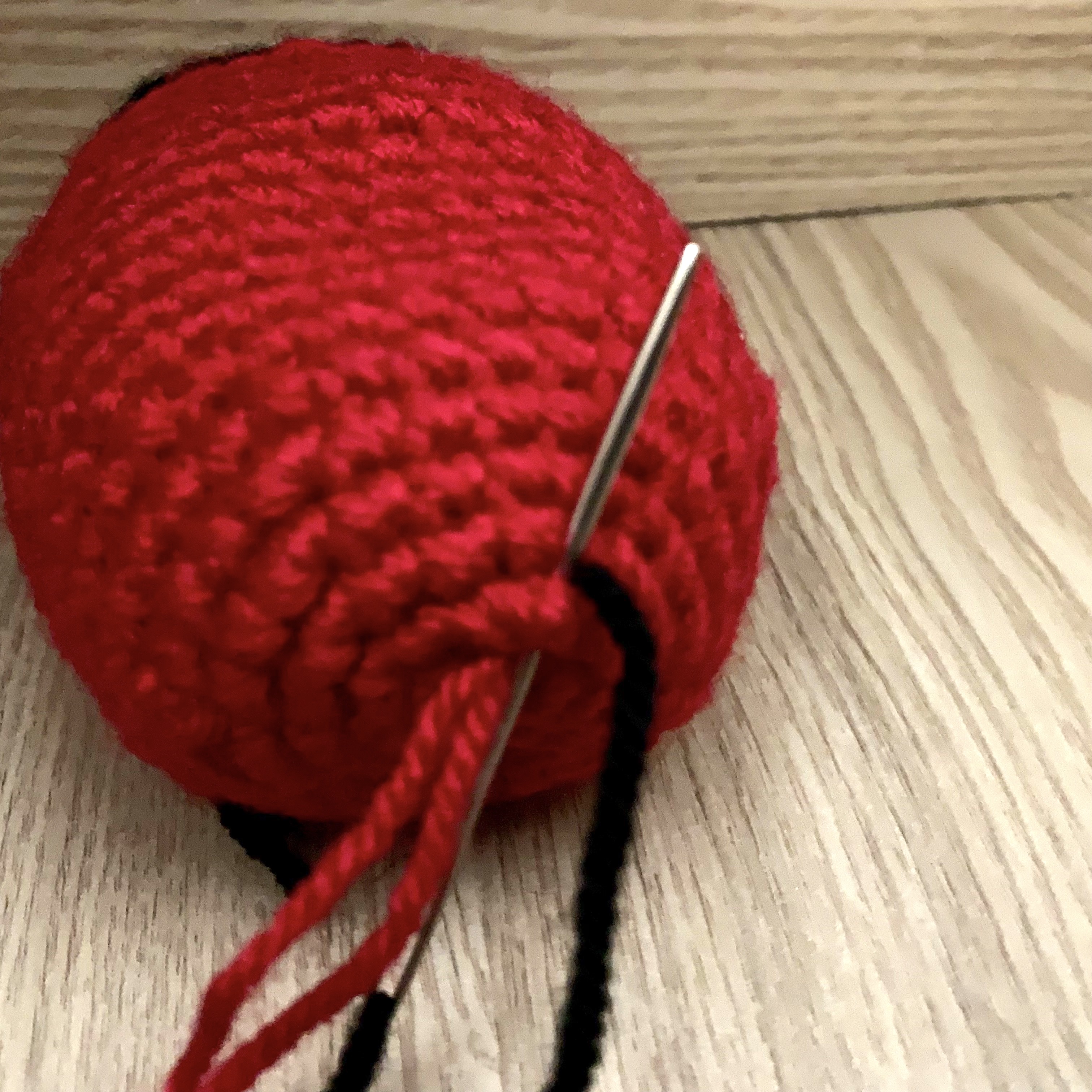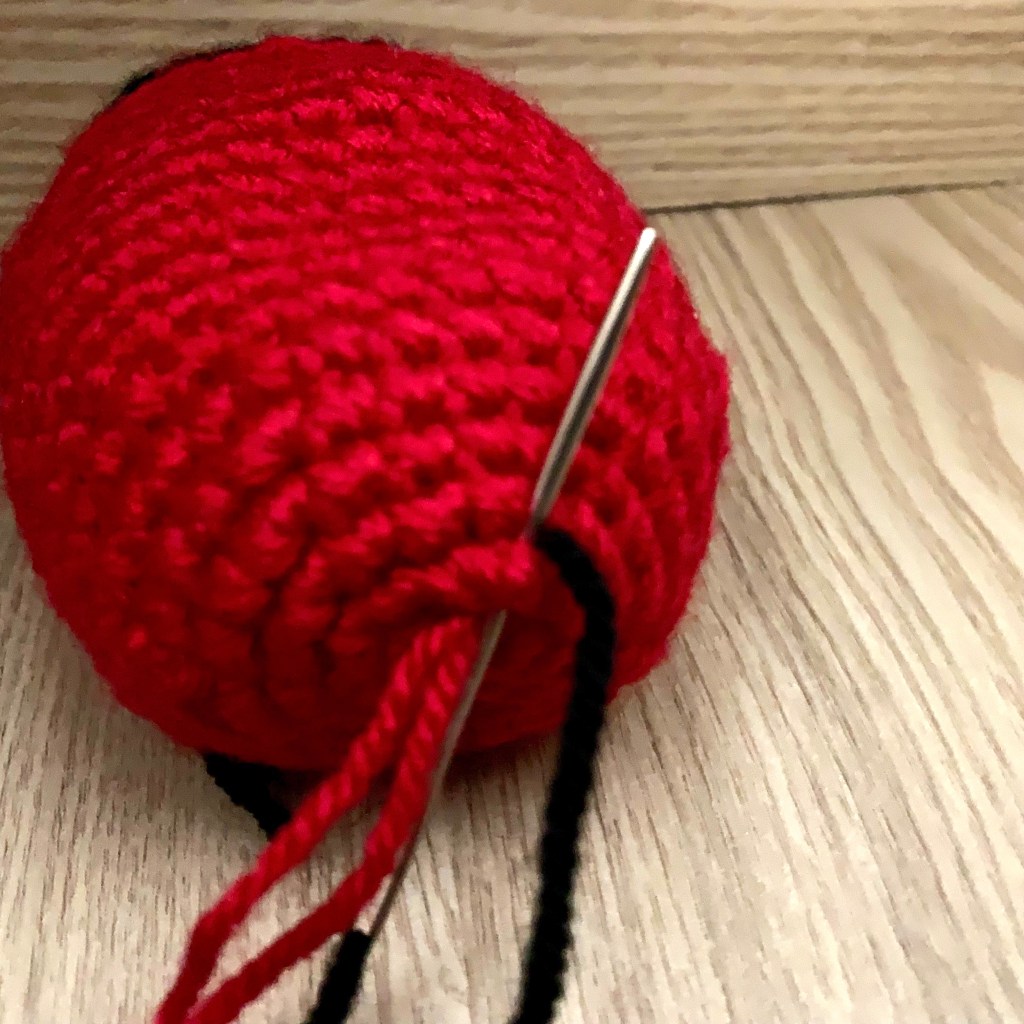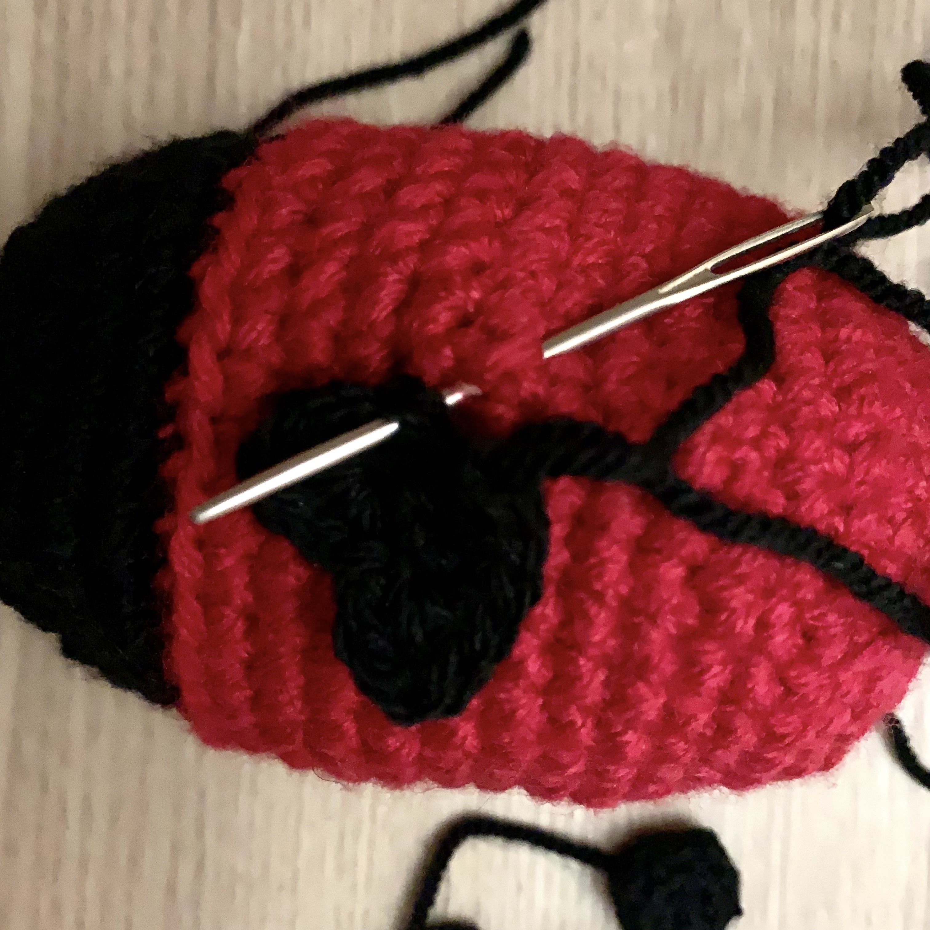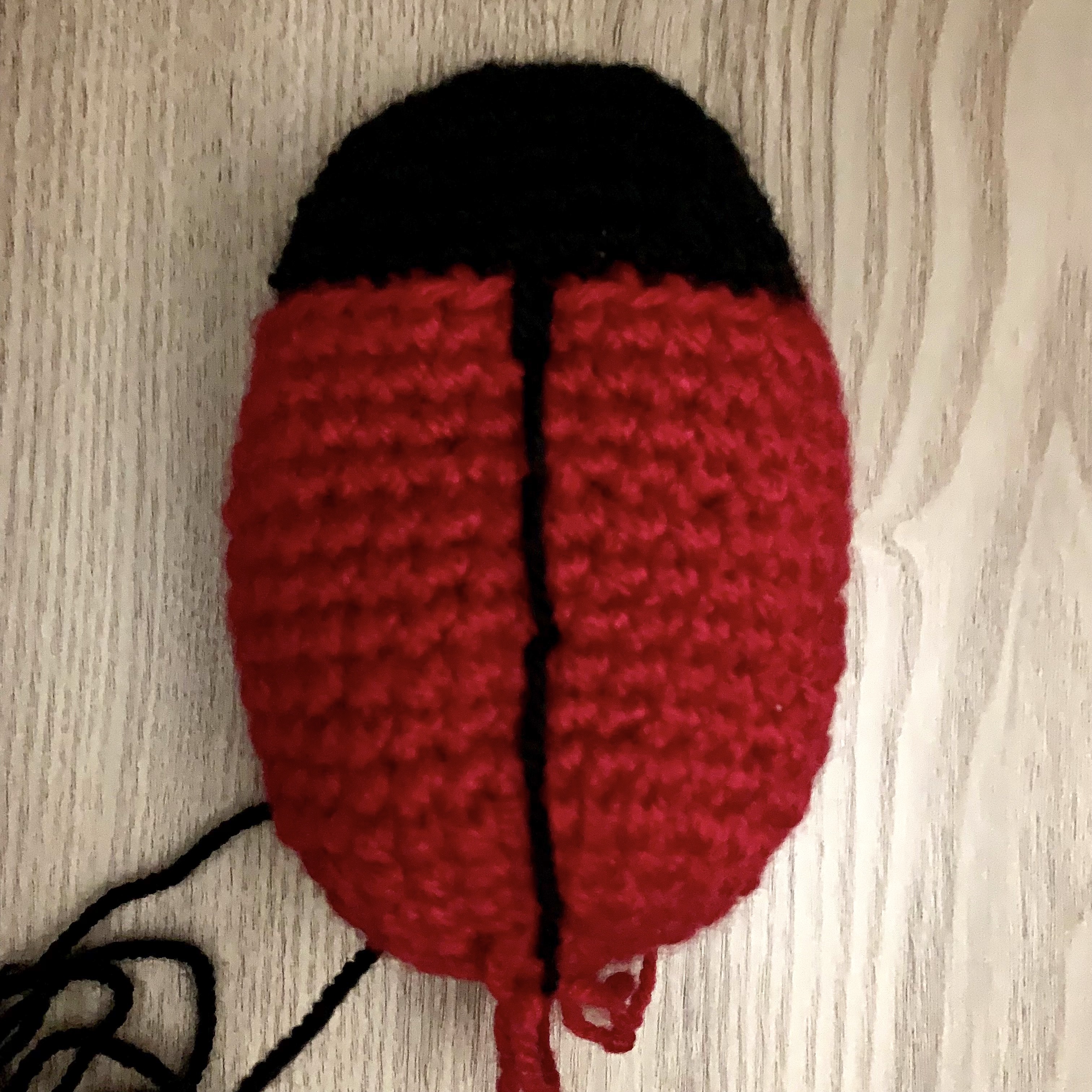 - Using black wool cast on at the bottom of the ladybird/ladybug and sew a line up the middle of the back of the ladybird/ladybug.