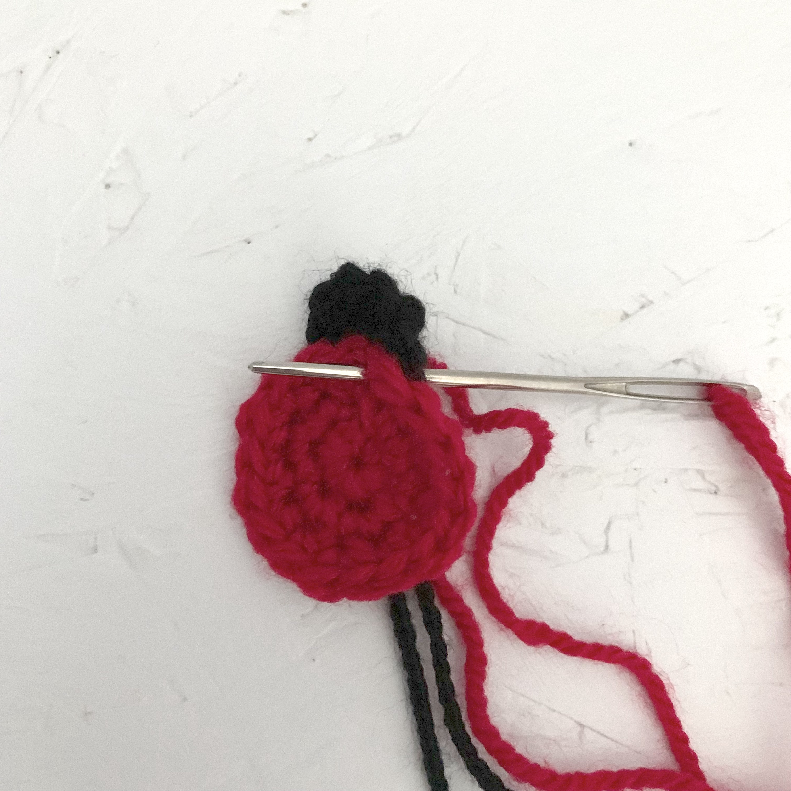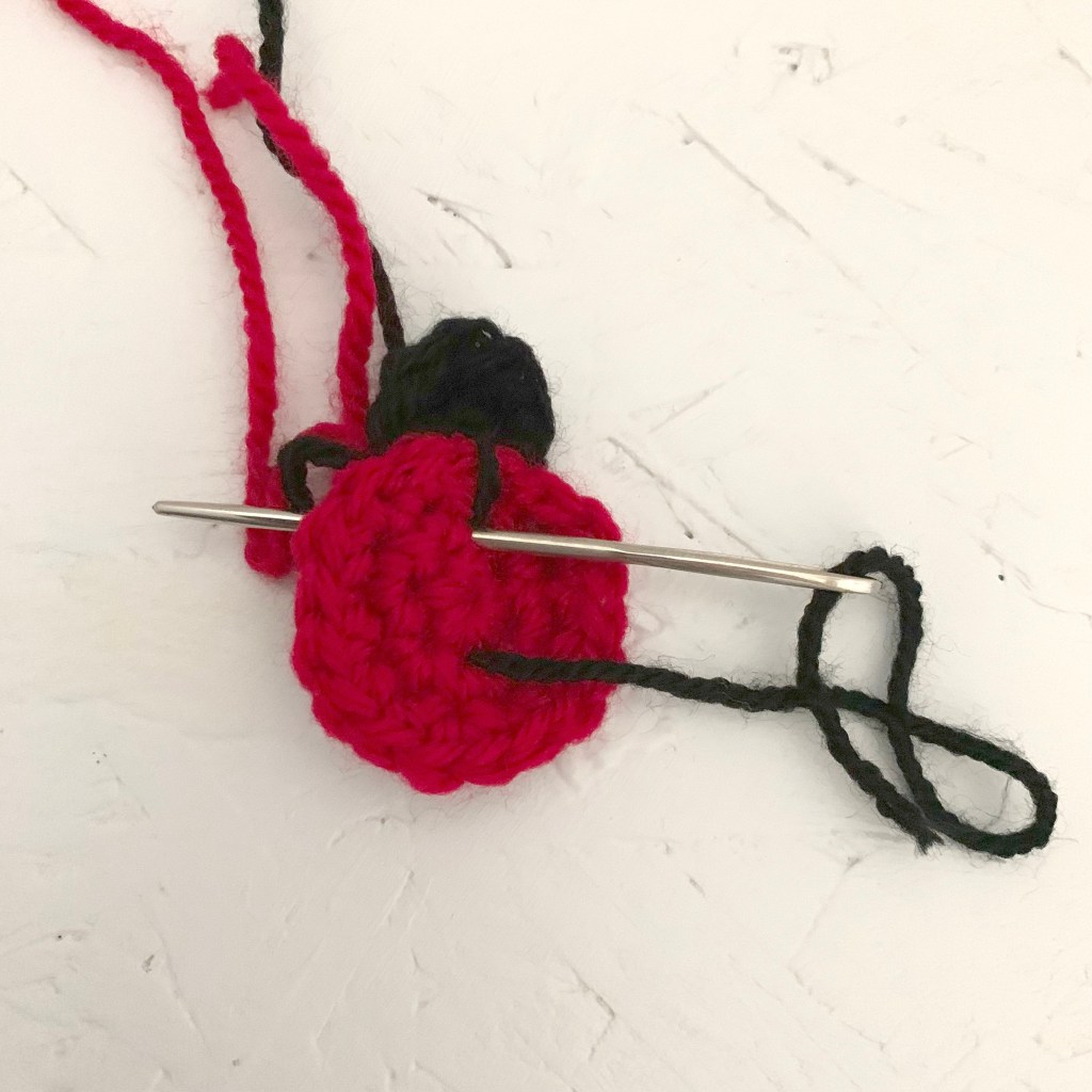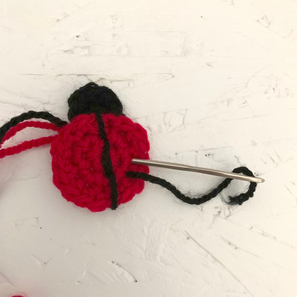 Using black wool sew three stitches down the middle of the body, then sew four spots (2 each side).