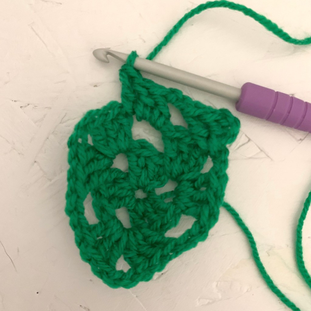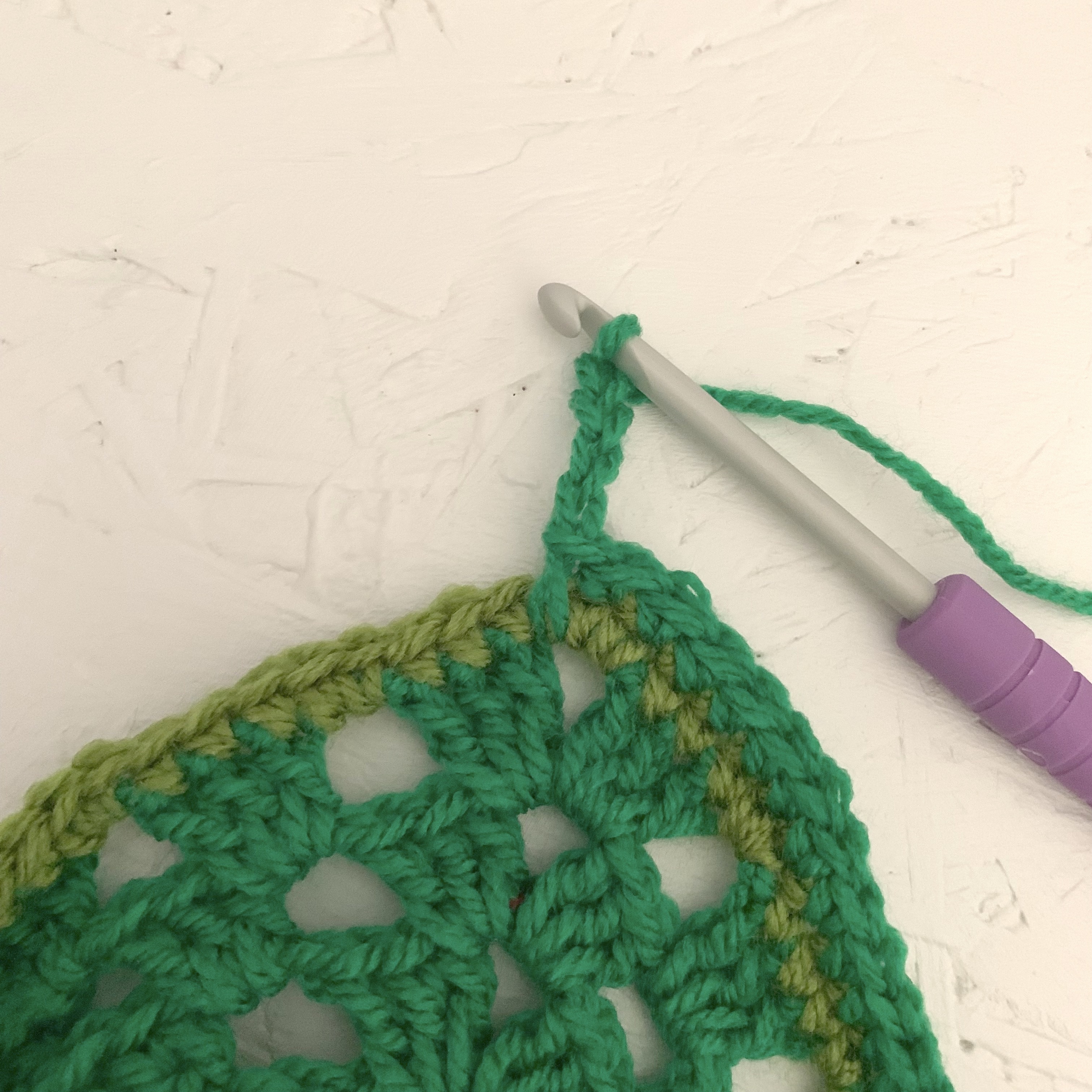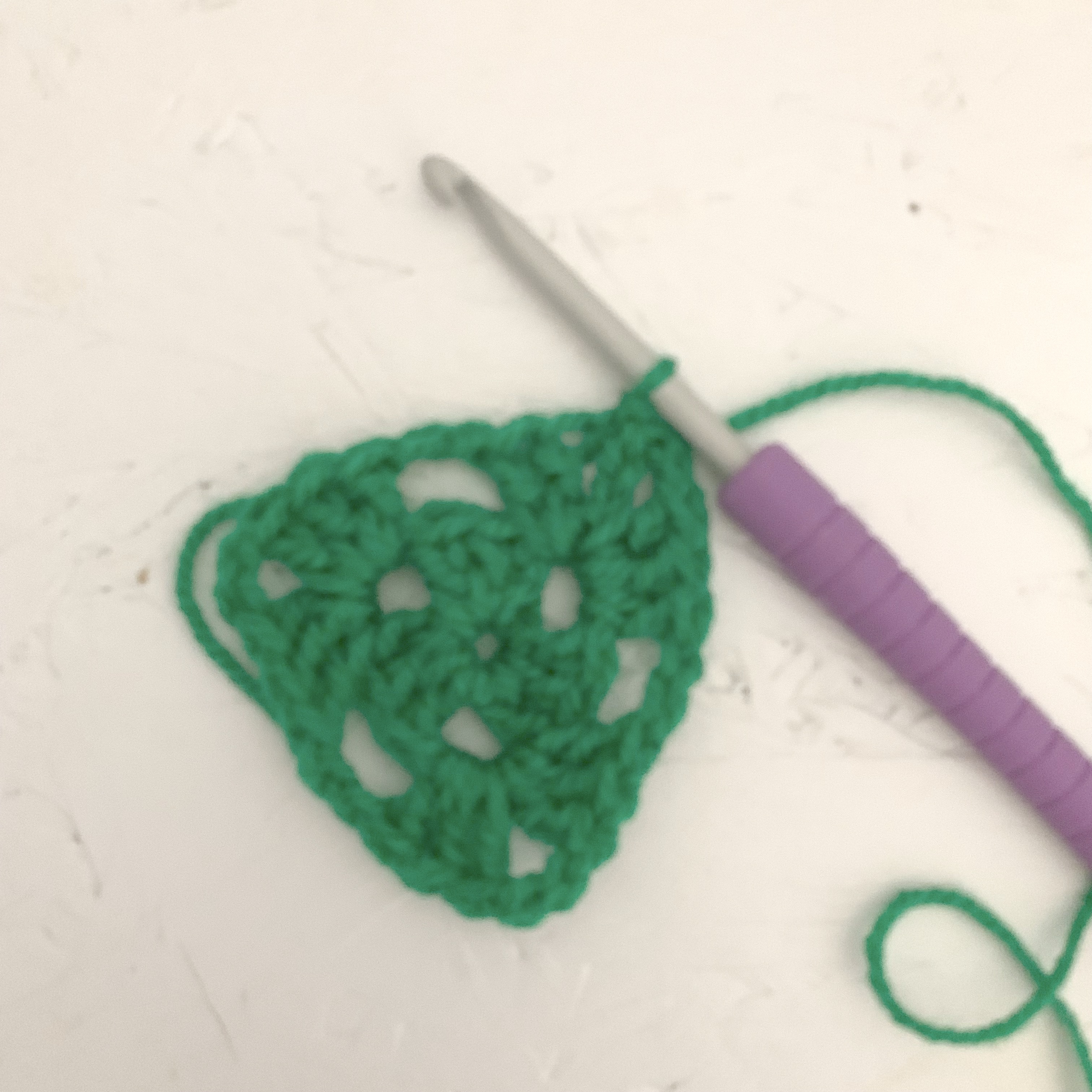 Round 5: ch3, 2tr/dc into ch2 gap, *(ch2, 3tr/dc into ch2 gap) three times, ch2, (3tr/dc, ch2, 3tr/dc) into ch2 gap. Repeat from * once more. (ch2, 3tr/dc into ch2 gap) three times, ch2, (3tr/dc, ch2) into ch2 gap. ss into top of ch3 at start of the round. Change to green during ss.