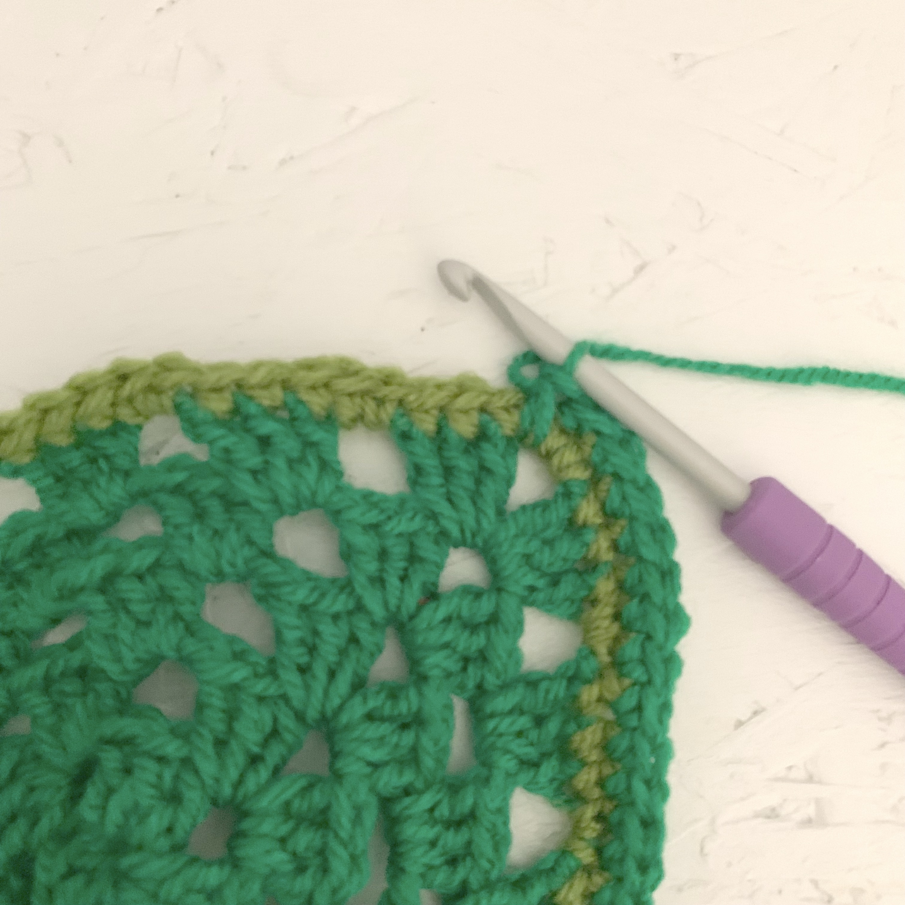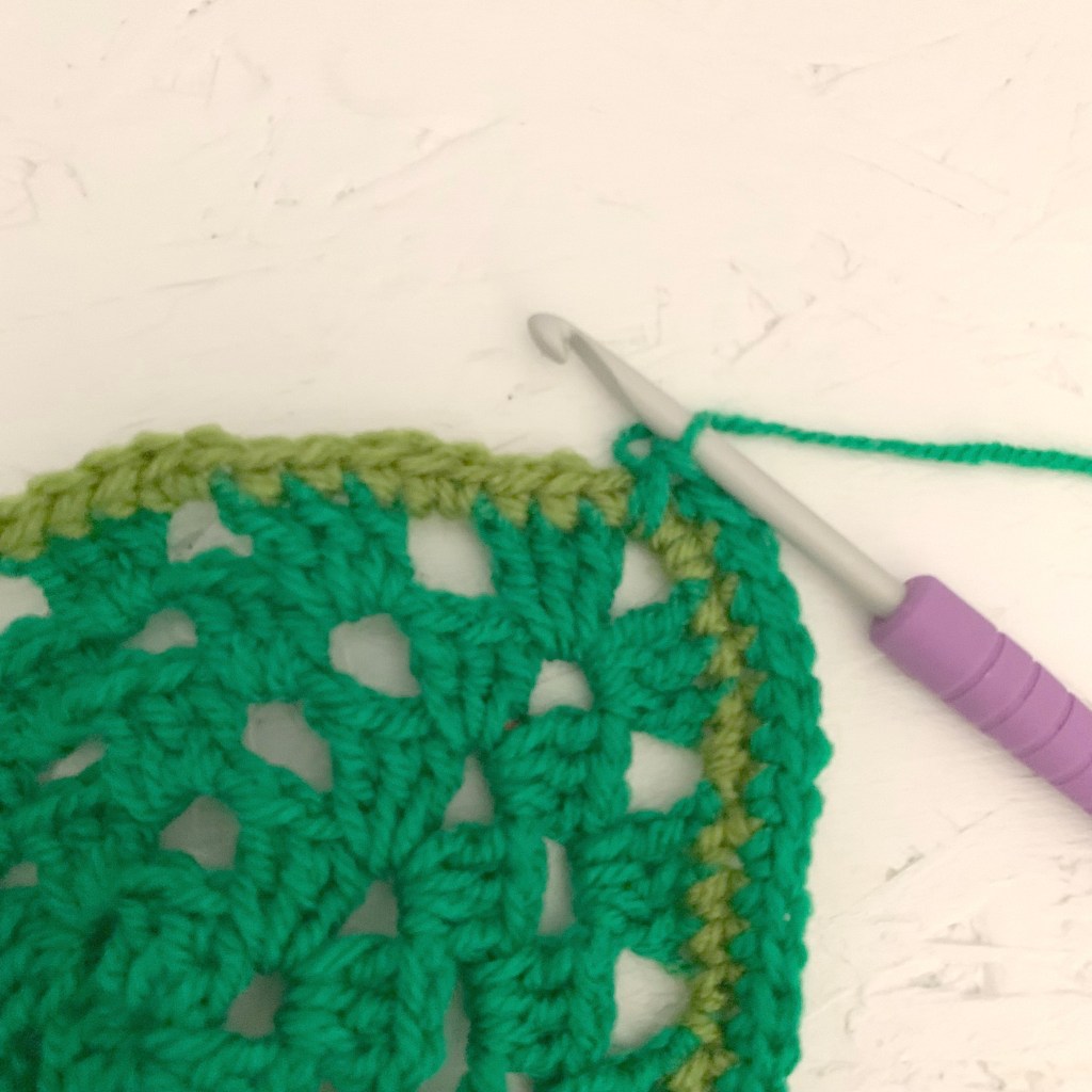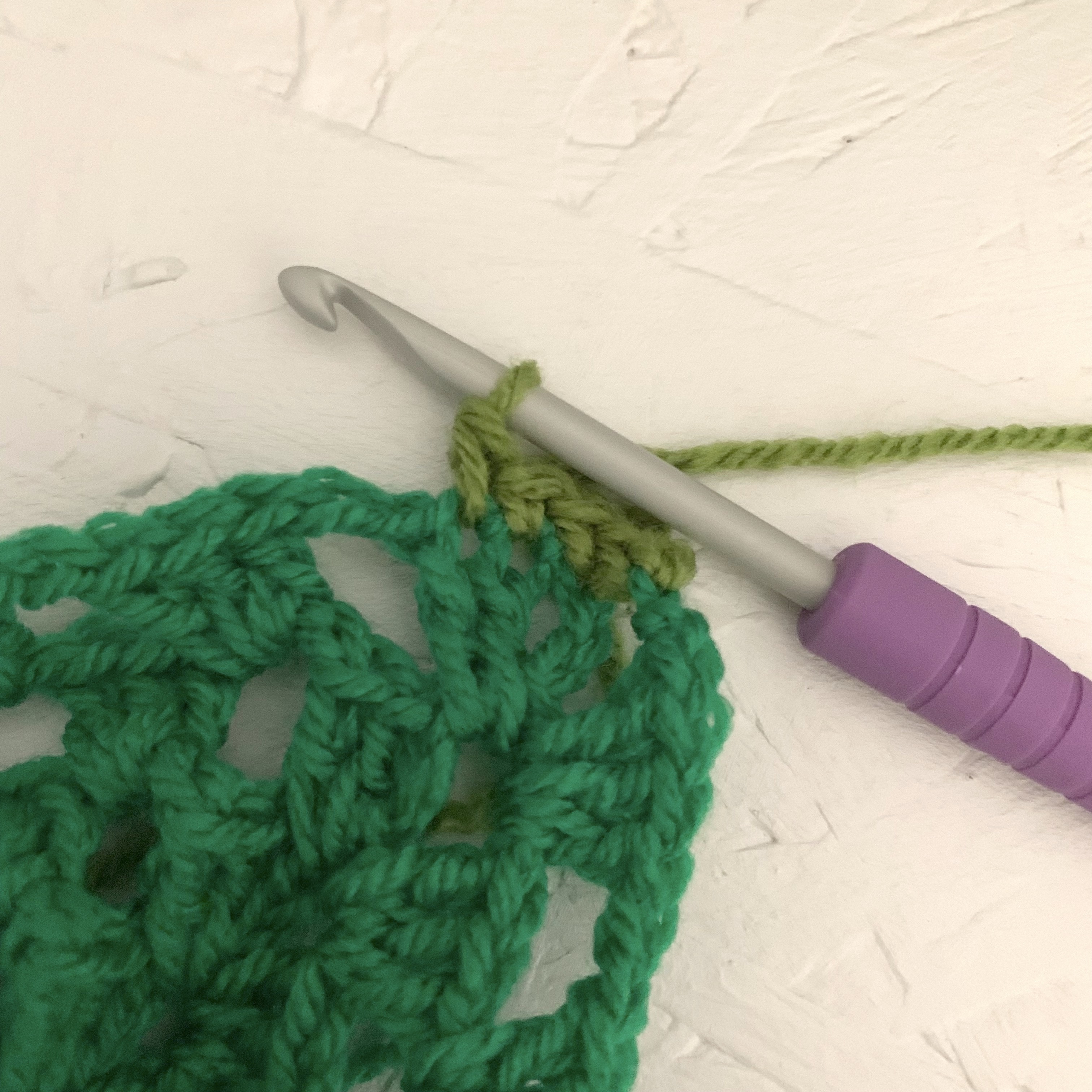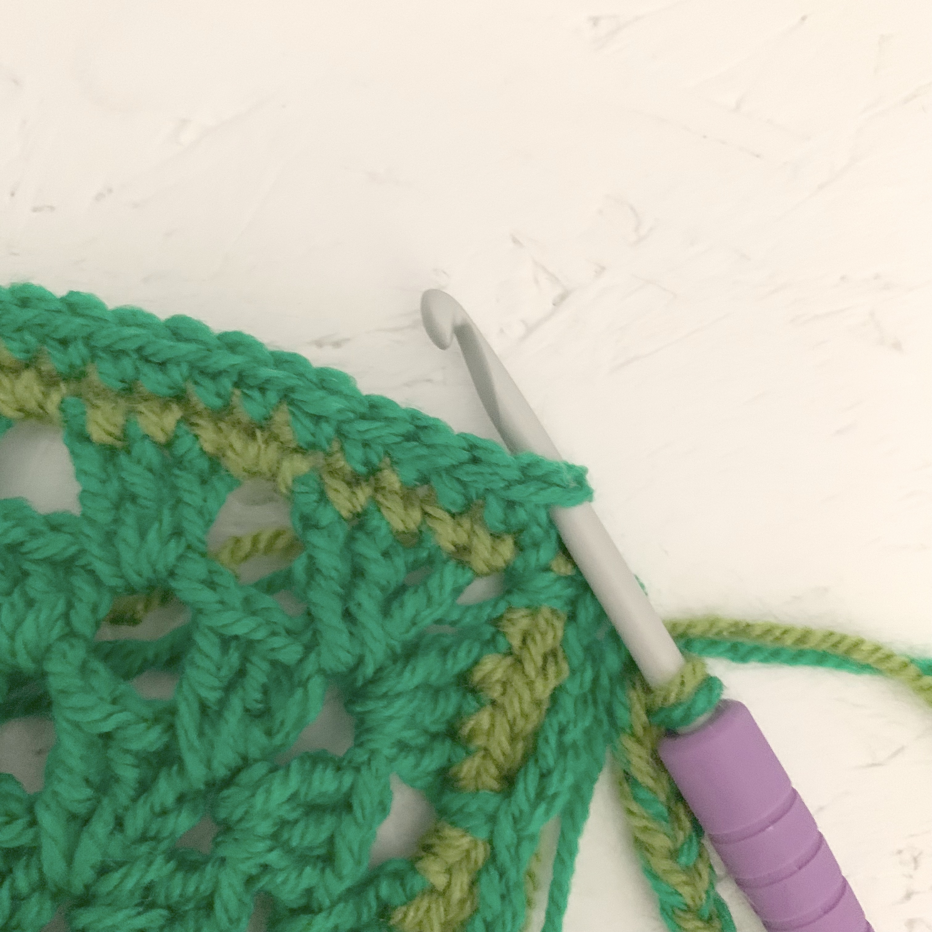 Round 5: ch3, 2tr/dc into ch2 gap, *(ch2, 3tr/dc into ch2 gap) three times, ch2, (3tr/dc, ch2, 3tr/dc) into ch2 gap. Repeat from * once more. (ch2, 3tr/dc into ch2 gap) three times, ch2, (3tr/dc, ch2) into ch2 gap. ss into top of ch3 at start of the round. Change to green during ss.