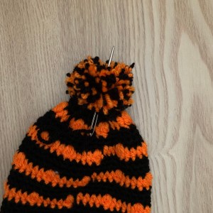 Sew the pom pom to the top of the golf club cover, by casting on at the top of the cover with orange wool and placing the pom pom at the top and sewing through the middle of the pom pom and back through to the top of the cover a few times. Fasten off.