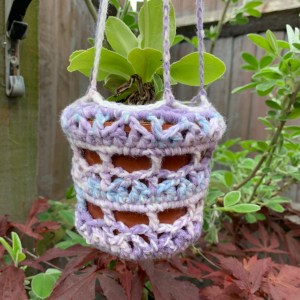 Following on from my previous hanging plant baskets (a crochet granny stitch themed plant pot hanger, and a crochet basket effect plant pot hanger) I had another idea for a third. Rather than using just one colour for this one however, I decided to use a variegated wool which had some purples, blues and whites in it.