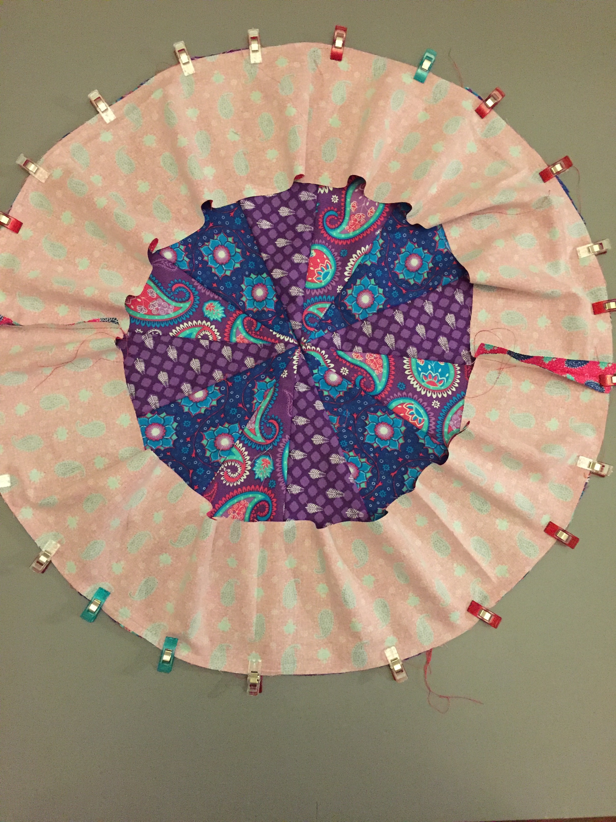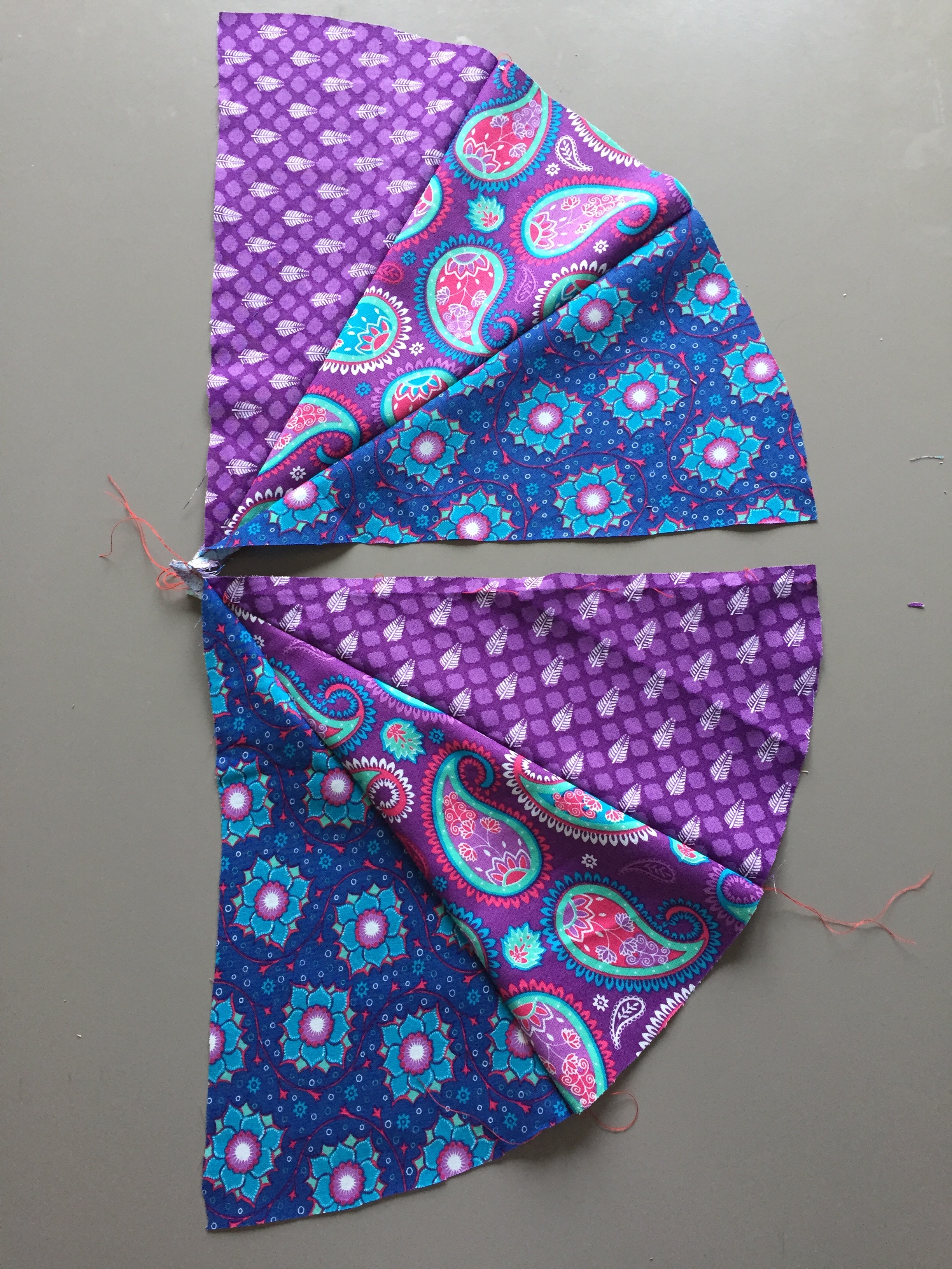 - Sew the pieces together: To make sewing together easier split the circle into four sections consisting of 3 fabric pieces, sew the pieces together to make the quarters, then sew 2 quarters together to make a half then join the two halves together. Repeat this with the remaining 12 pieces to make the back.