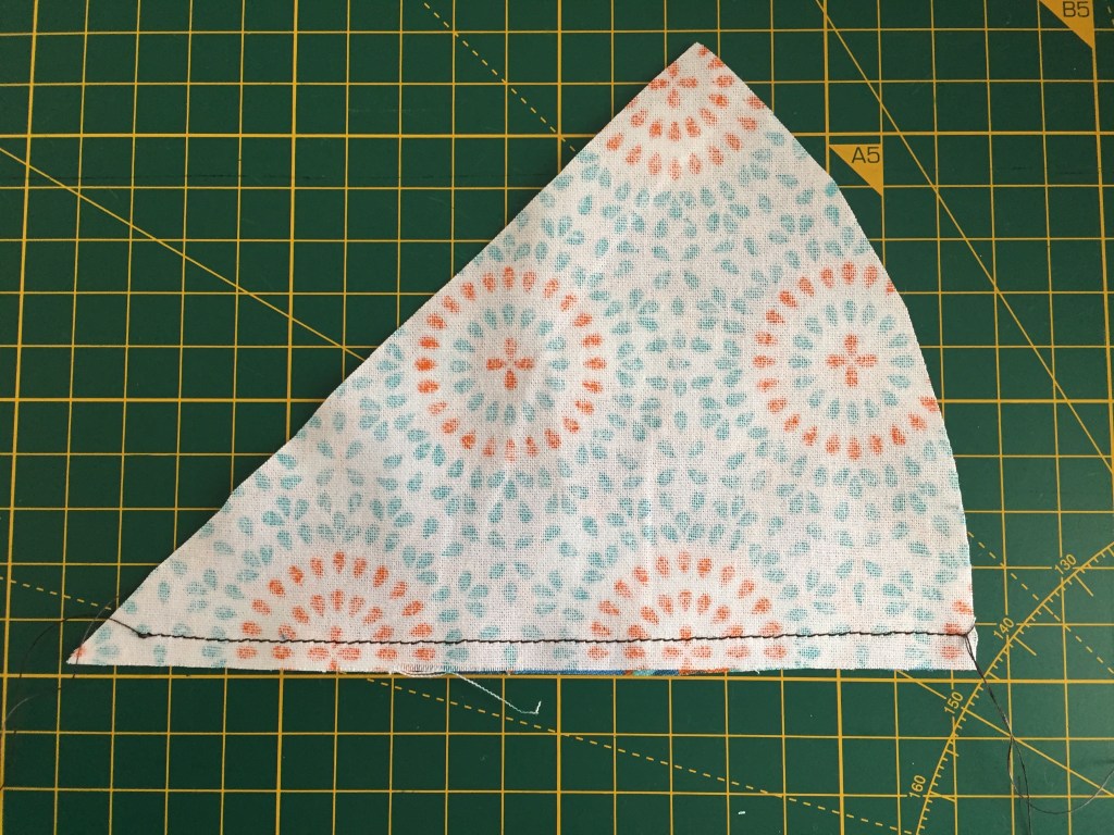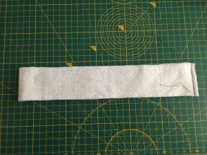 - Place the batting behind the fabric piece and fold the batting and fabric strip in half down its short edge with right sides together and sew down the short edge.
