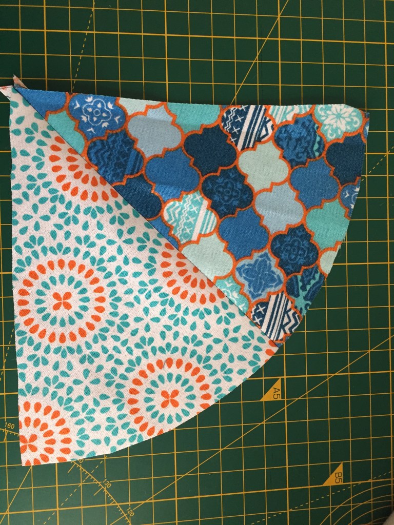- Take 8 of the fabric pieces (2 of each colour) and layout so that you have 2 halves consisting of one piece of each fabric colour which matching fabrics opposite each other.