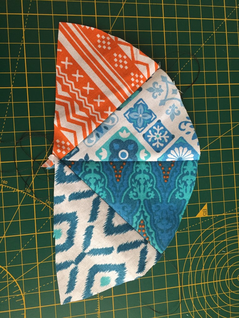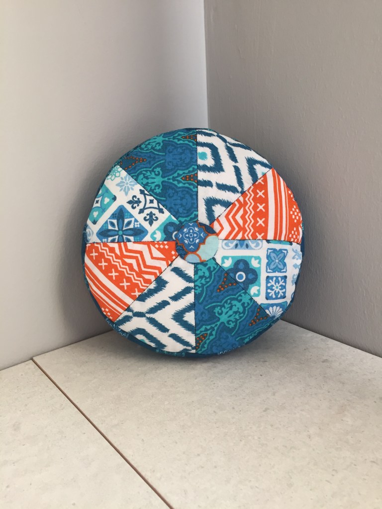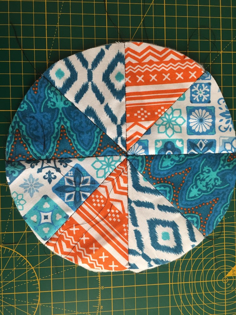 - Sew the pieces together: To make sewing together easier split the circle into four sections consisting of 2 fabric pieces, sew the two pieces together making quarters, then sew 2 quarters together to make a half then join the two halves together. Repeat this with the remaining 8 pieces to make the back.
