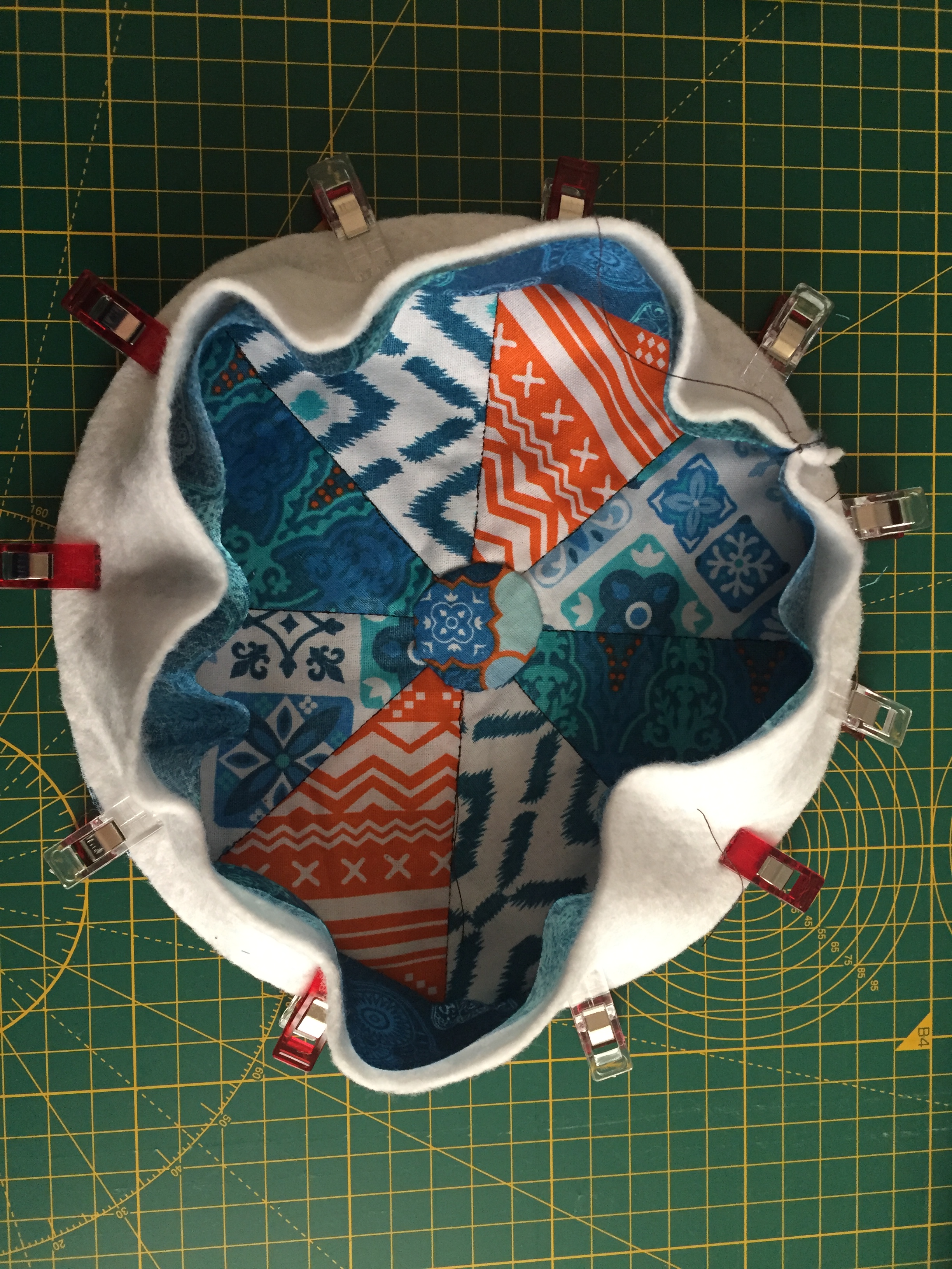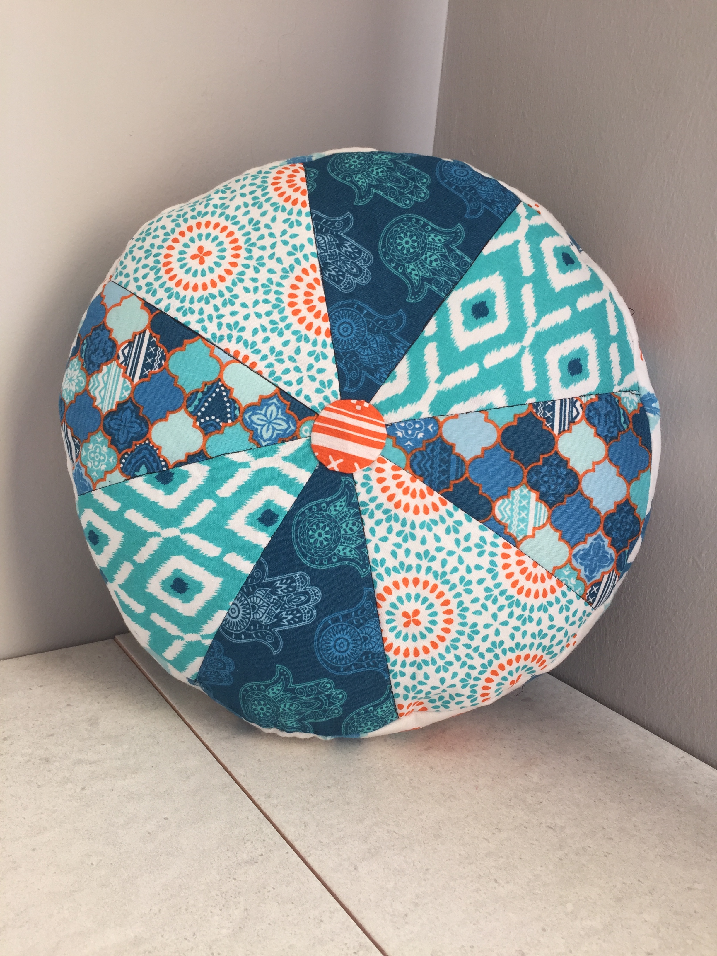 - Sew the pieces together: To make sewing together easier split the circle into four sections consisting of 2 fabric pieces, sew the two pieces together making quarters, then sew 2 quarters together to make a half then join the two halves together. Repeat this with the remaining 8 pieces to make the back.
