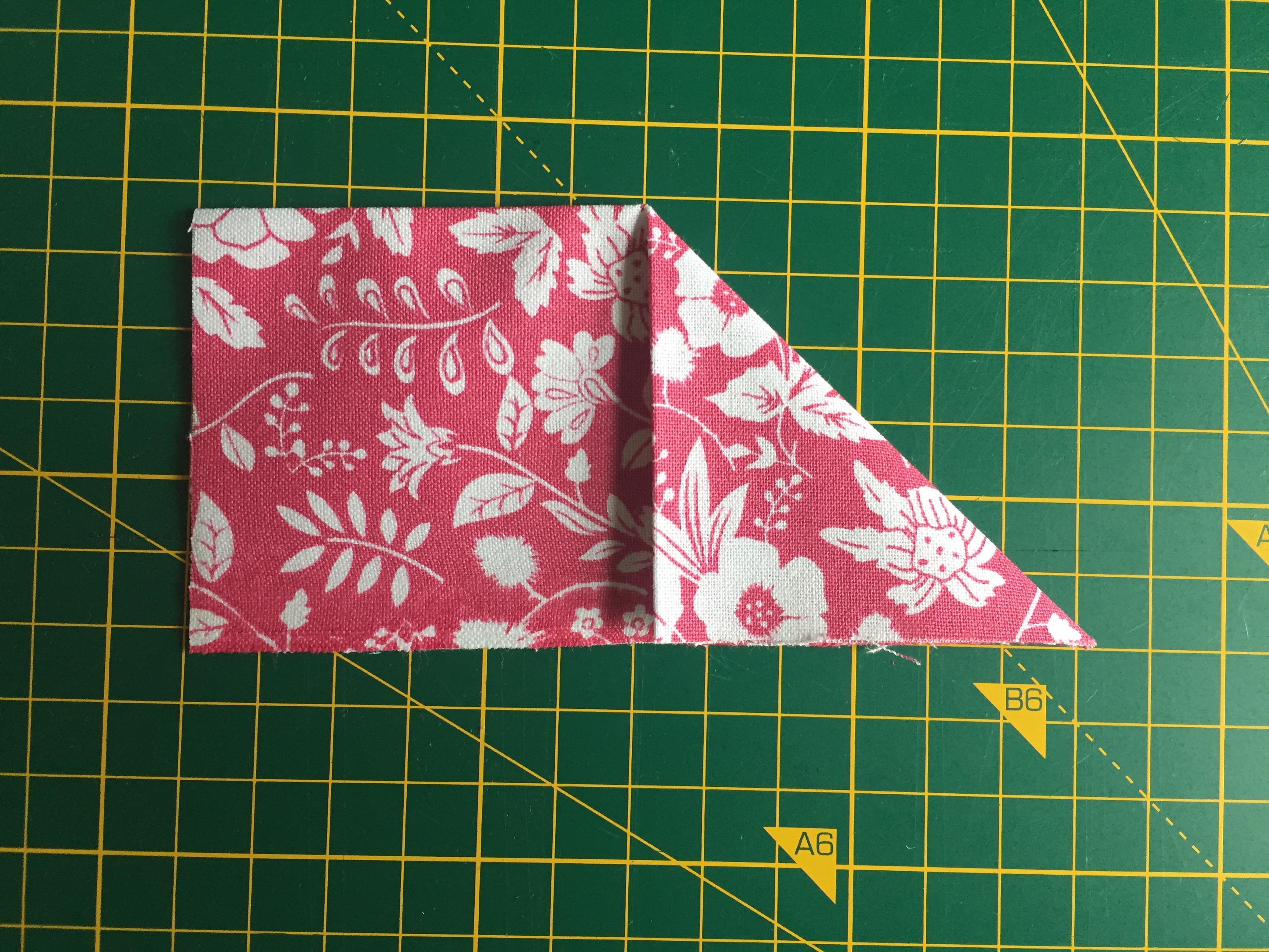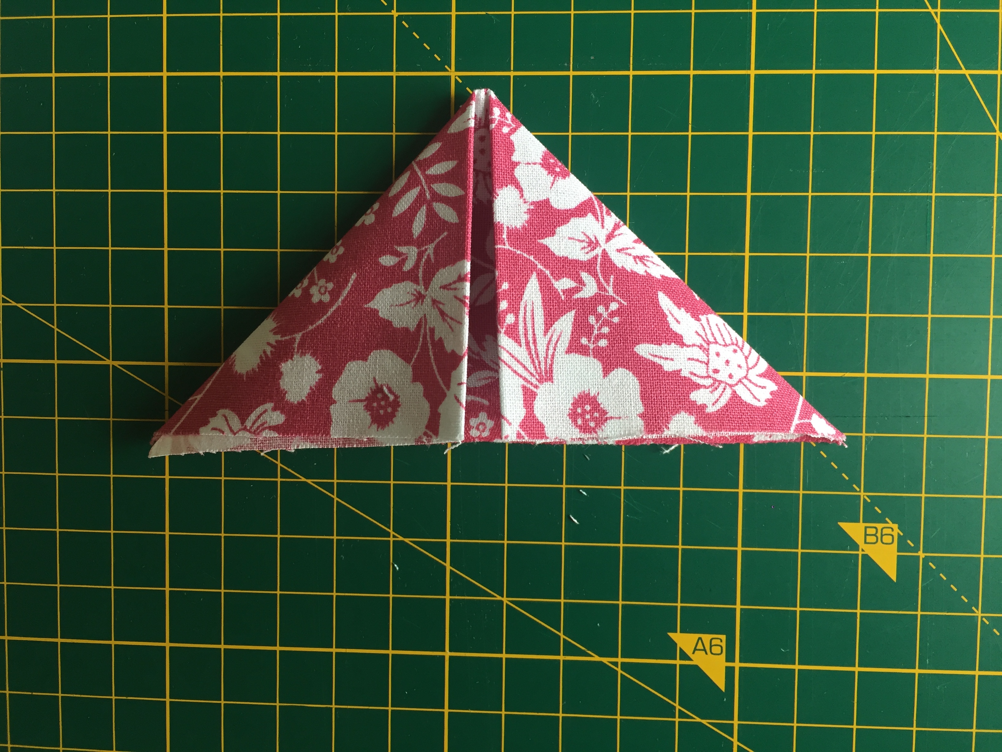 - To make the folded triangles fold a square in half and press, next fold in the top right hand corner of the folded edge to the middle of the bottom edge, and fold the top left corner of the folded edge to the middle of the bottom edge and press. Repeat for all the squares.