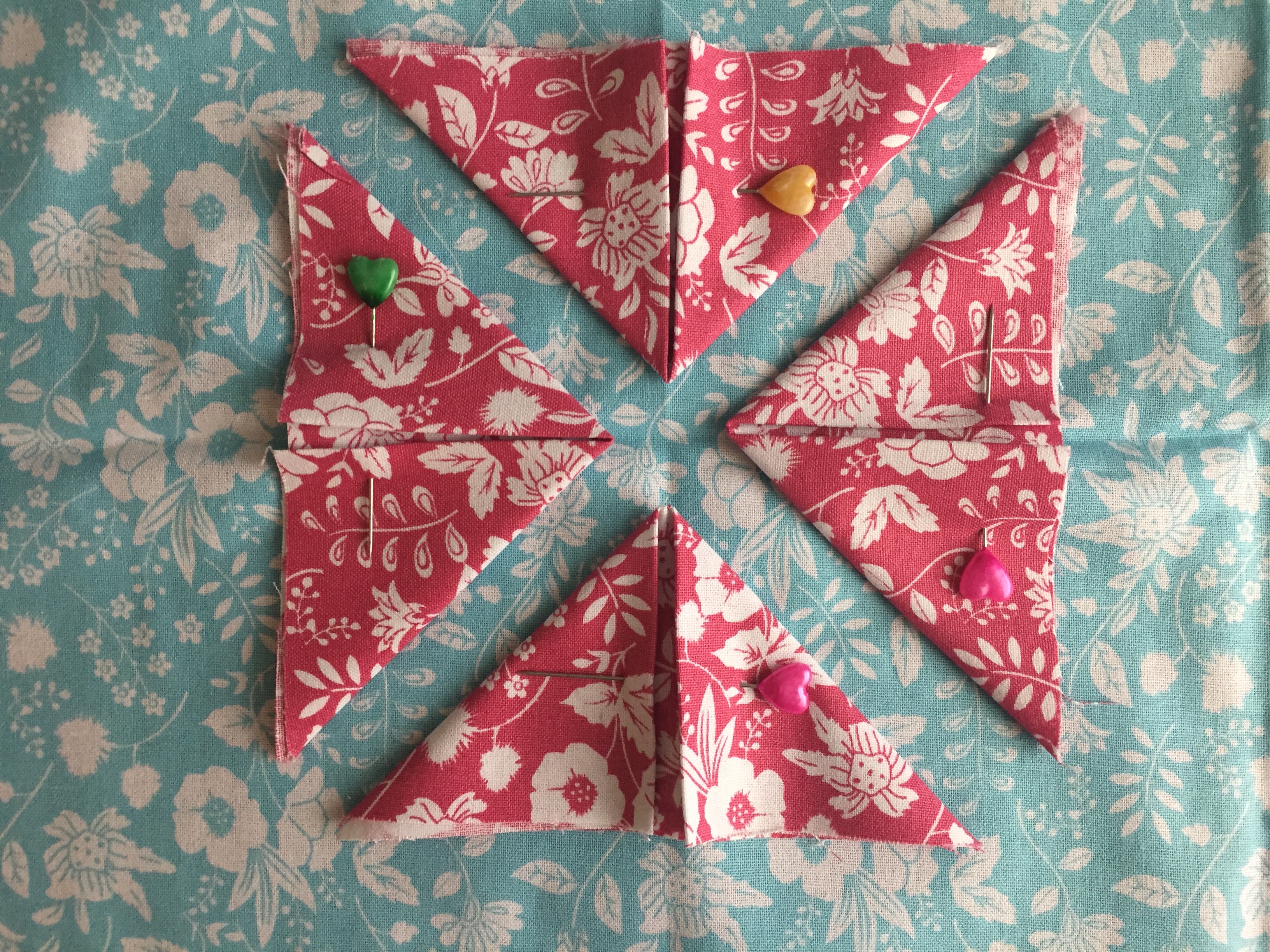 - Round 2: Take 4 of the blue with white and pink flower detail fabric triangles and place so they are positioned with their central line in the middle of the gaps left between the pink triangles and 2cm from the middle point of the fabric. Use a ruler to check they line up, then pin and sew into place.