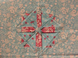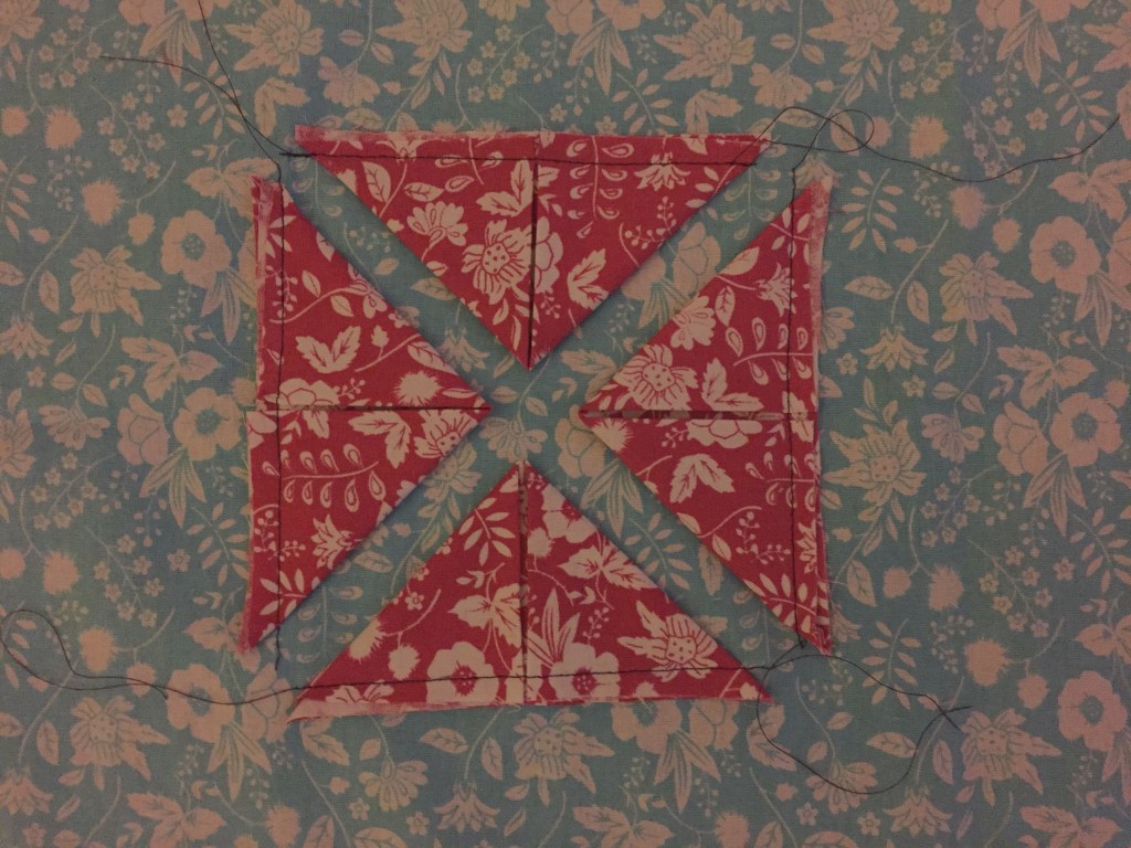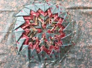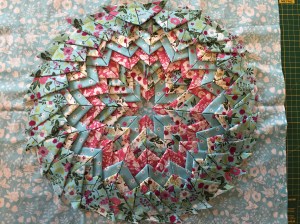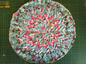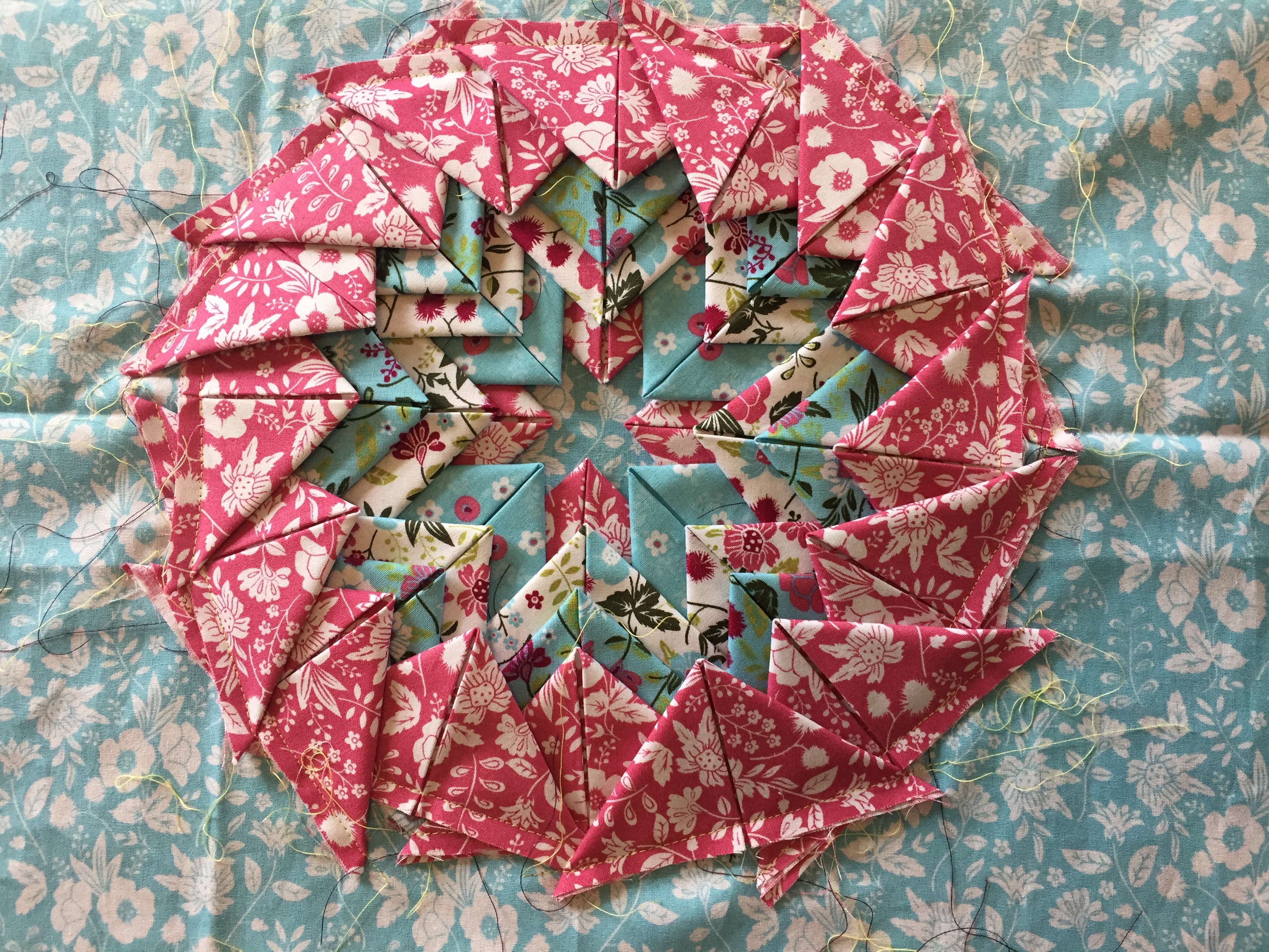 - Round 5: using 16 of the pink fabric triangles, placing them 2cm back from the points of the previous rounds triangles, and also placing them in the gaps between the previous rounds triangles, with the central line of the triangle in the gap between. Pin and sew to secure.