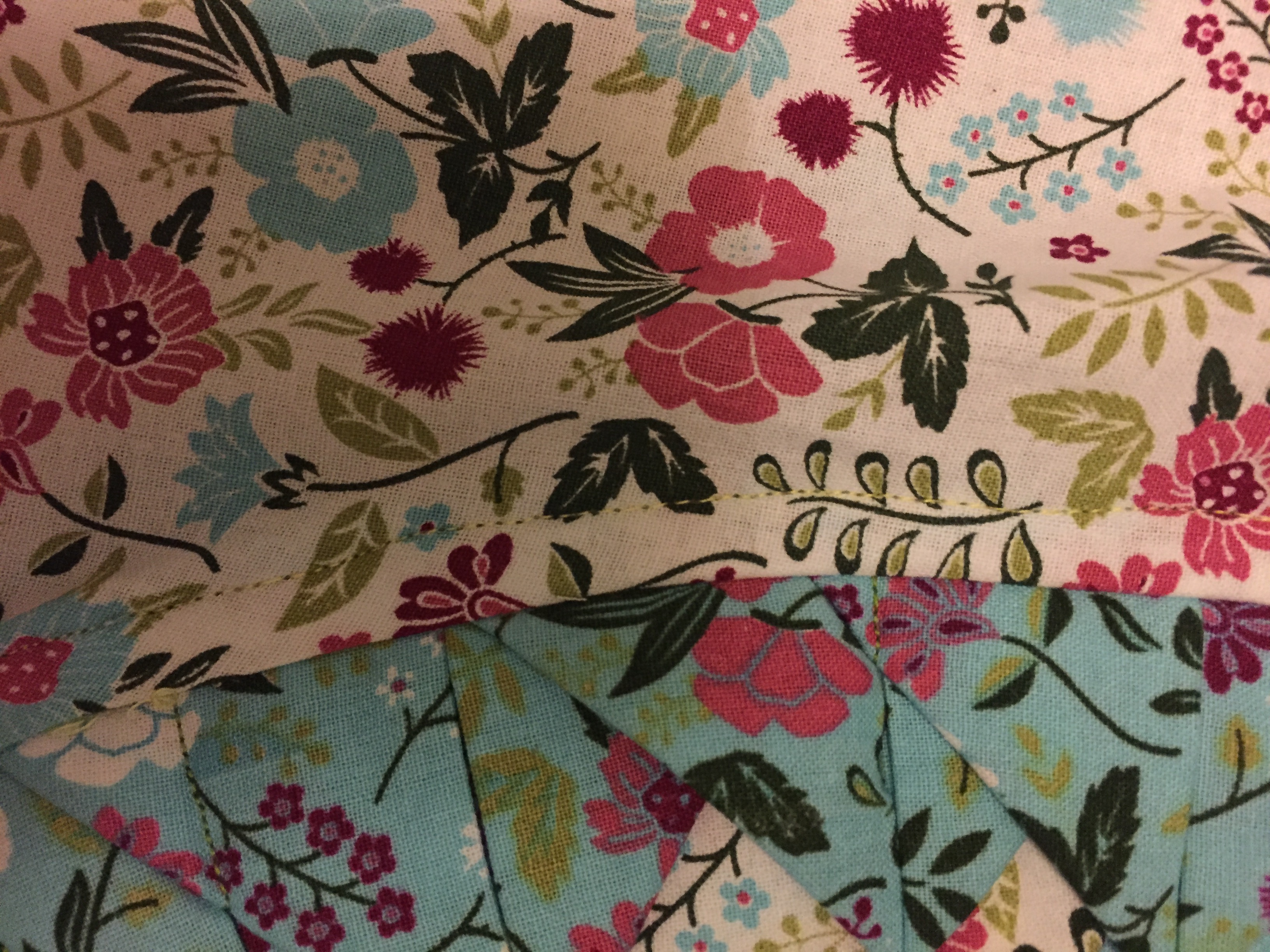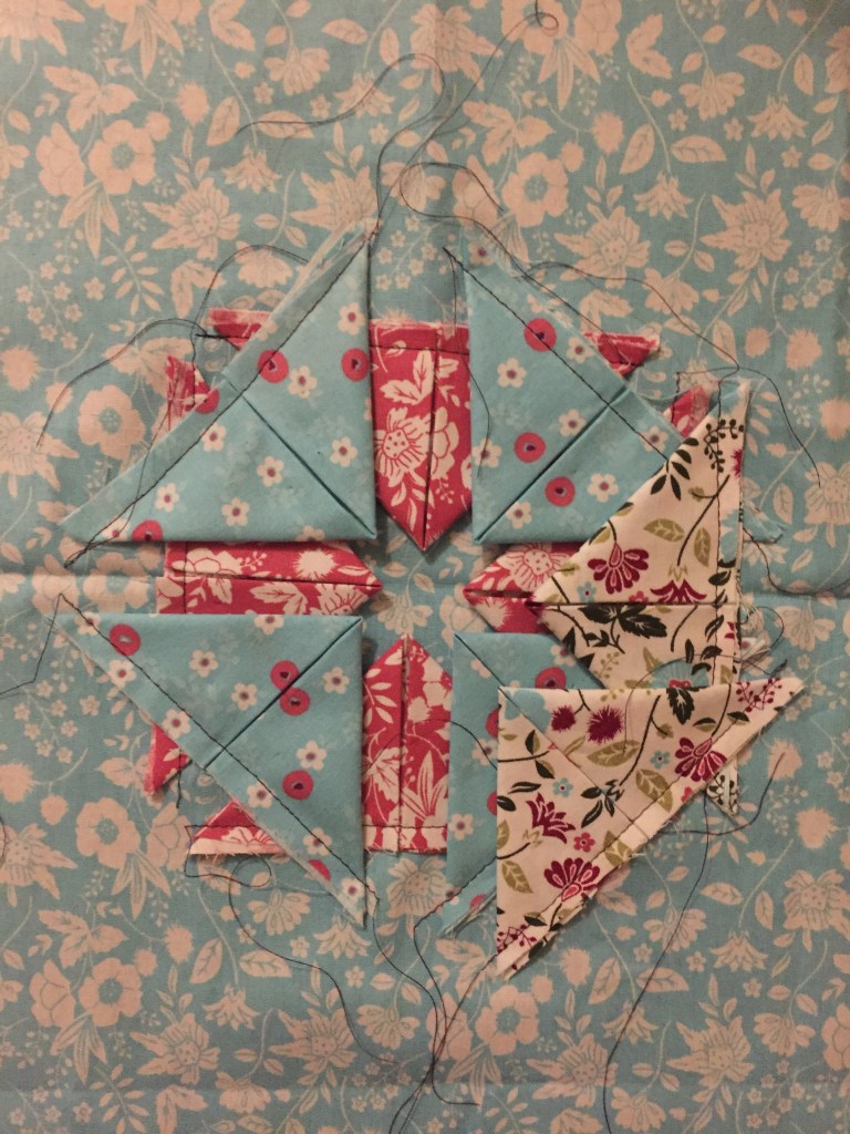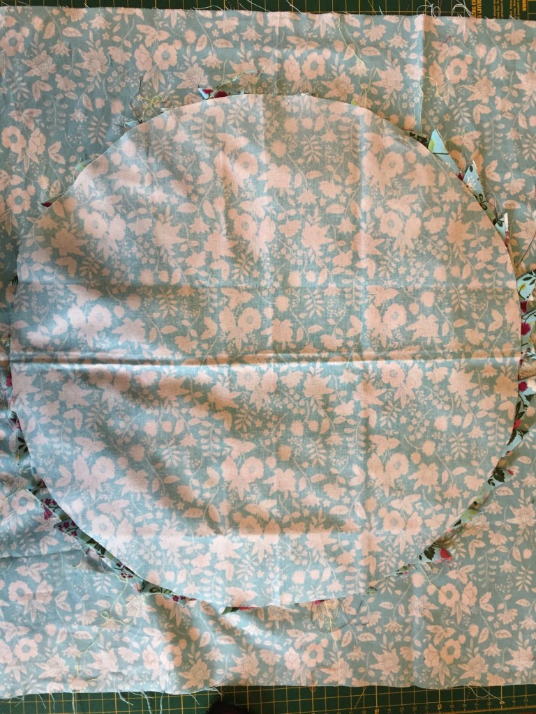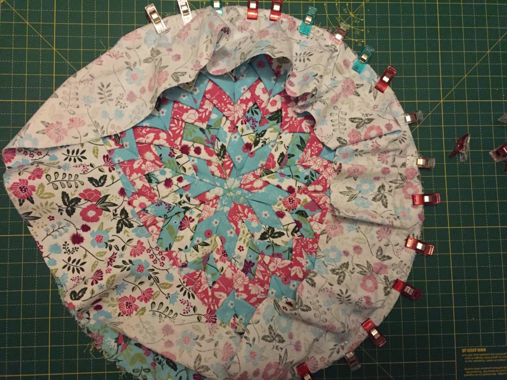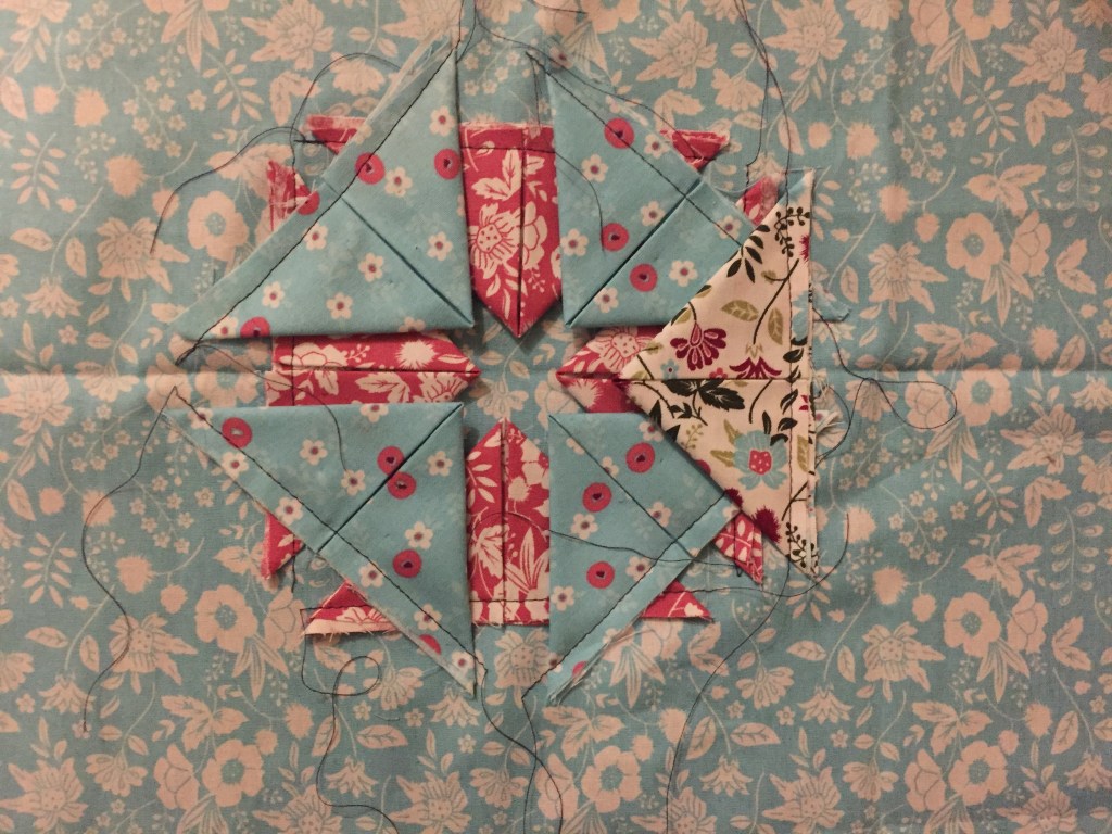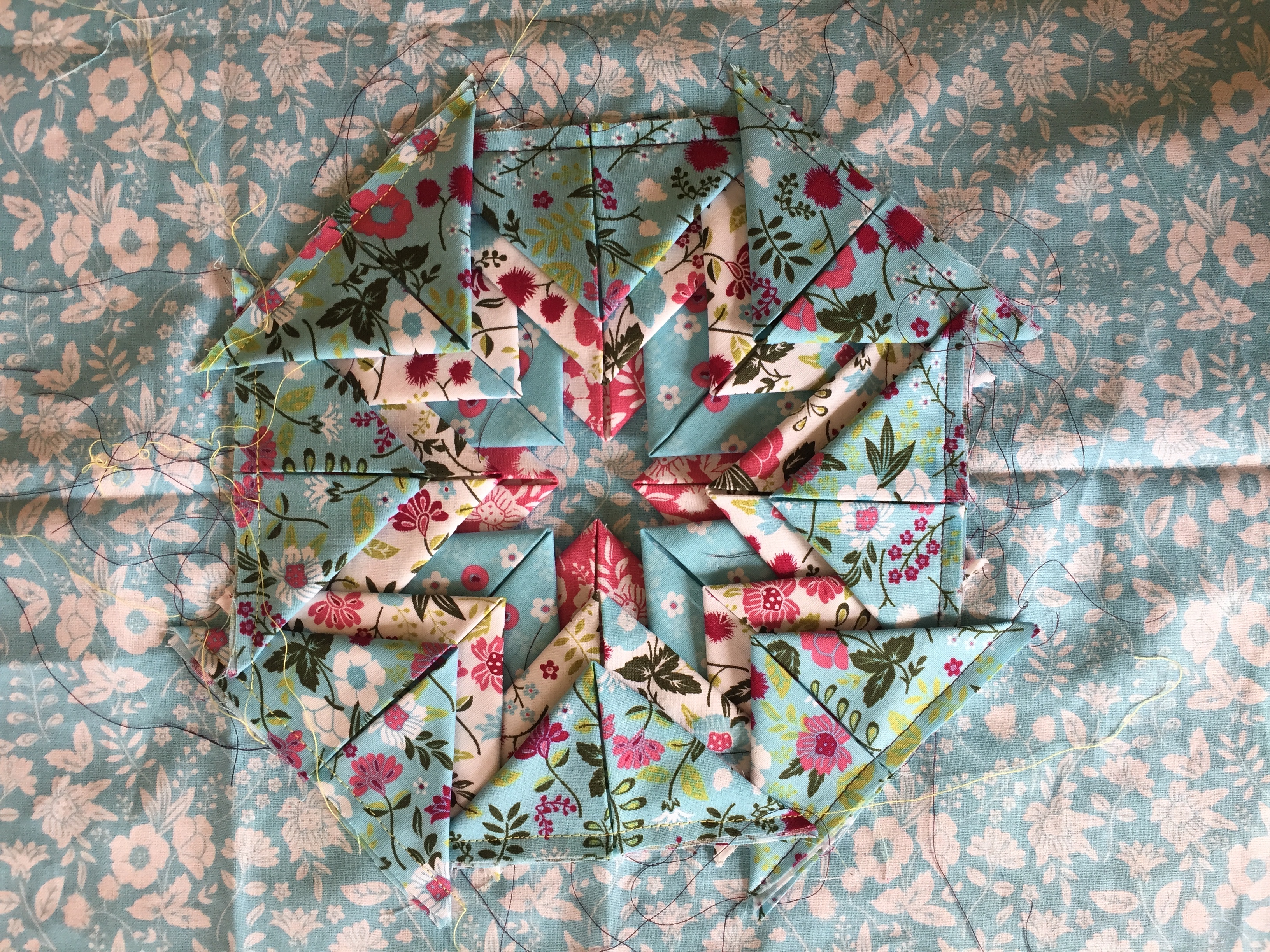 - Round 6: use 16 blue with white and pink flower fabric triangles, placing them 2cm back from the points of the previous rounds triangles. Pin and sew to secure.