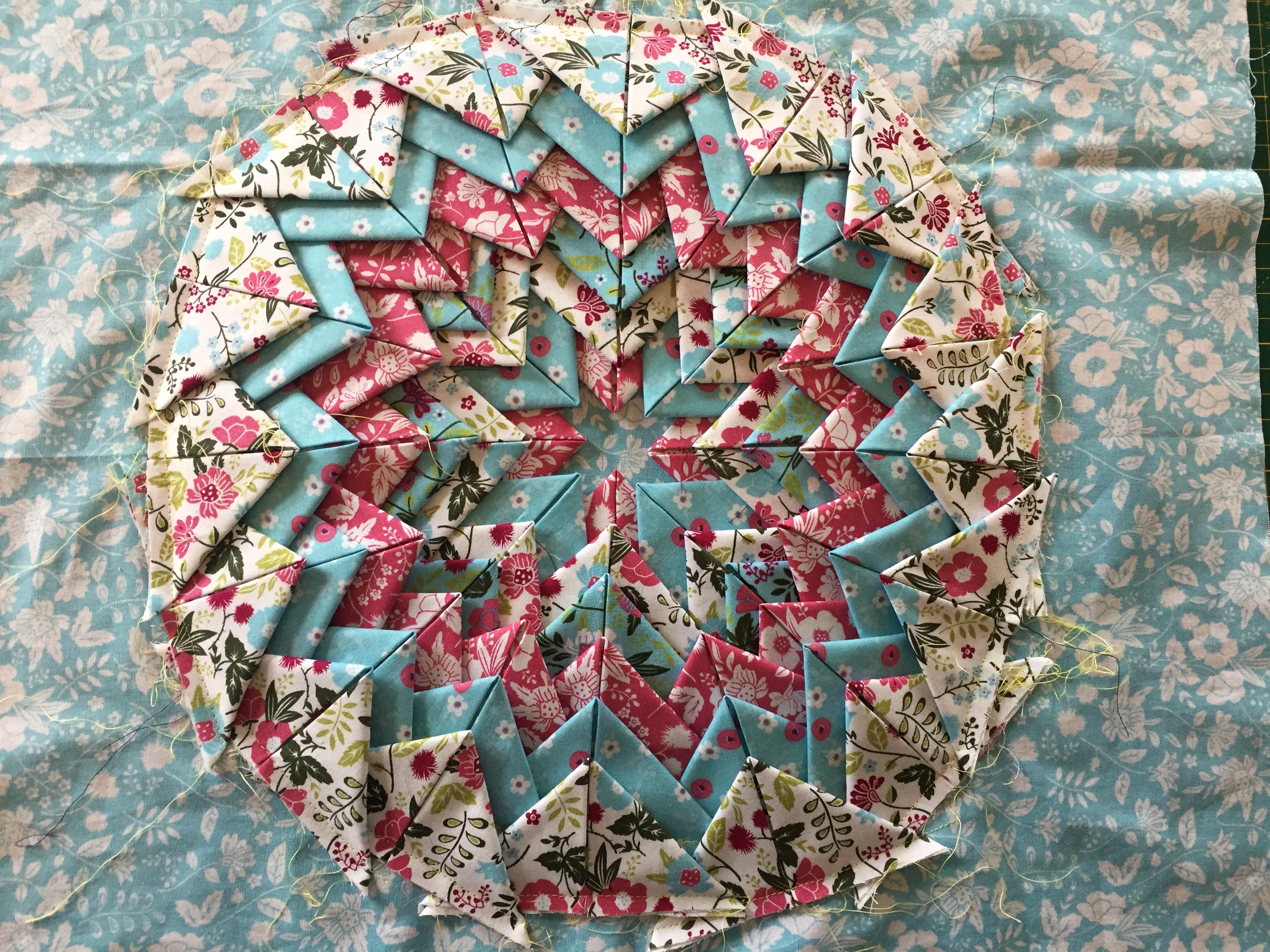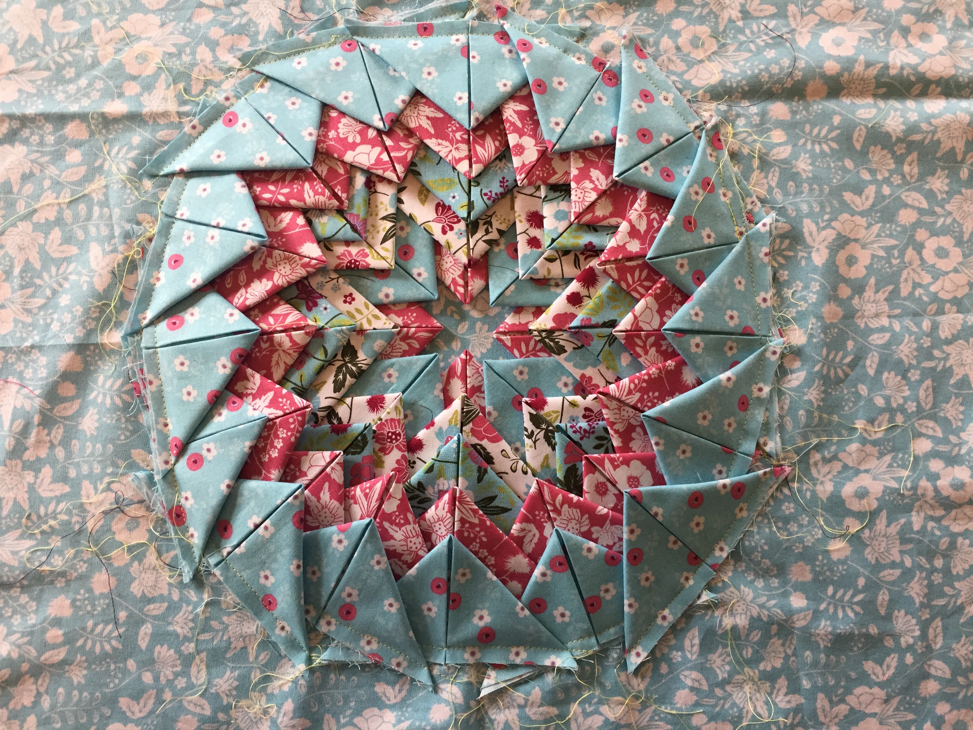 - Round 8: 32 blue with flower and leaves fabric triangles, placing them 2cm back from the points of the previous rounds triangles, and also placing them in the gaps between the previous rounds triangles, with the central line of the triangle in the gap between. Pin and sew to secure.