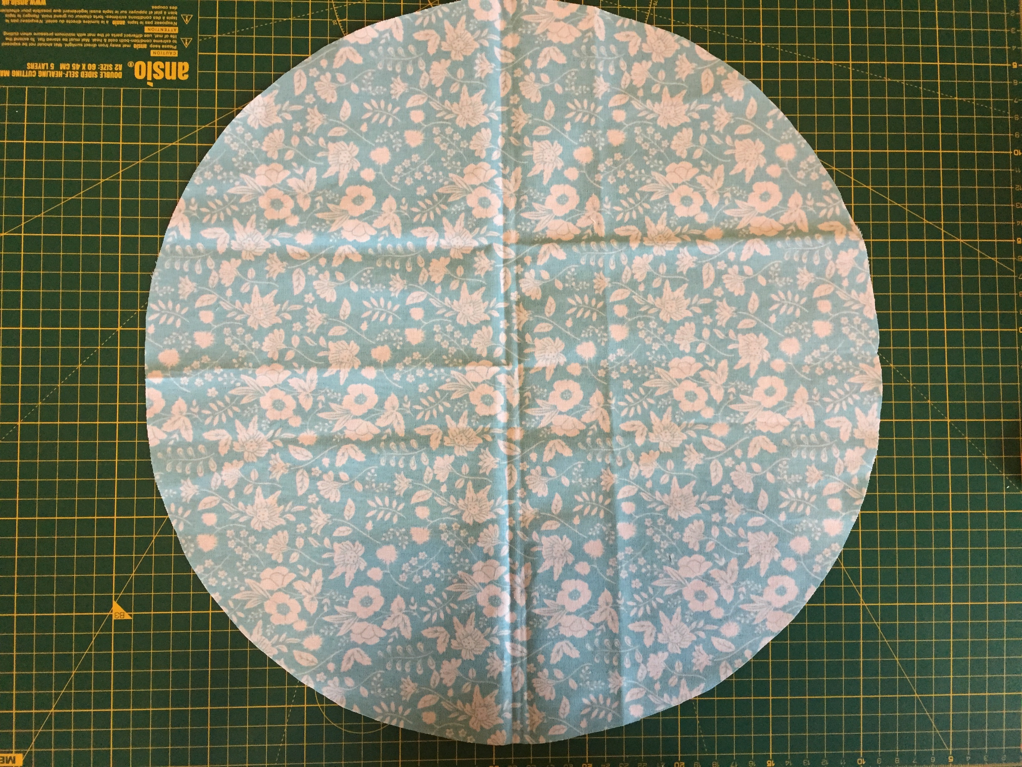 - Take the blue fabric with white flowers and cut a square of fabric 50x50cm, this forms the front. Fold the fabric in half and half again to making a quarter and press, this will leave lines showing the middle point of the fabric.