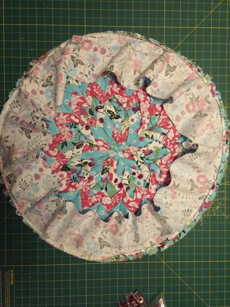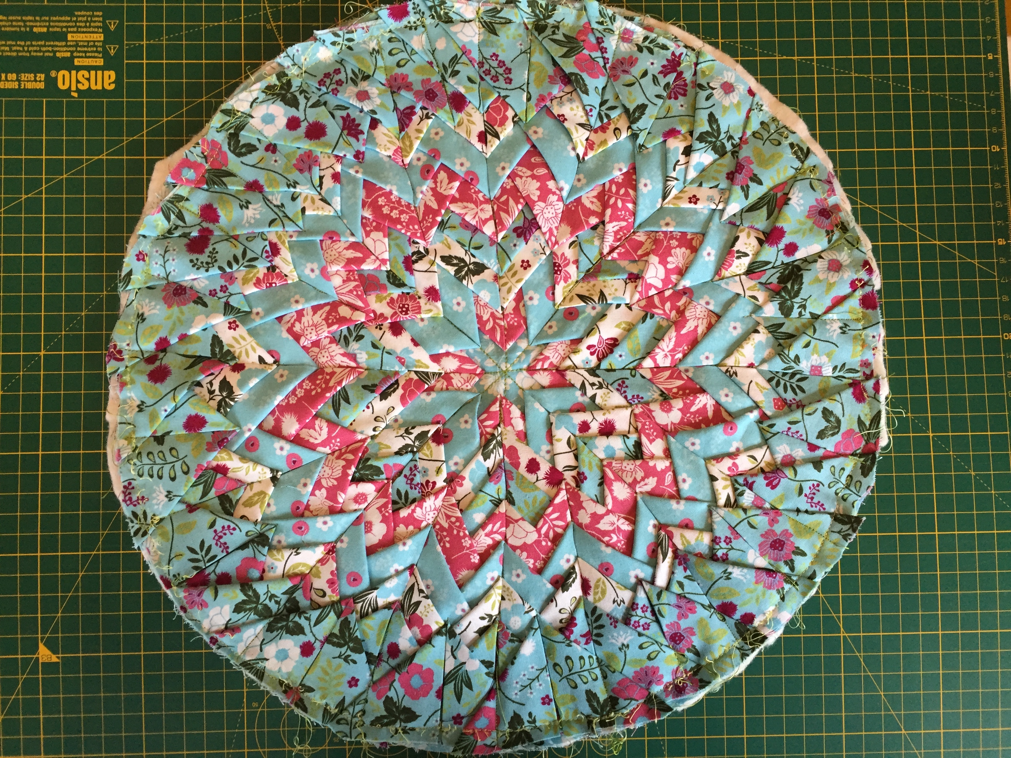 - Cut the excess square fabric away to leave you with a round. Cut a piece of batting the same size and add the quilted detail by sewing down the central line of the triangles.