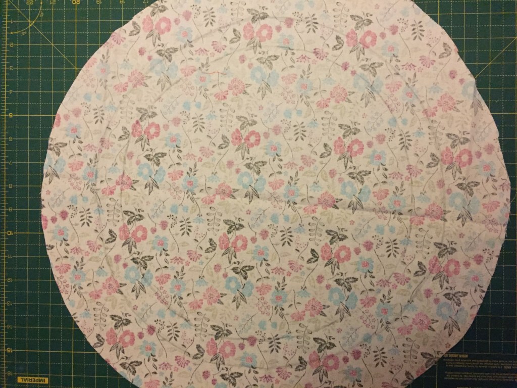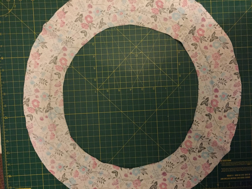 - Take the white with flower detail fabric and place the folded square front piece in the middle, draw around this front piece. Next draw a circle around which is 6 cm bigger than the front piece along with a circle which is 3cm smaller than the front piece and cut out to give you a circular band.